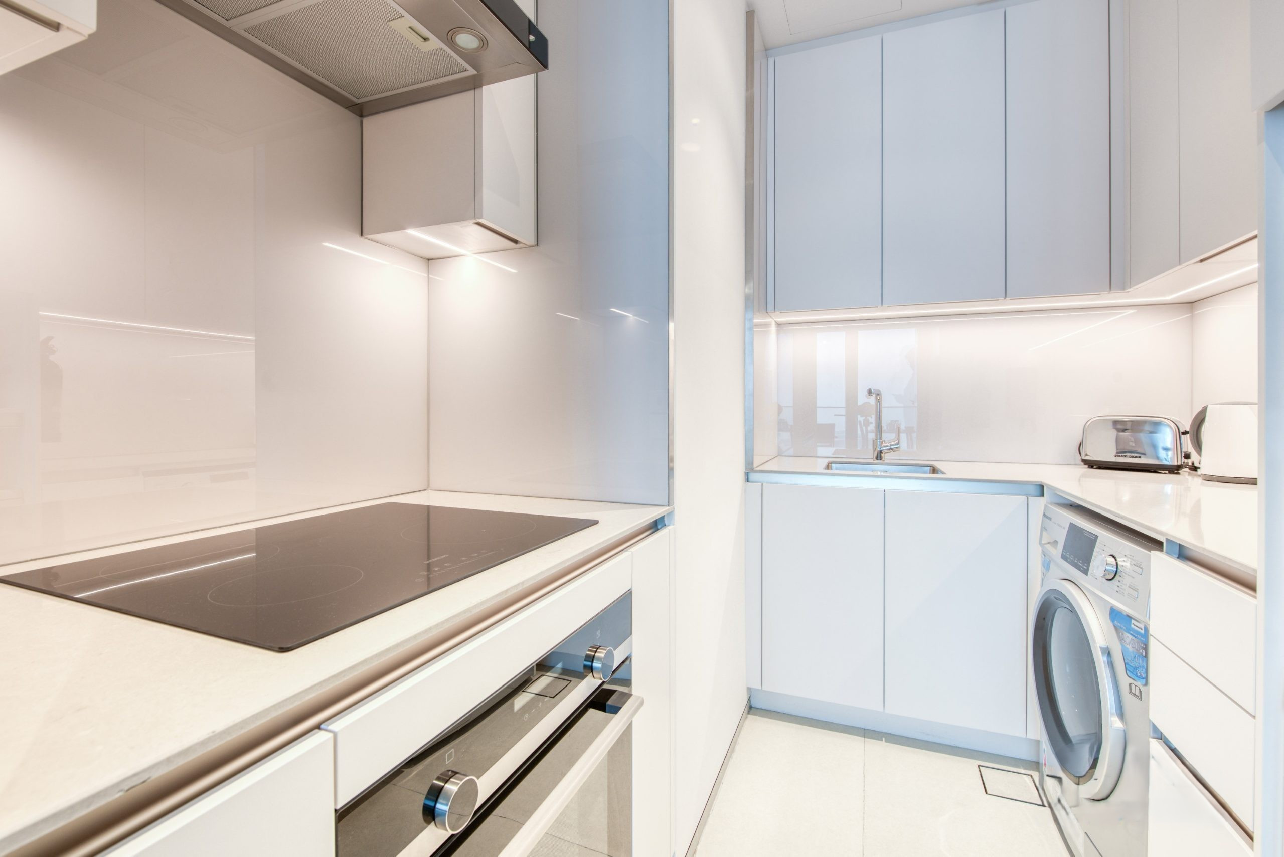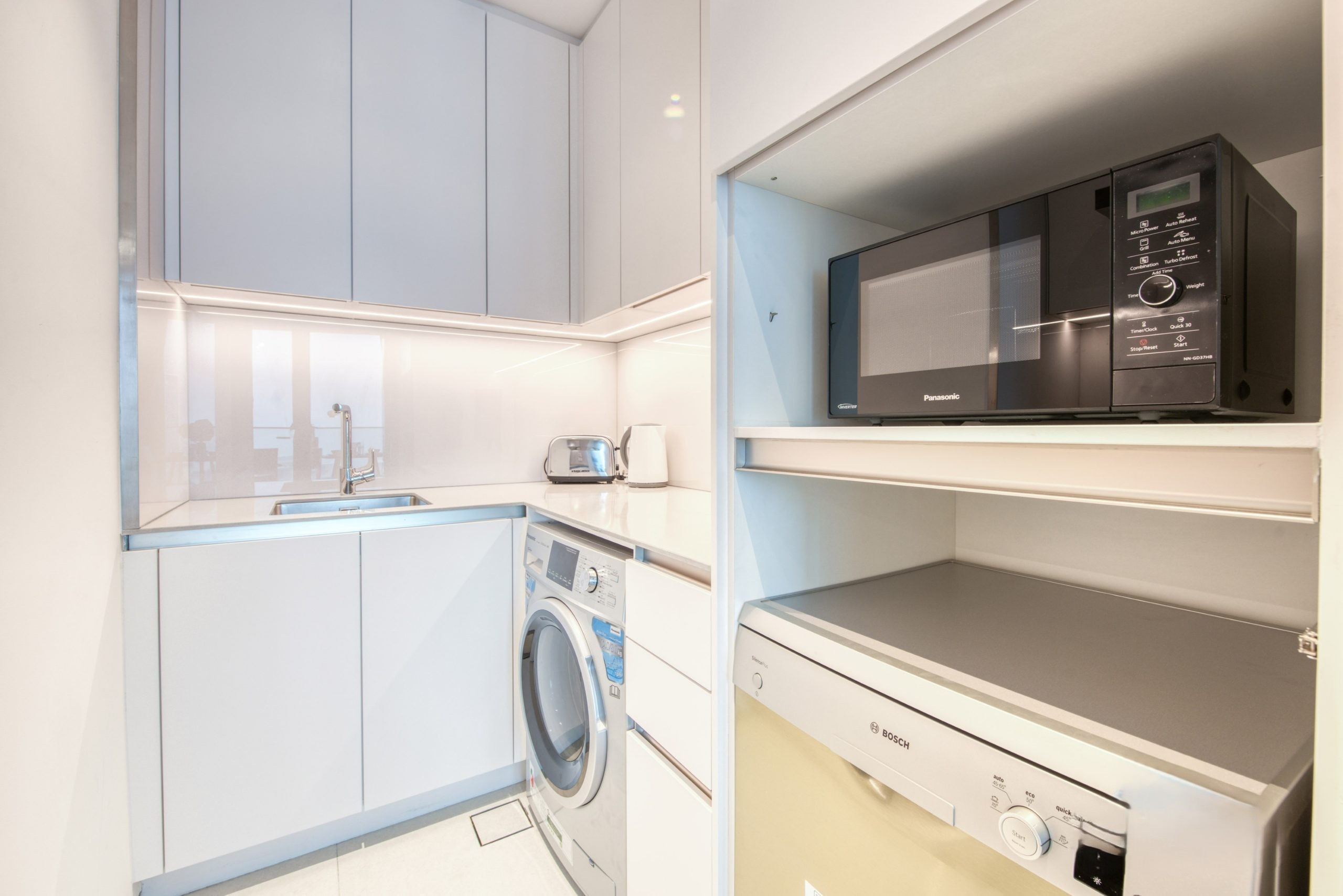 The living room is bright and welcoming, with large windows that frame stunning views of the Marina. Whether you want to catch up on your favorite Netflix series or just sit back and enjoy the view, this is the spot. The kitchen is stocked with all the basics for cooking, and when you’re done, cleaning up is easy with the dishwasher. There’s also a washing machine and fast Wi-Fi to keep things simple.