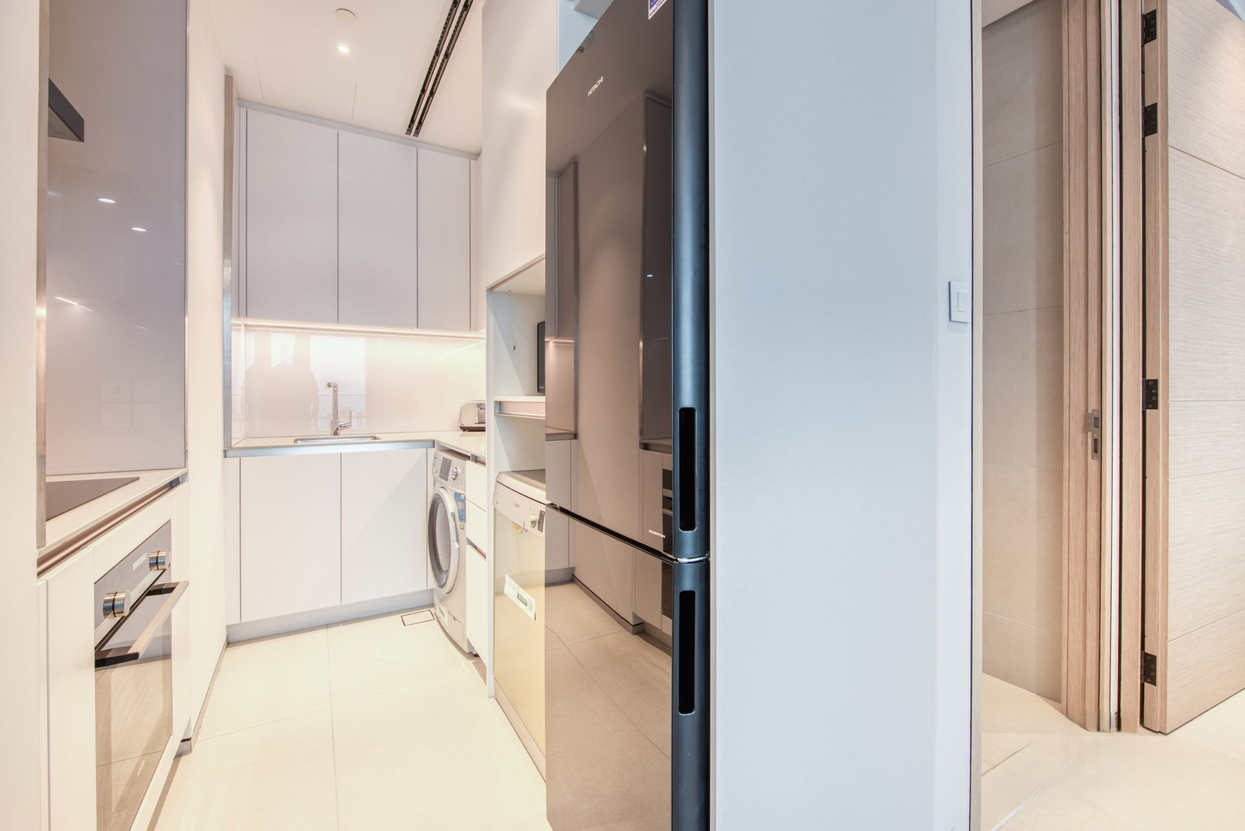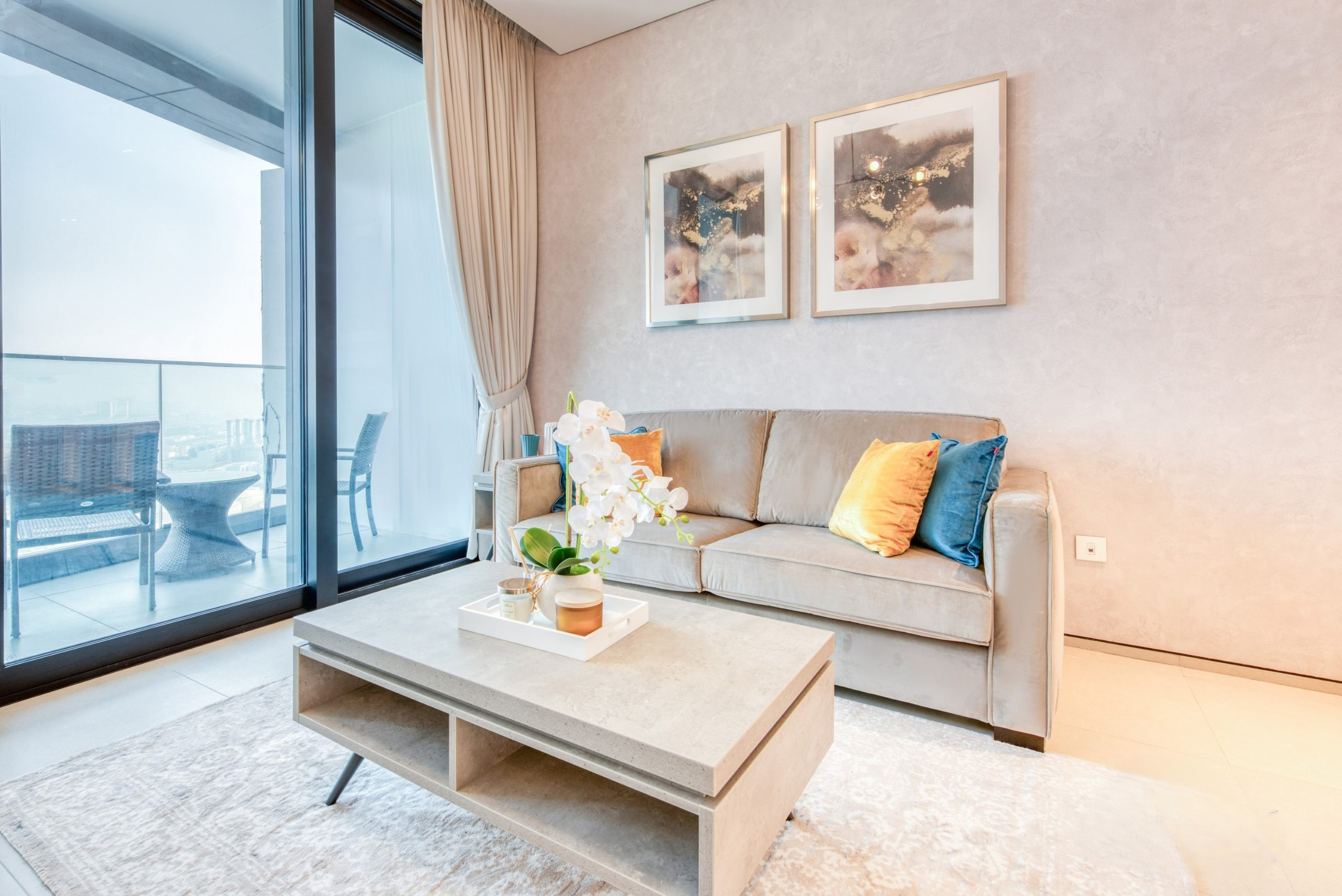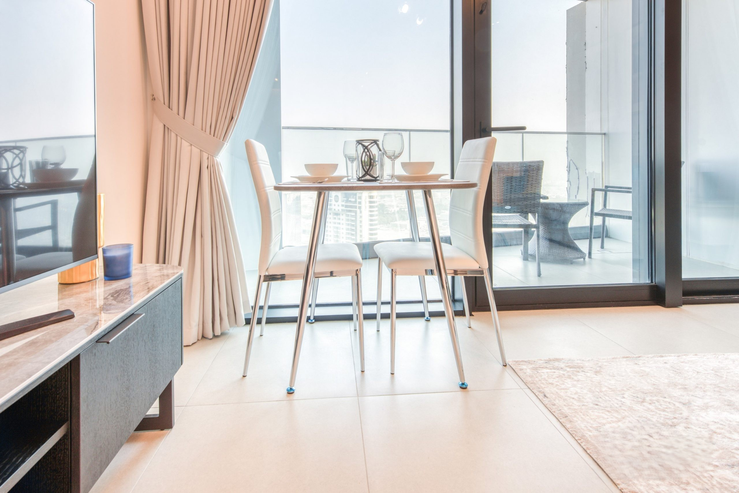 The living area features a plush sofa set and a large Smart TV for your entertainment. Flooded with natural light from floor-to-ceiling windows, the space flows seamlessly into a private balcony furnished with two outdoor chairs and a coffee table, making it the perfect spot to enjoy the dramatic urban and water views. For your dining needs, a sleek table with two high-back seats is provided, alongside a fully-equipped kitchen containing high-end appliances and a large refrigerator. To ensure a seamless stay, the unit also includes an integrated washing machine and high-speed WiFi throughout the property.