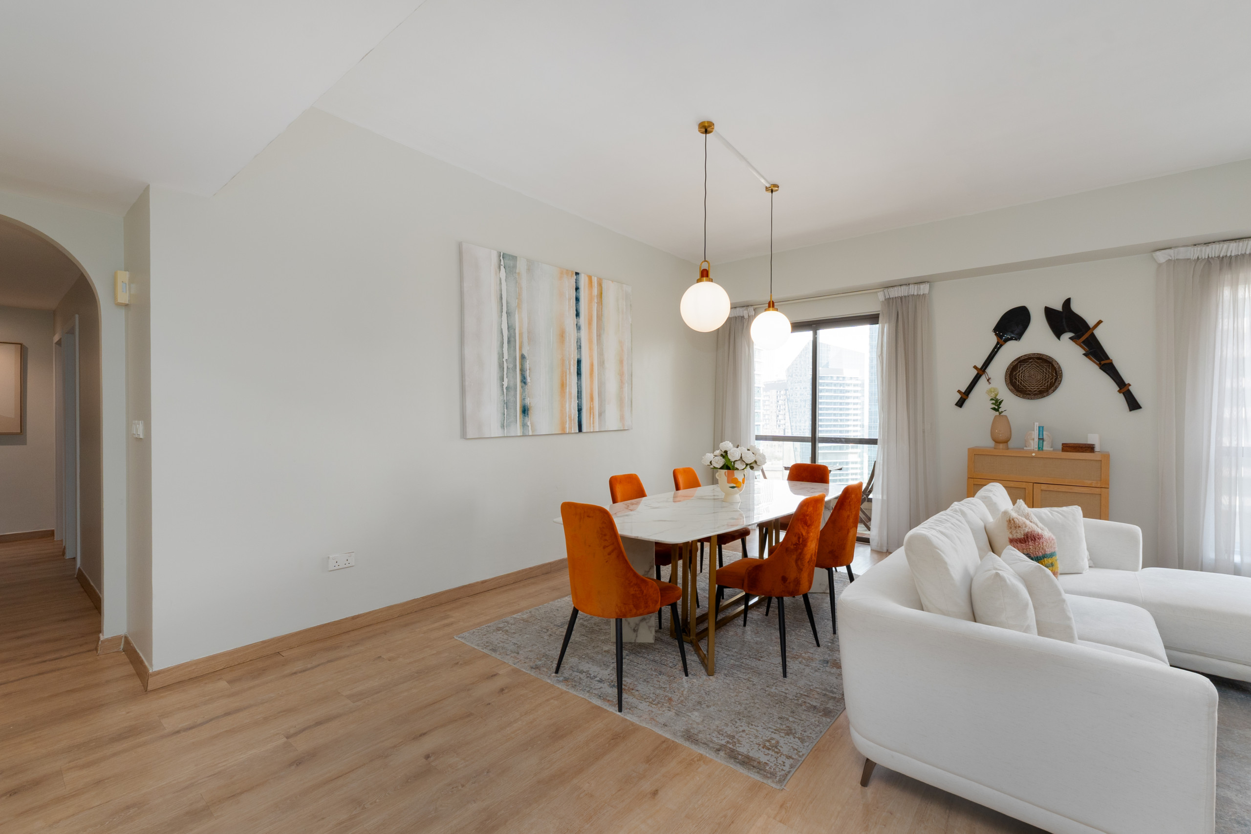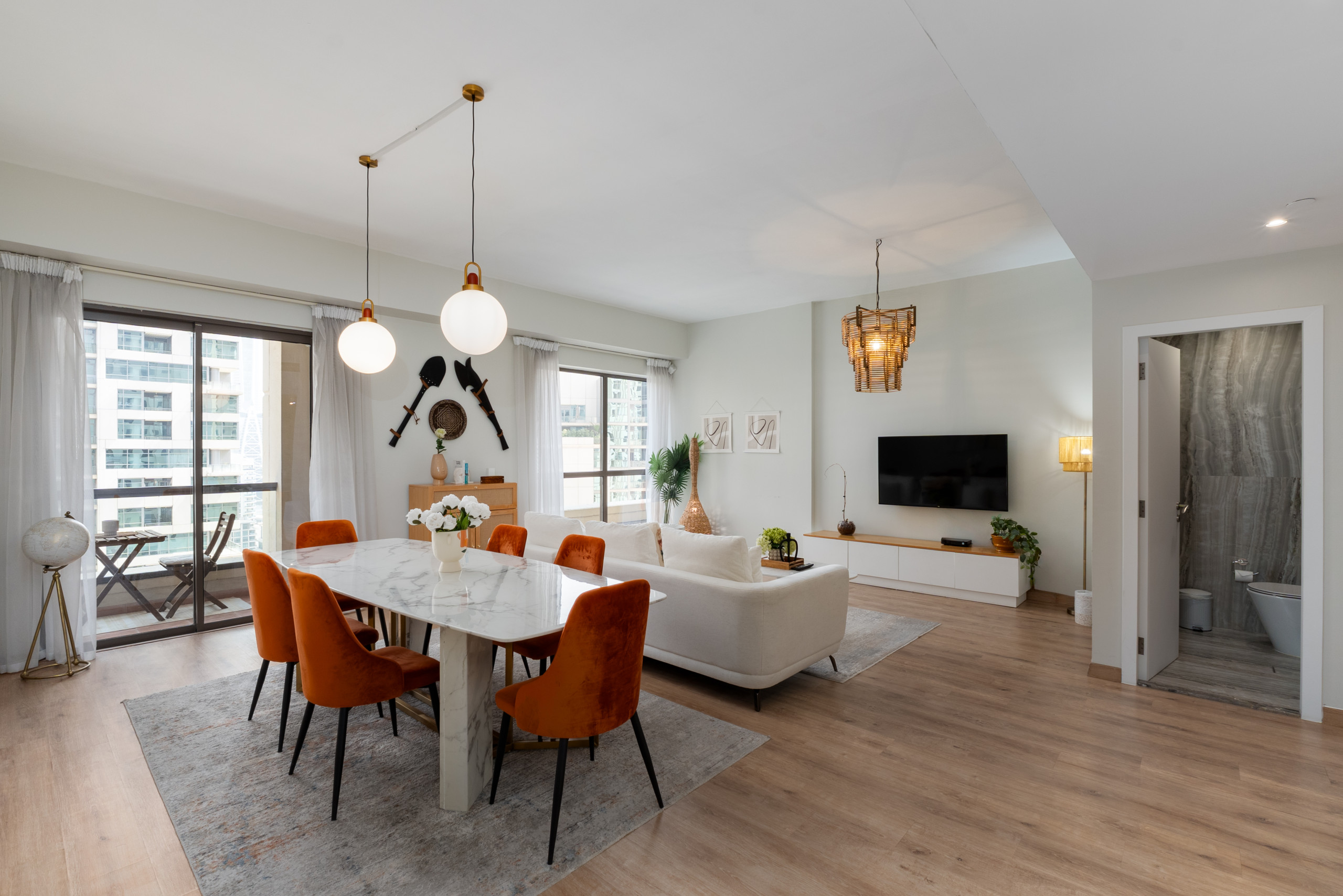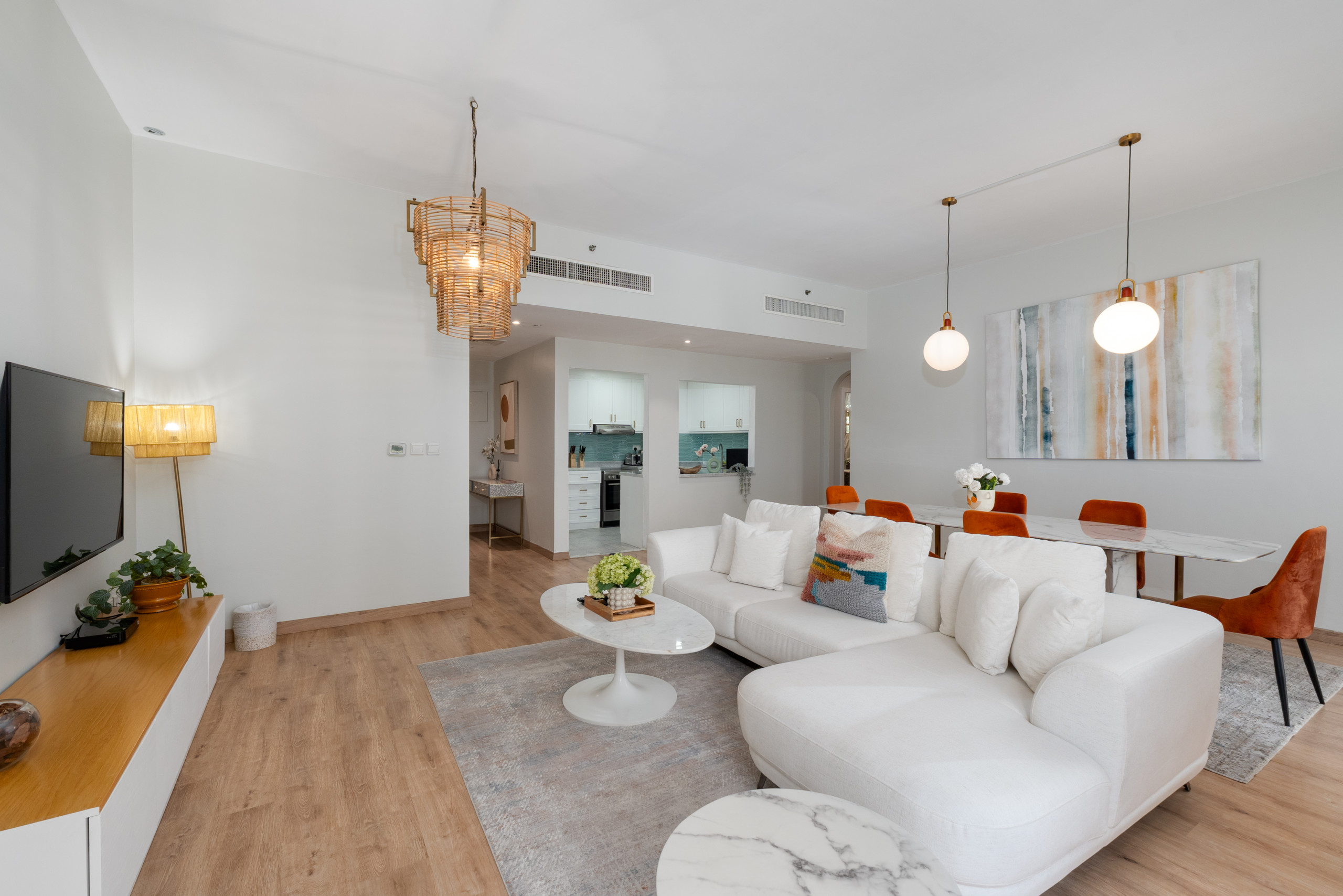 This apartment has its own vibe. The bold wall art makes a statement, while the bright throw pillows bring in a playful pop of color. The woven lights and cozy rug give off a laid-back, boho feel that makes the space feel like home. You’ve got a comfy sofa perfect for movie nights, and the dining table does double duty if you need to get some work done. The kitchen is ready for whatever meals you’re in the mood for, and the washing machine handles the laundry. Plus, reliable WiFi keeps you connected, whether you’re working or relaxing.