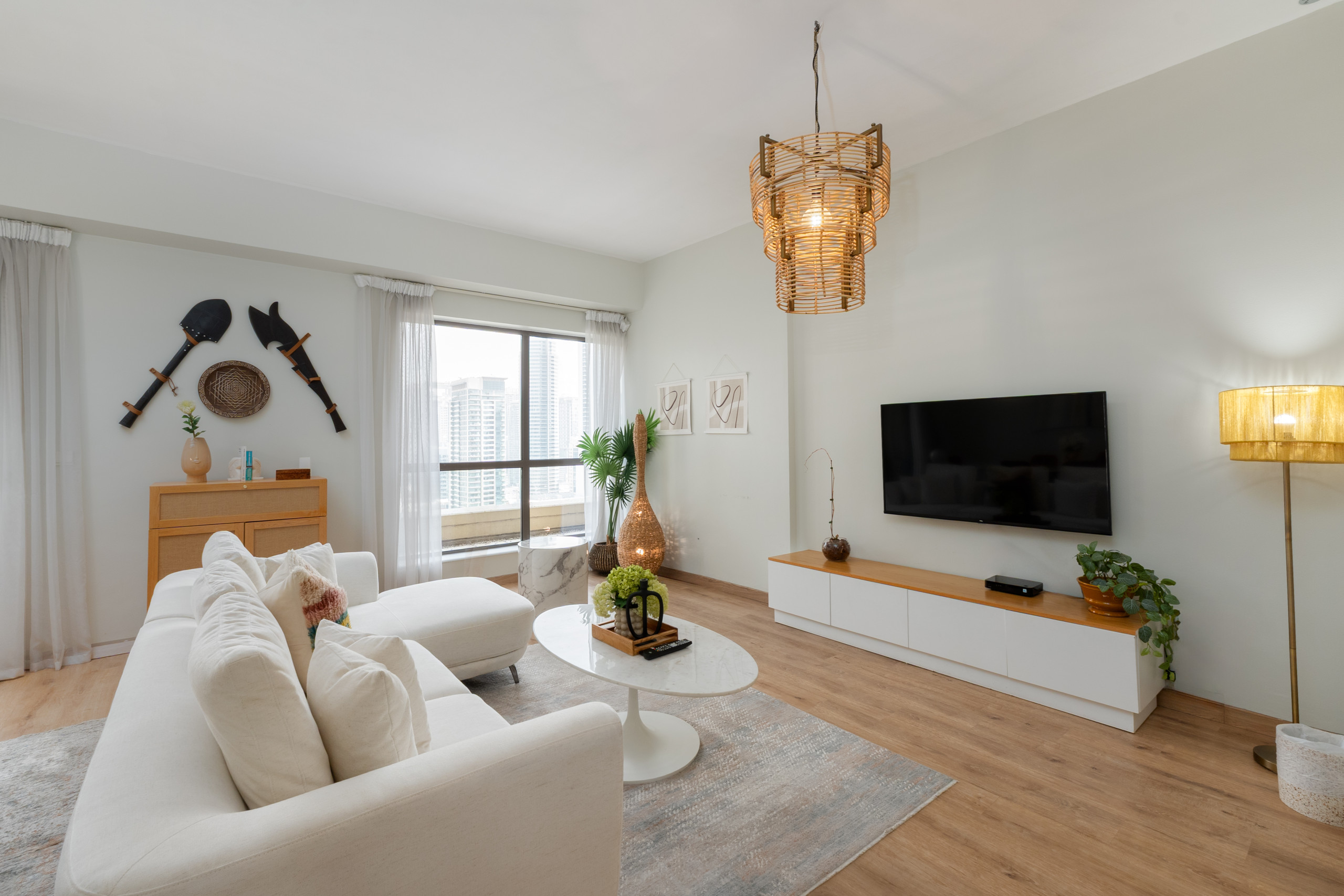 With its modern, minimalist design and a hint of Scandinavian charm, this living space is made for comfort. Stretch out on the rounded sofa, enjoy the view, or binge your favorite show on TV. Hungry? Skip the delivery apps and use the kitchen - it’s stocked with all the essentials for meal prep, from cookware to appliances. The dining area is perfectly set for you to enjoy your creations, complete with all the tableware you need. And when you’re done, let the dishwasher handle the mess. Laundry’s no problem either, thanks to the washing machine. High-speed WiFi keeps you connected, making this a serene yet practical retreat for your travels.