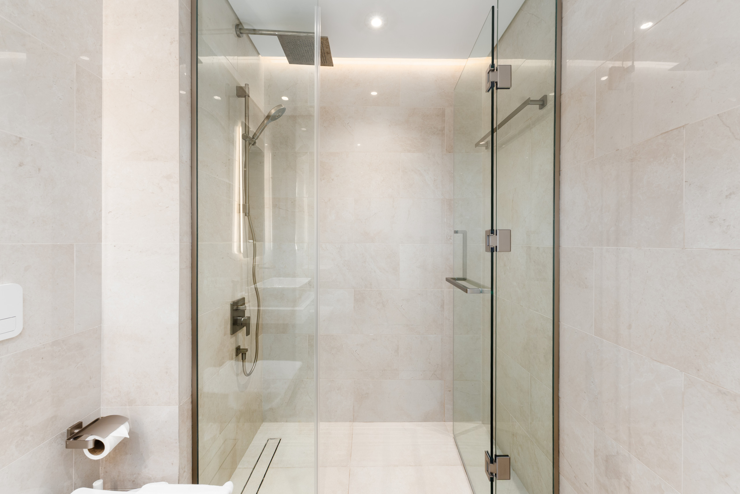 The bedroom serves as a serene sanctuary, featuring a king-sized bed with premium linens for a restful night's sleep. Floor-to-ceiling wardrobes provide ample storage, while a dedicated vanity area adds functional elegance to the space. Though the modern bathroom is not ensuite, it is privately located inside the unit just steps from the bedroom, complete with a spacious walk-in rainfall shower and high-end finishes.