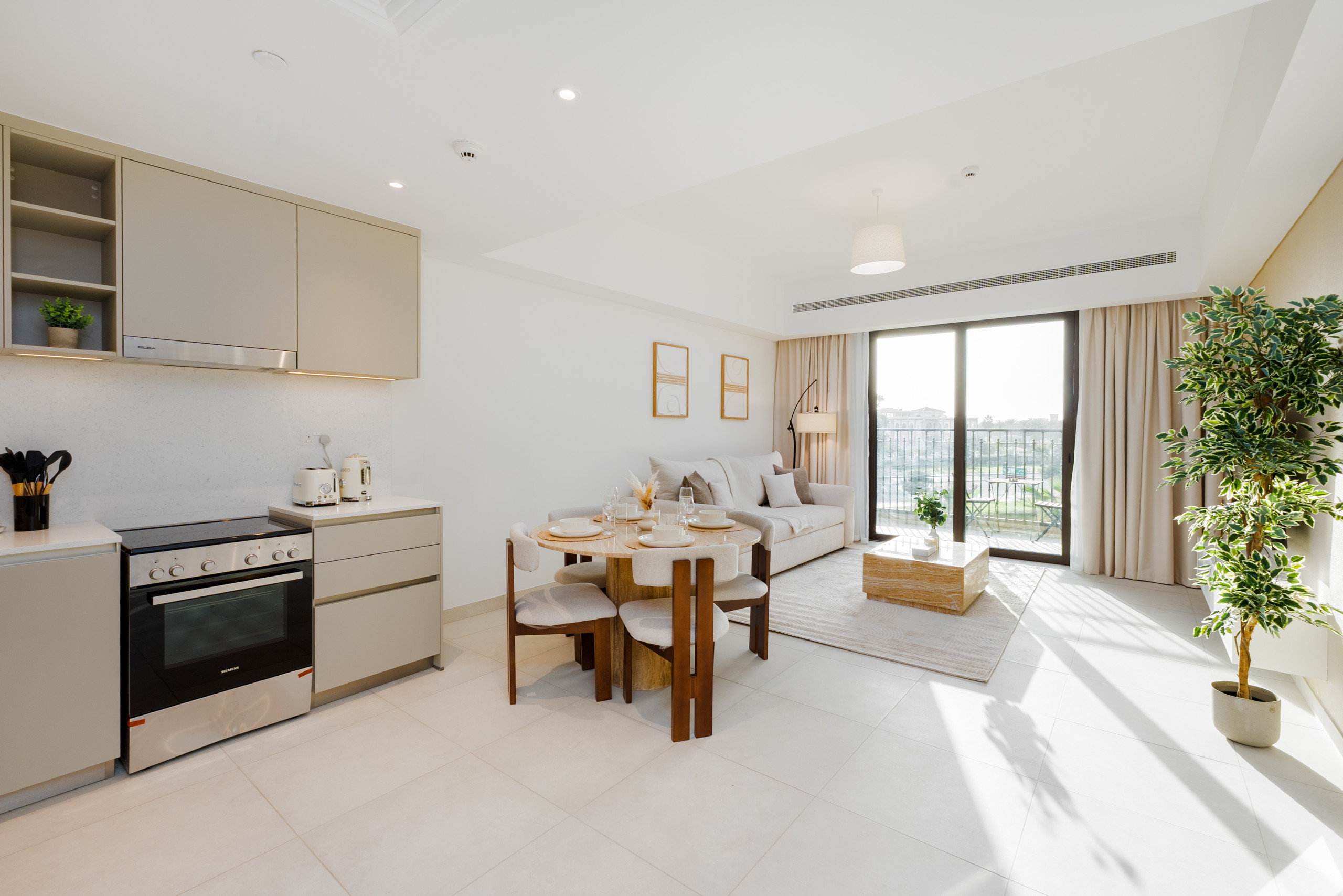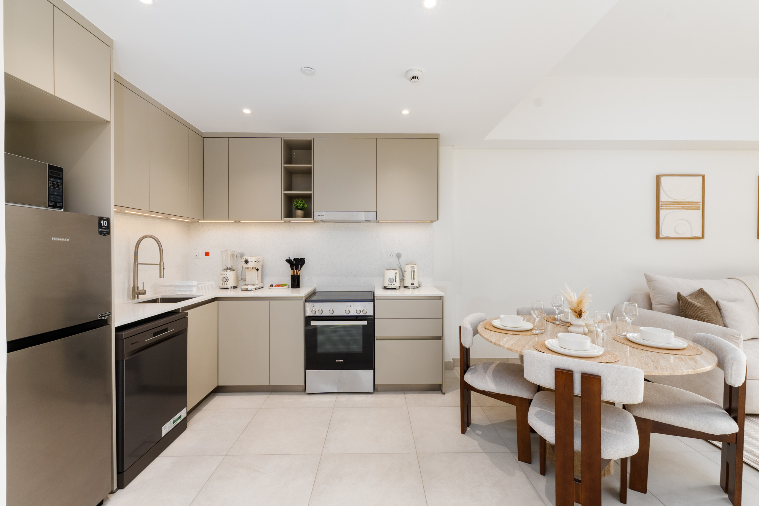 The stylish living space centers around a comfortable plush couch and a 65" TV for ultimate movie nights, flowing seamlessly onto a private balcony for quiet morning coffees. The open-plan layout includes a chic four-seater dining area and a fully-equipped kitchen complete with a dishwasher, coffee maker and premium appliances. For added convenience, the sun-drenched interiors feature an in-unit washing machine and high-speed Wi-Fi, ensuring a seamless stay.