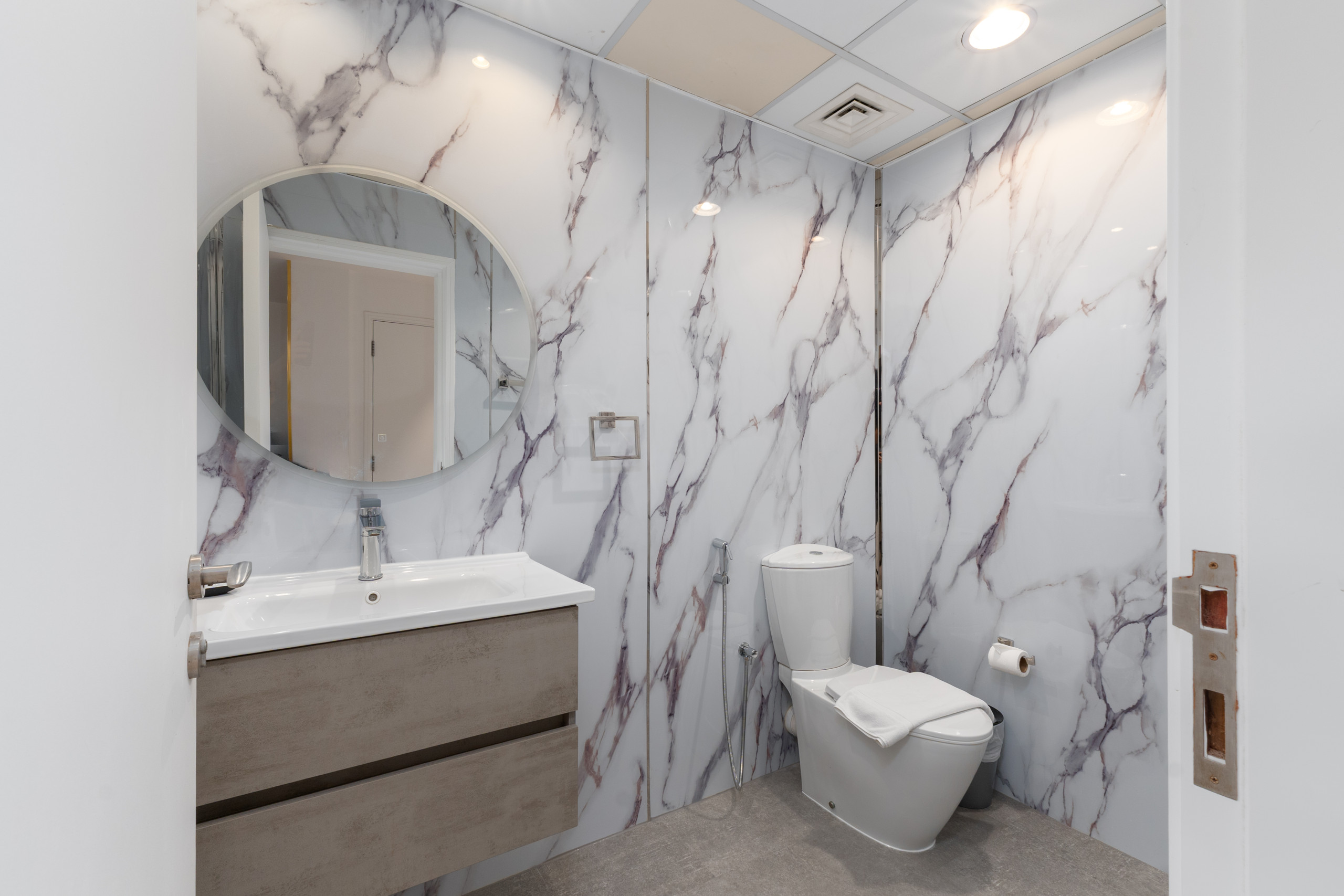 The living area centers around a chic curved sofa and a designer arc lamp, creating a polished space for relaxation. Floor-to-ceiling glass doors open onto an expansive private balcony with outdoor seating, where you can enjoy panoramic views of the Dubai Canal and the city skyline. The kitchen is fully equipped with high-end appliances and features a sleek island counter paired with two modern bar stools for casual dining. Adjacent to the kitchen is an elegant dining area featuring a circular marble table and signature wishbone chairs. For a seamless stay, the apartment is also outfitted with an integrated washer-dryer and high-speed WiFi.