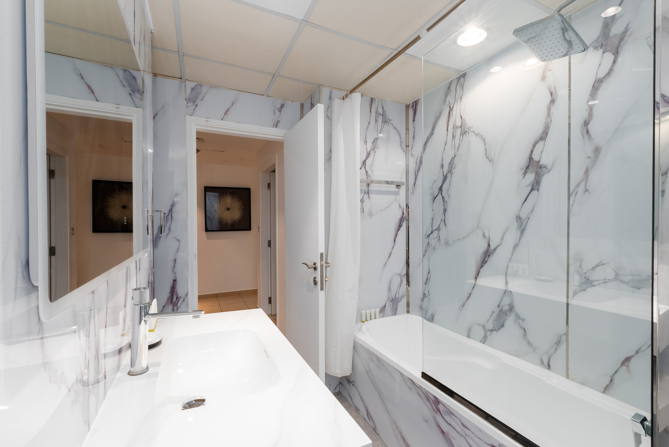 The second and third bedrooms are just as inviting as the master. Each comes with a queen bed, a dresser with a mirror, and a wardrobe for your essentials. If you need to handle last-minute work, the second bedroom includes a workspace with a comfortable chair. For added convenience, the common bathroom in the hallway offers a bathtub and a large vanity unit to match.