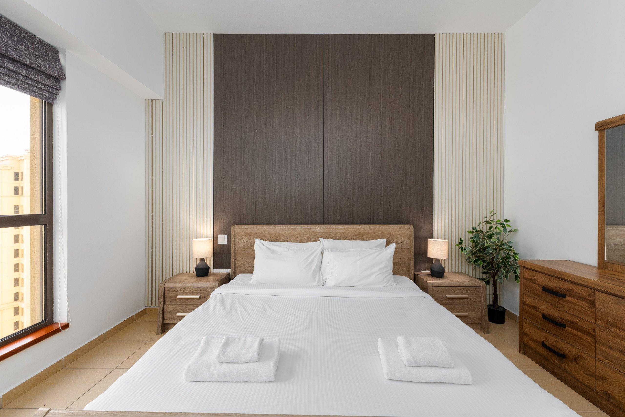 The apartment features two additional bedrooms. The second bedroom offers two single beds with premium bedding and a stunning view, while the third bedroom is furnished with a queen-sized bed, providing a comfortable and private space for relaxation.
