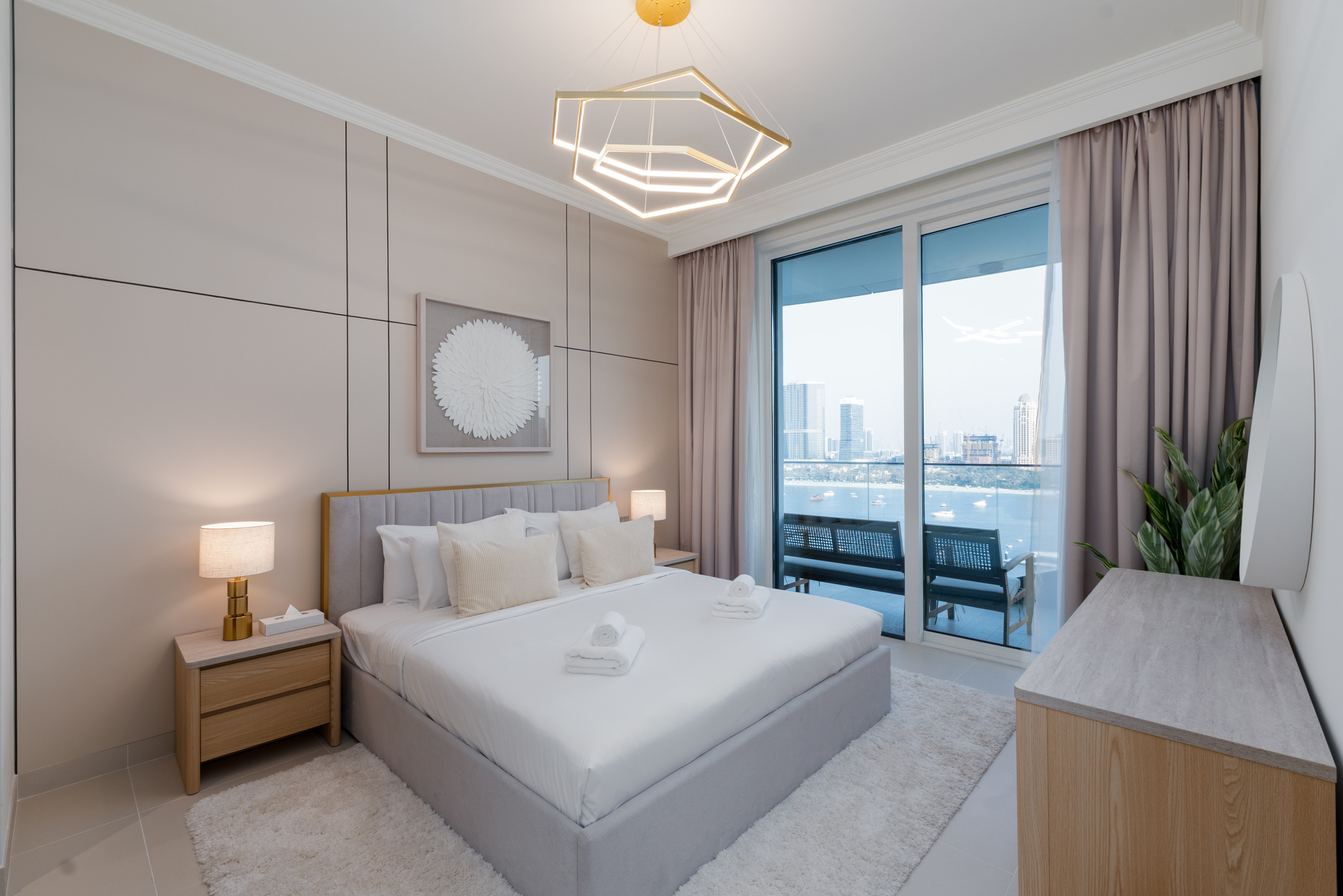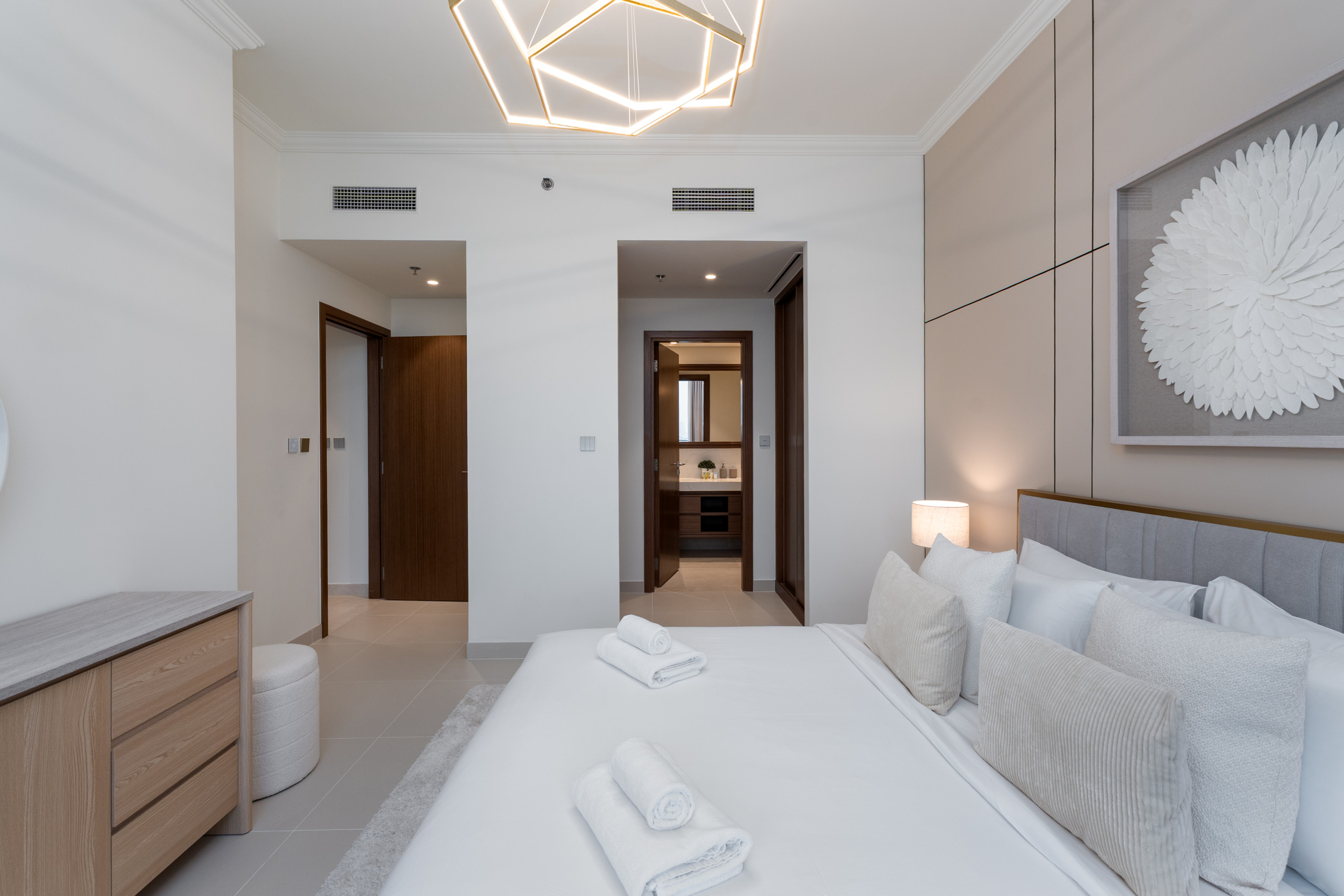 Retreat to the luxurious master bedroom, a tranquil sanctuary featuring a premium king-sized and direct glass-door access to the private balcony, ensuring you wake up to spectacular waterfront and city skyline views and can step outside immediately. The room also includes a dedicated wardrobe for storing your belongings and a stylish vanity area for getting ready. The ensuite bathroom provides complete convenience with a spacious walk-in shower and high-quality fixtures for a refreshing start or end to your day.