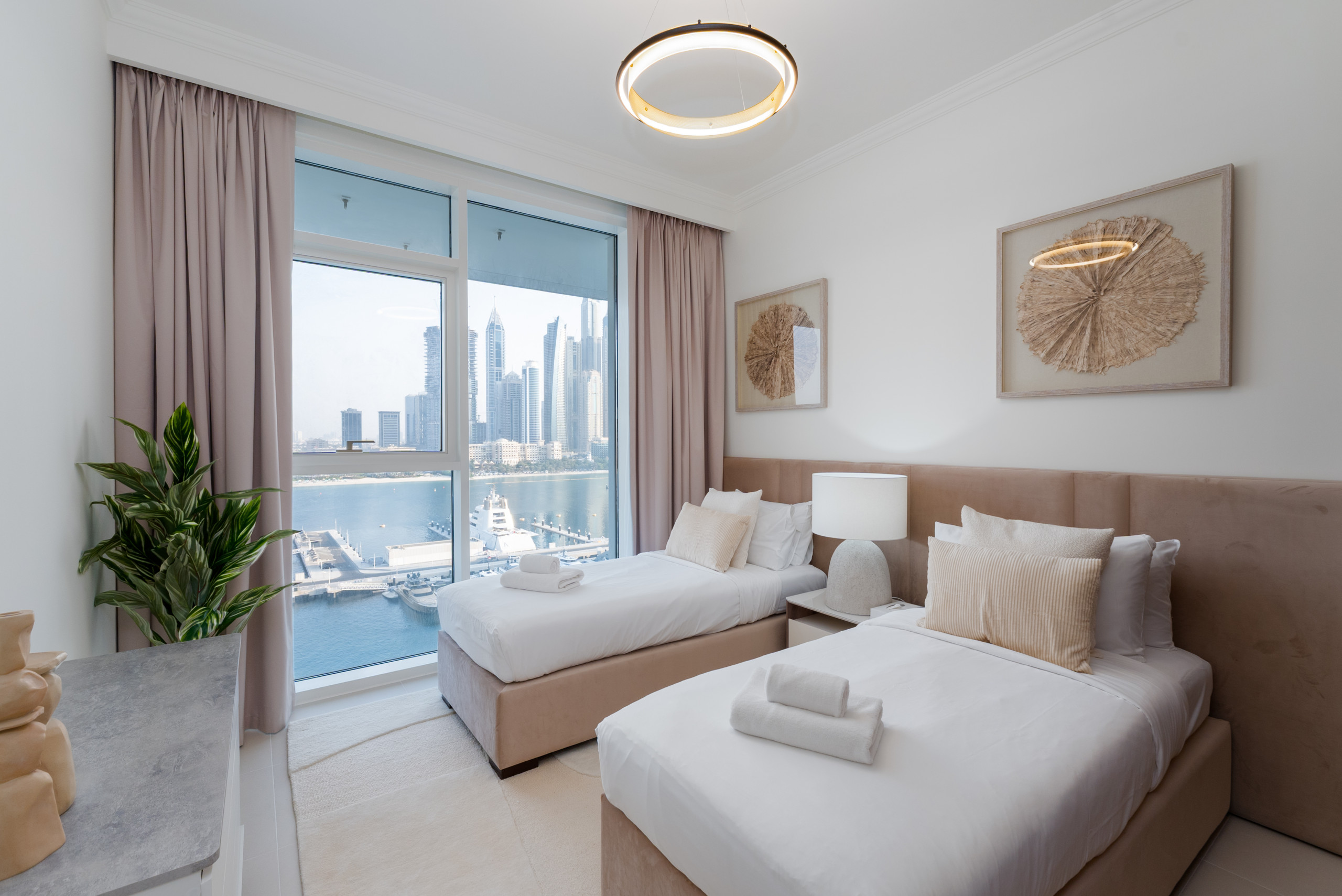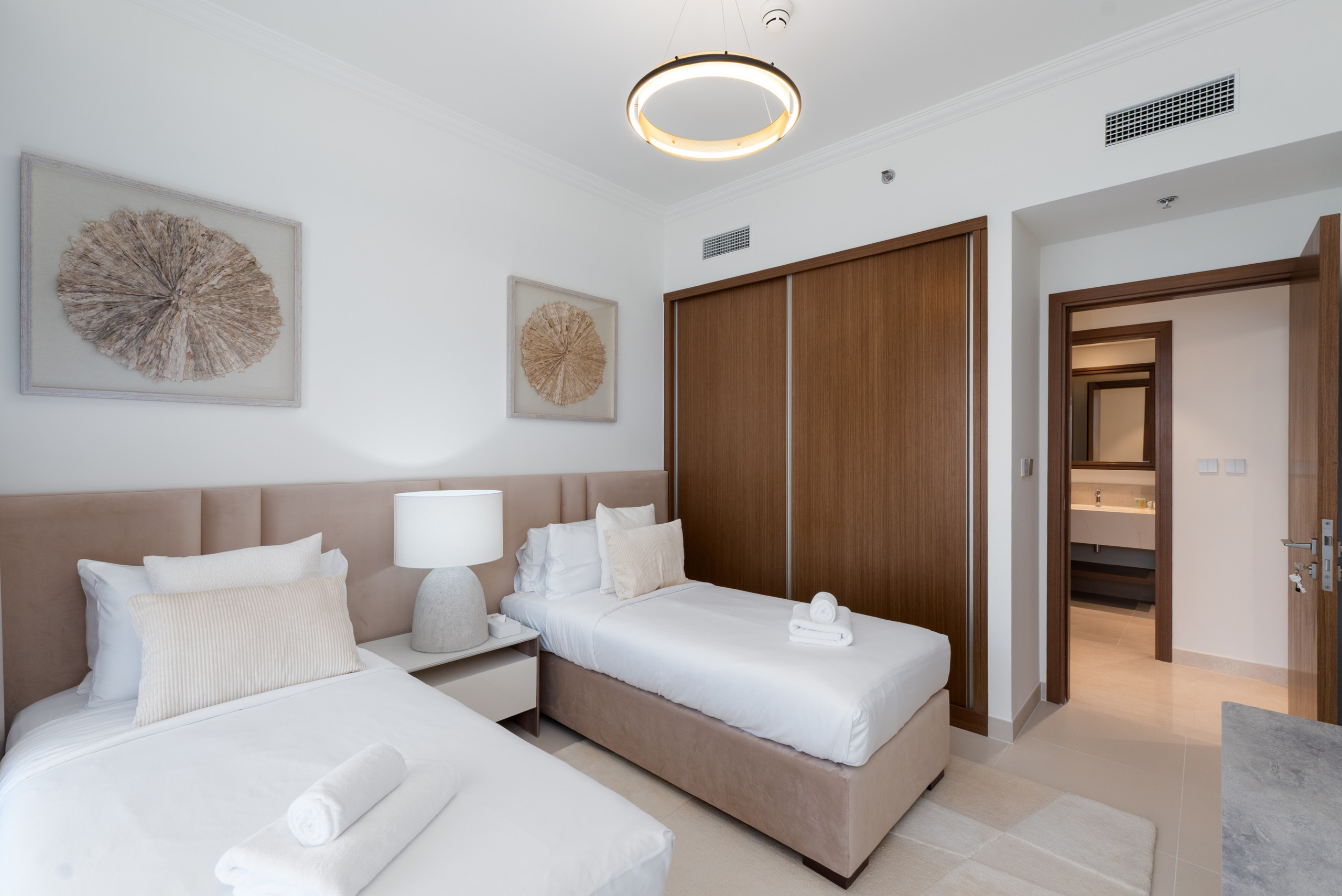 The bright and comfortable second bedroom is ideal for guests, featuring two comfortable single beds with premium linens and pillows. The room features large windows providing a wonderful view of the waterfront and skyline. The room also includes a spacious built-in wardrobe for ample storage and convenience.