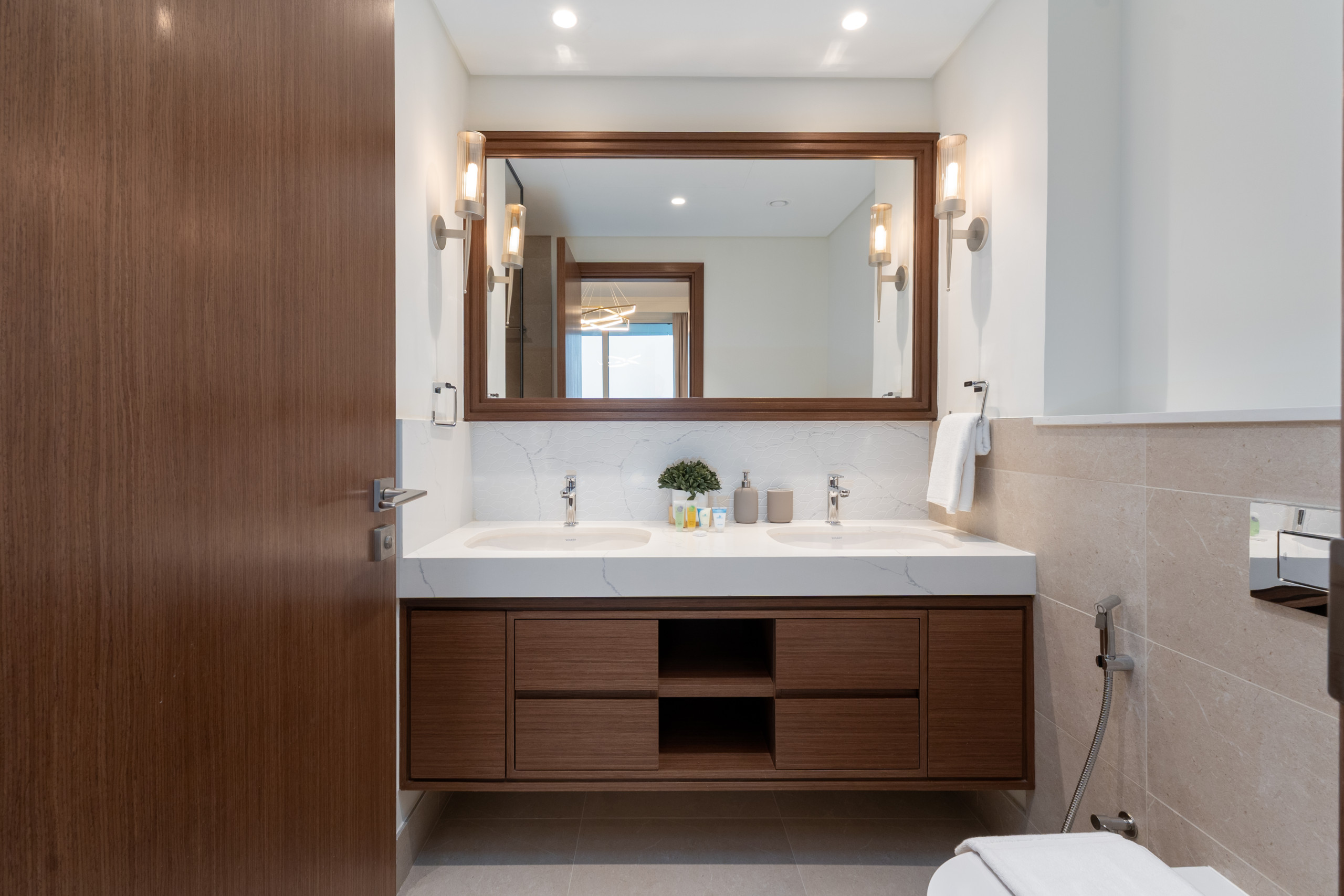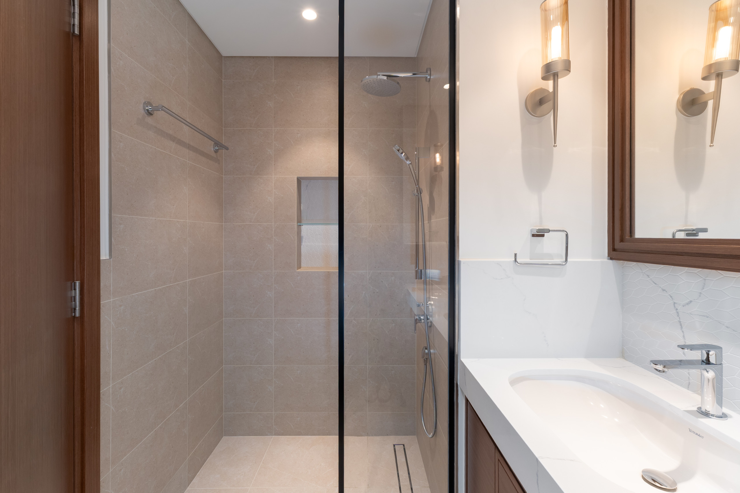 This unit also features a sleek, modern bathroom with a spacious shower, large vanity, and double sinks.