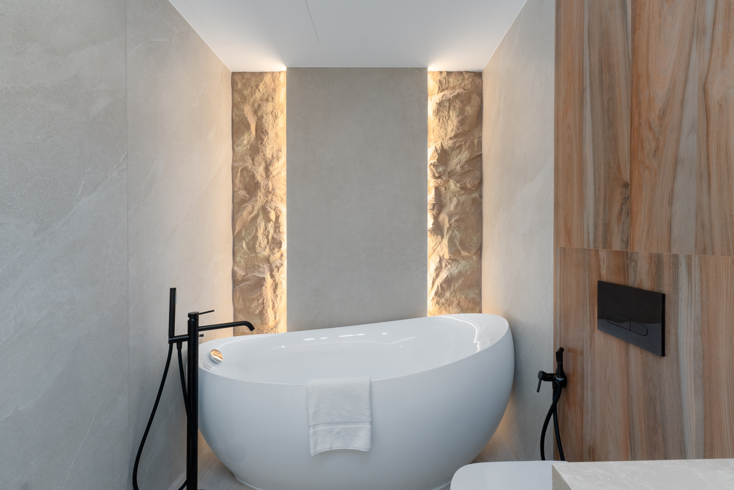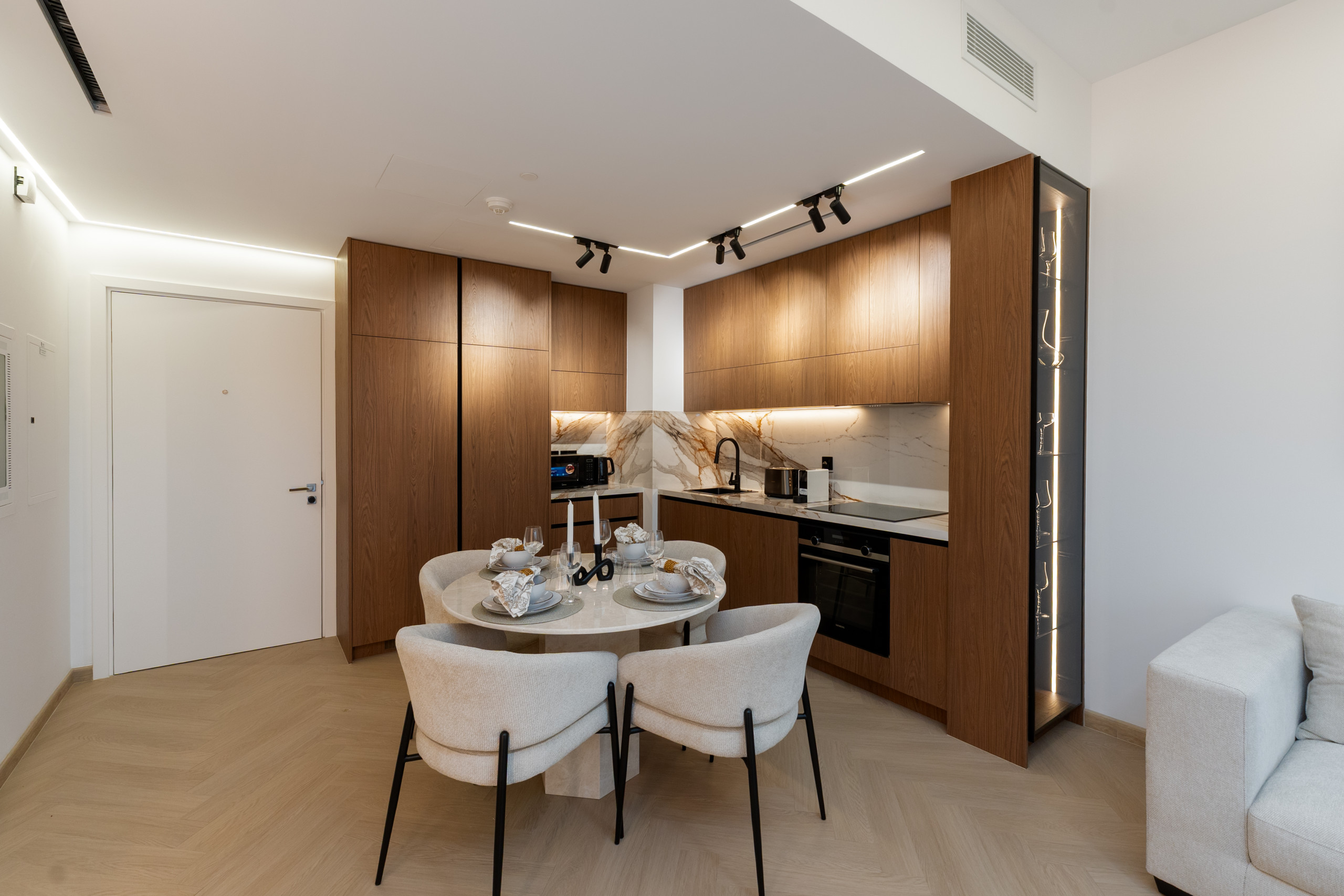 With its modern, minimalist design and a hint of Scandinavian charm, this living space is made for comfort. Stretch out on the rounded sofa, enjoy the view, or binge your favorite show on TV. Hungry? Skip the delivery apps and use the kitchen - it’s stocked with all the essentials for meal prep, from cookware to appliances. The dining area is perfectly set for you to enjoy your creations, complete with all the tableware you need. And when you’re done, let the dishwasher handle the mess. Laundry’s no problem either, thanks to the washing machine. High-speed WiFi keeps you connected, making this a serene yet practical retreat for your travels.