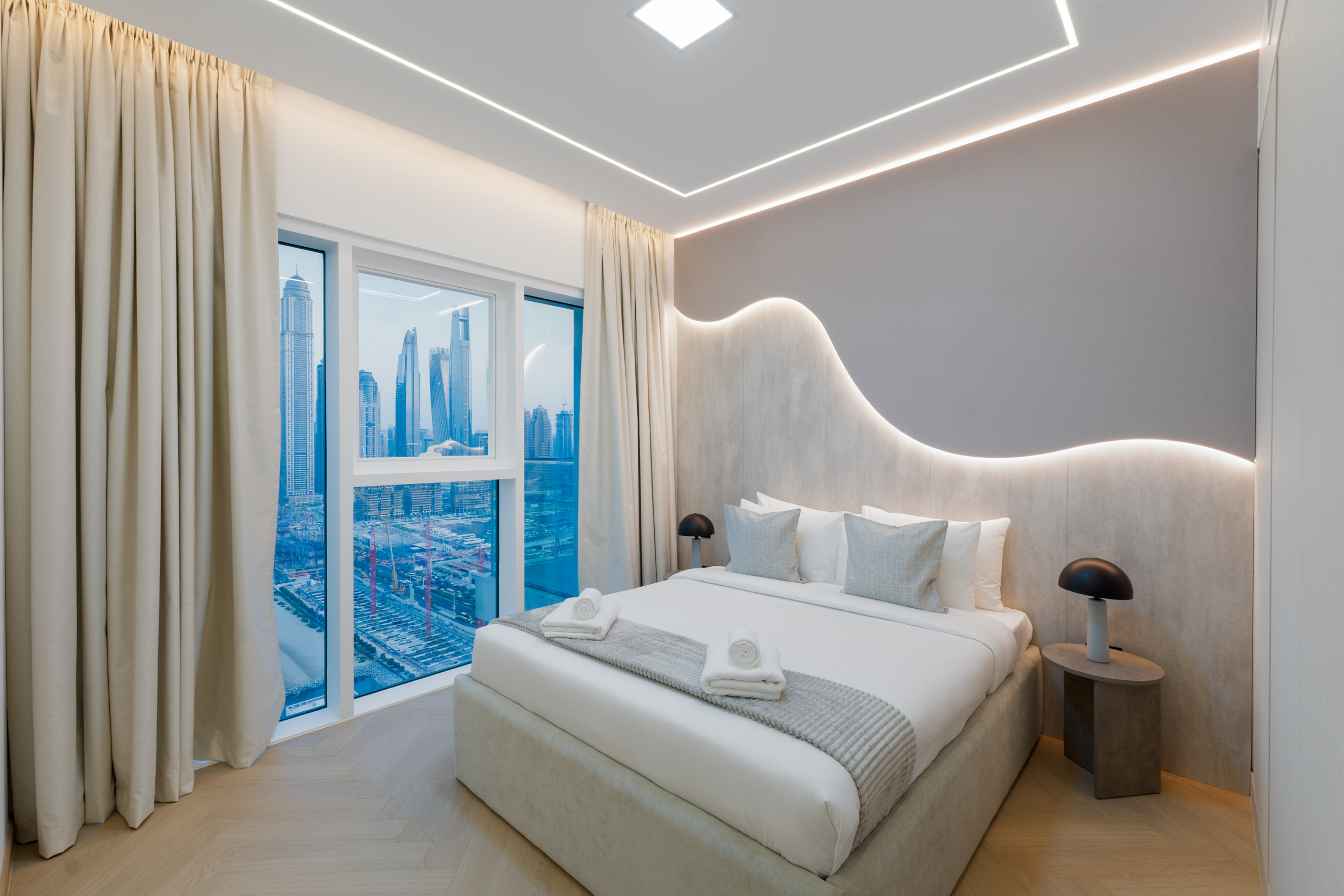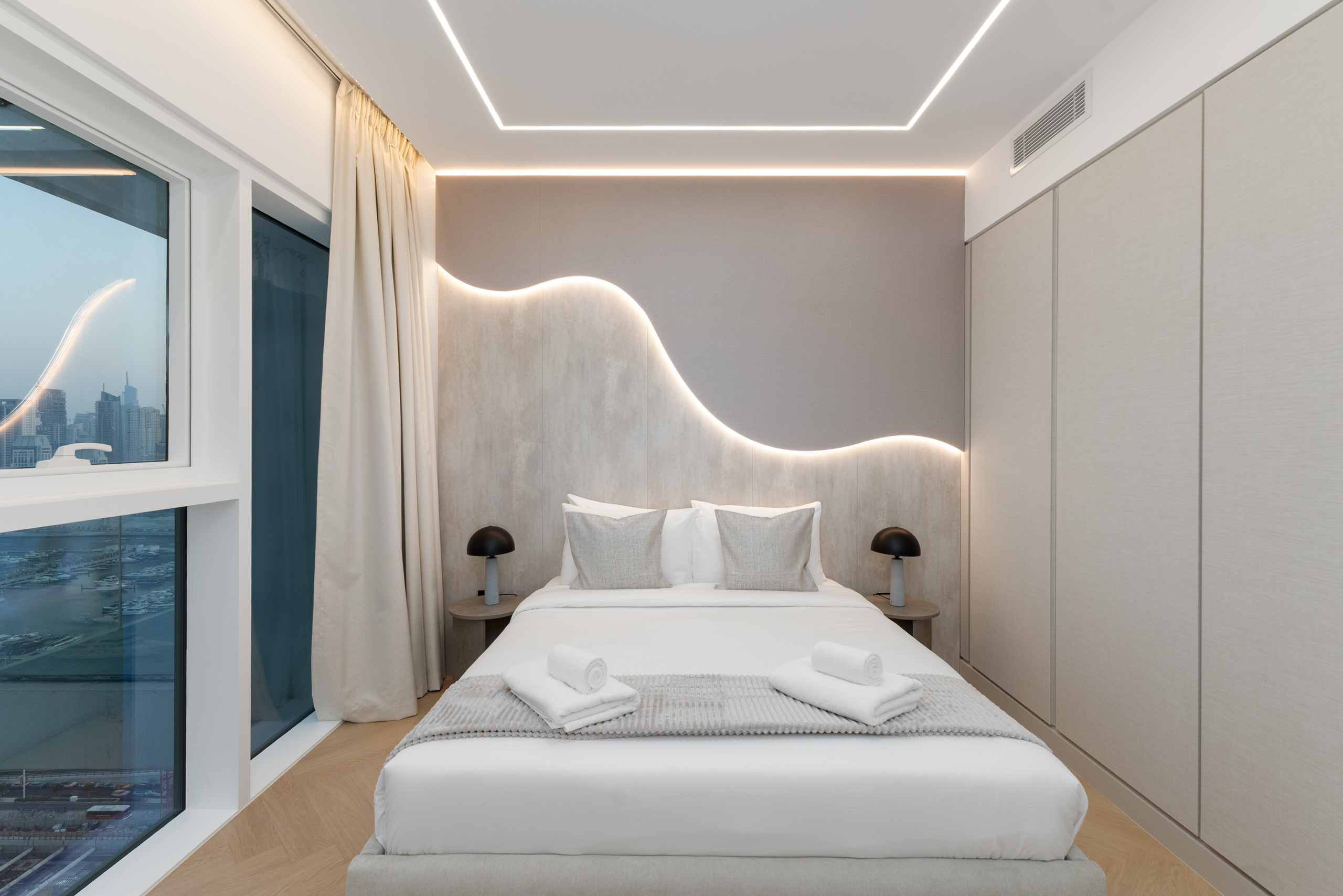 The second bedroom is also furnished to an exceptionally high standard featuring modern art, a double bed, premium bedding, side-tables, and fitted wardrobes.