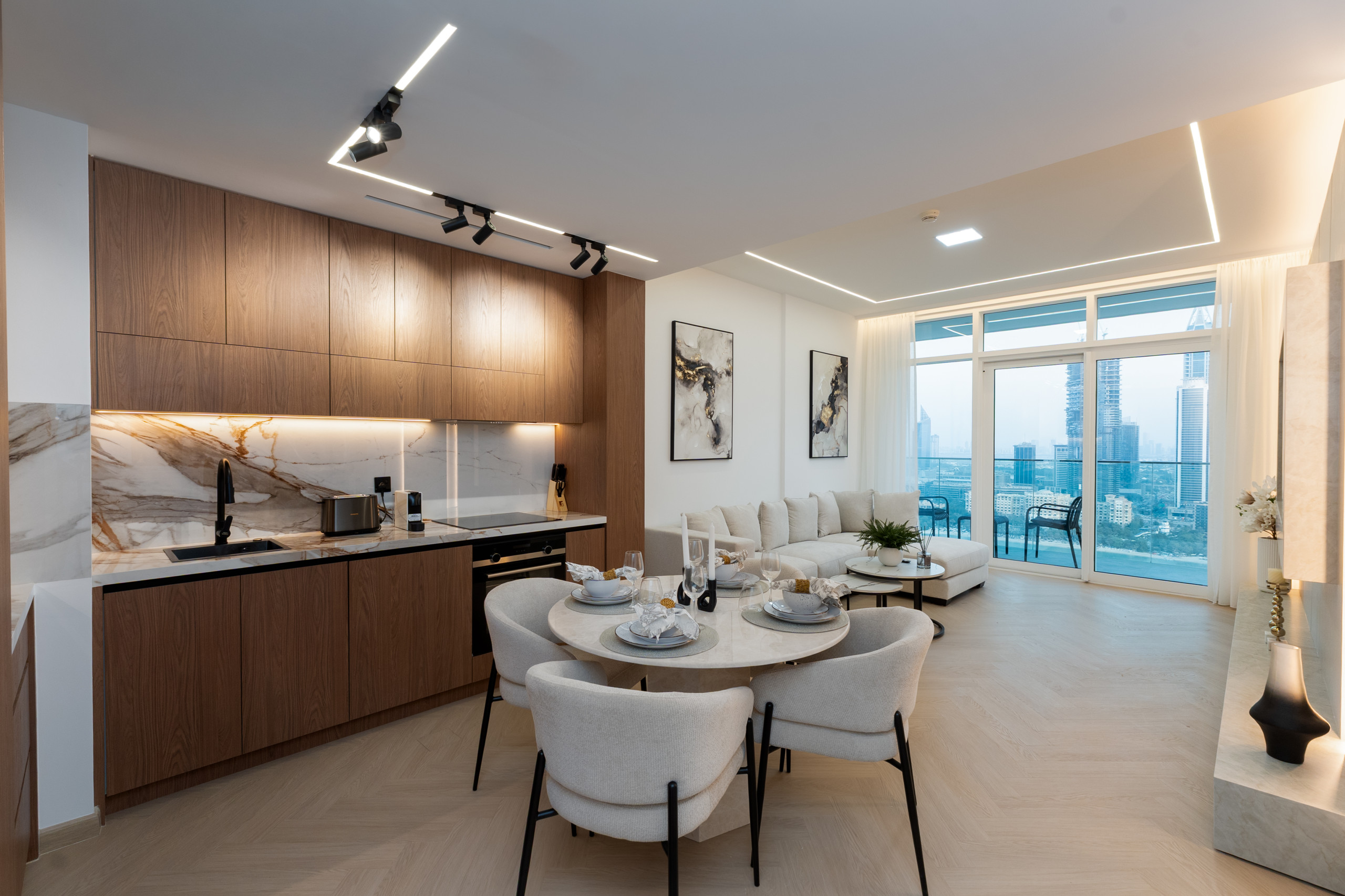 The living space of this two-bedroom apartment has fabulous furnishings and fittings to include a large L-shaped sofa, a coffee table, modern art, a TV and access to the balcony. There is a stunning dining table with comfortable seating to accommodate up to four guests with large windows allowing for amazing views while enjoying meals. The fully fitted kitchen comes complete with all the necessary appliances for a seamless stay and those special extras of high-quality cabinetry that adds to it’s established air of elegance.