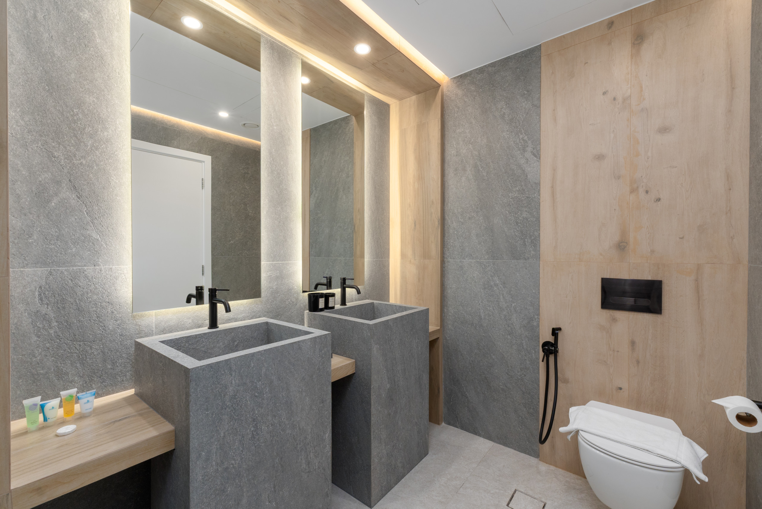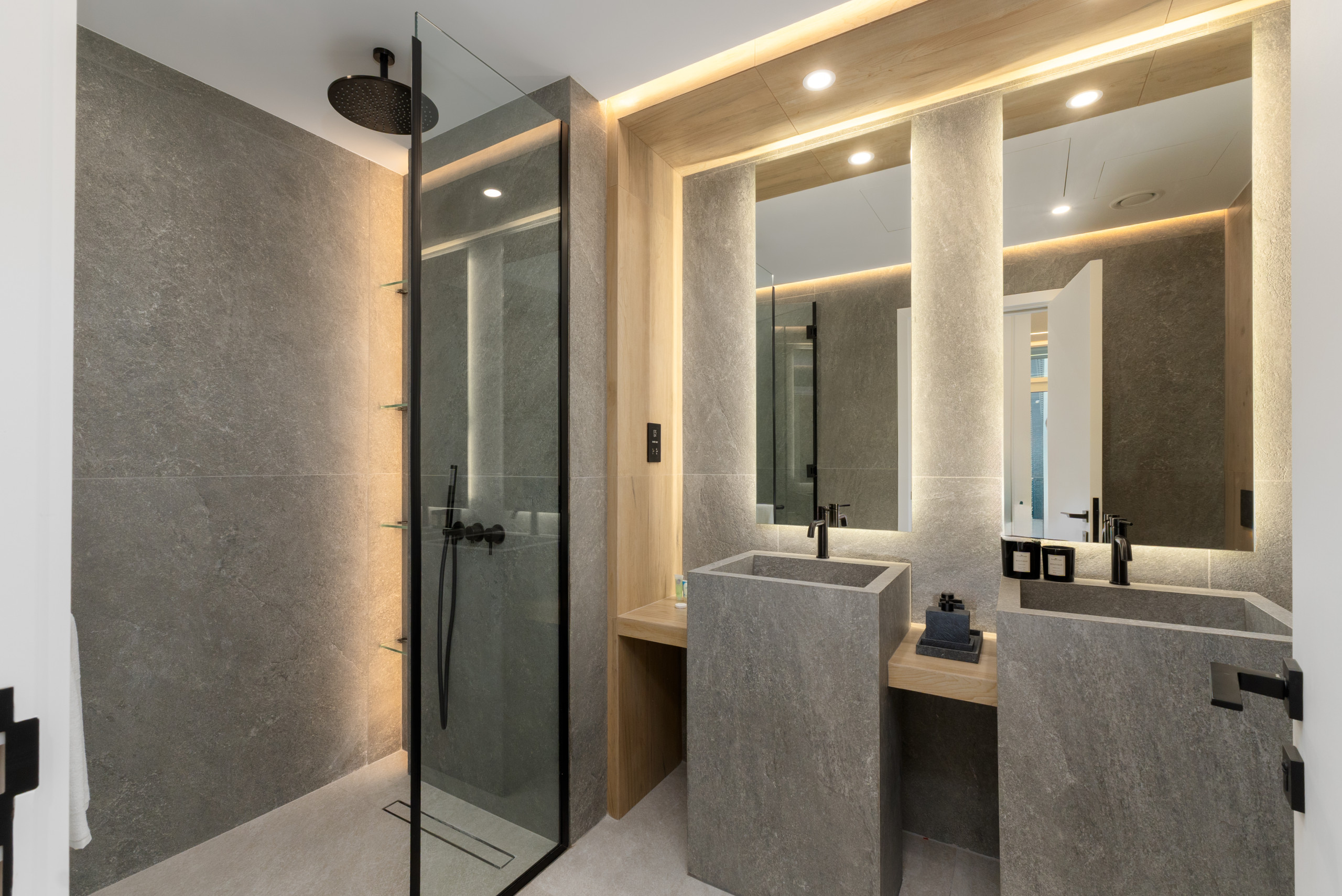 This unit also features a sleek, modern bathroom with a spacious shower, large vanity, and double sinks.