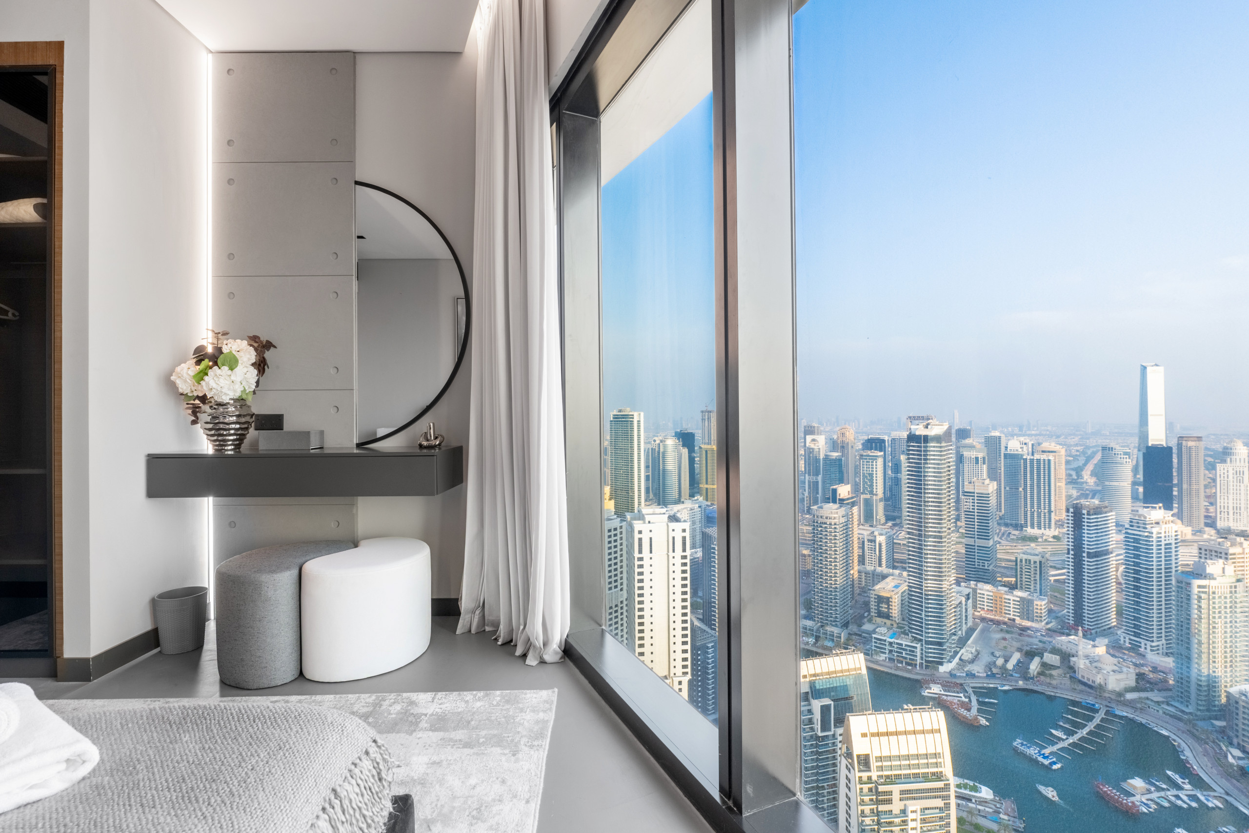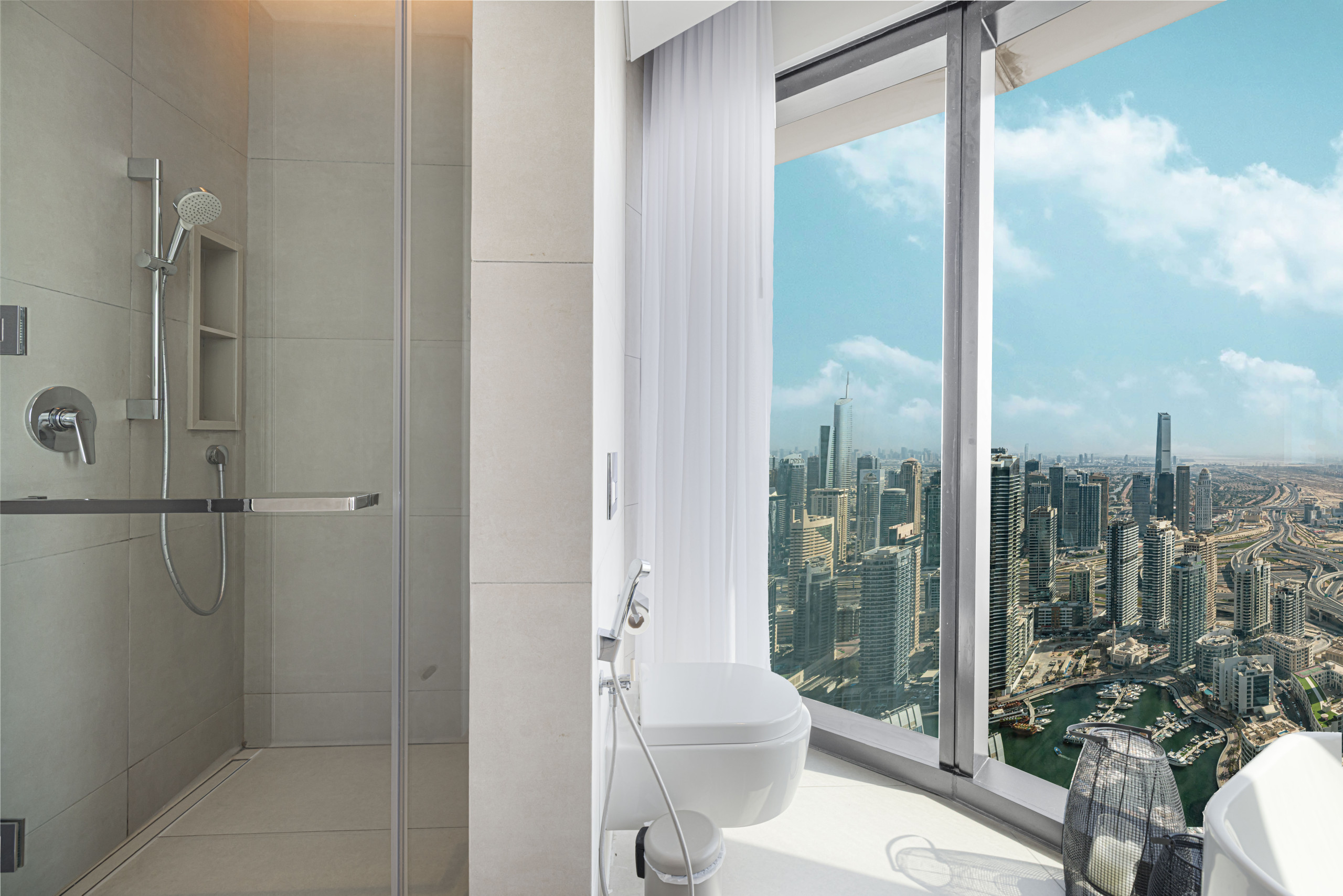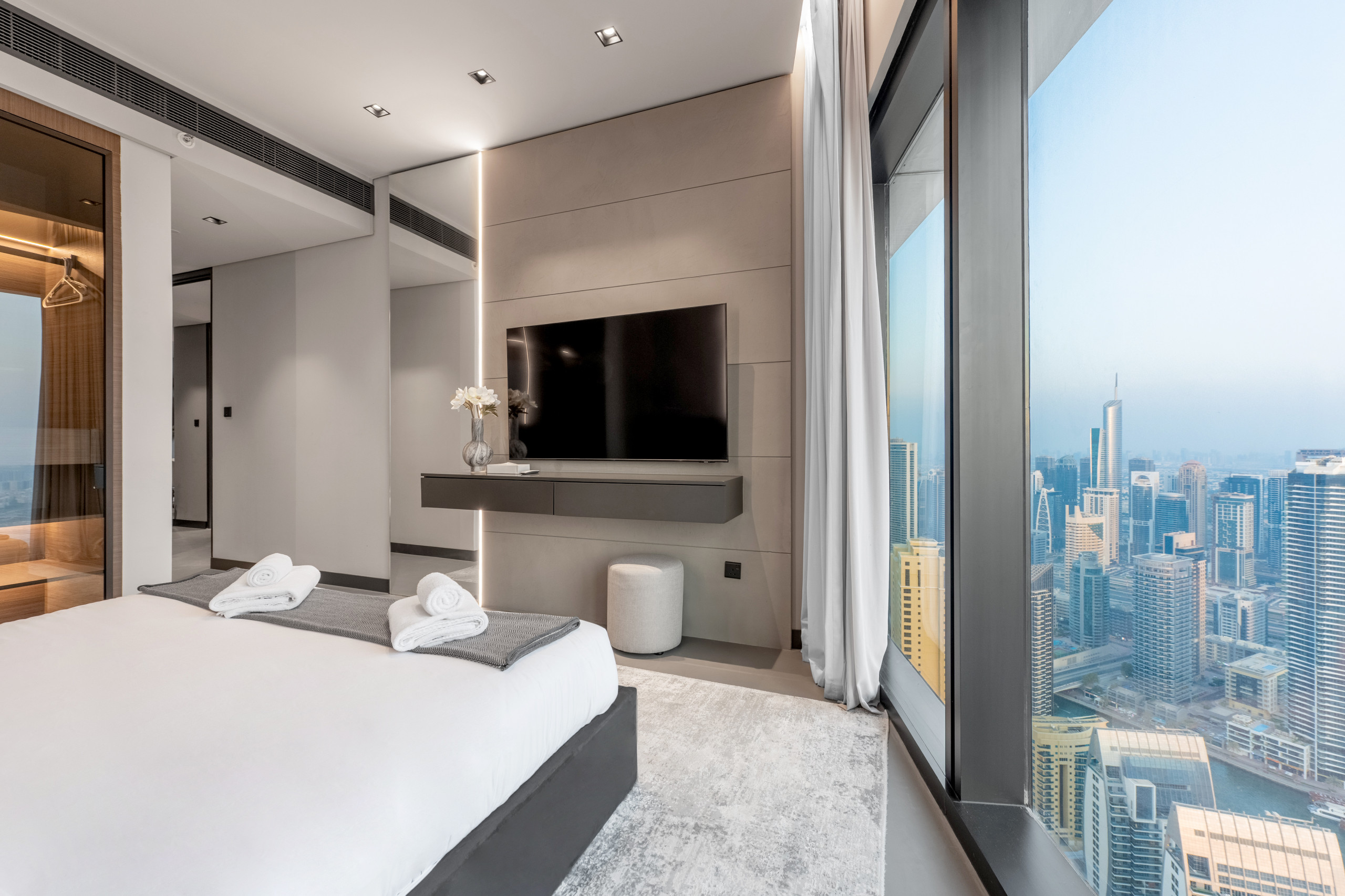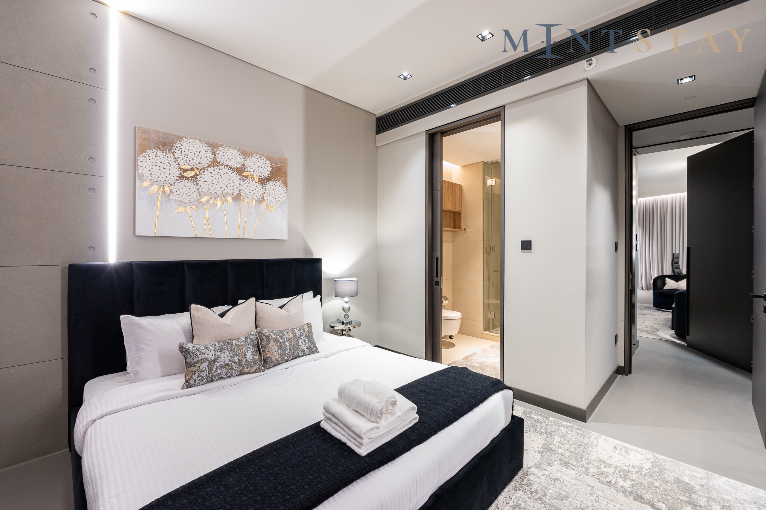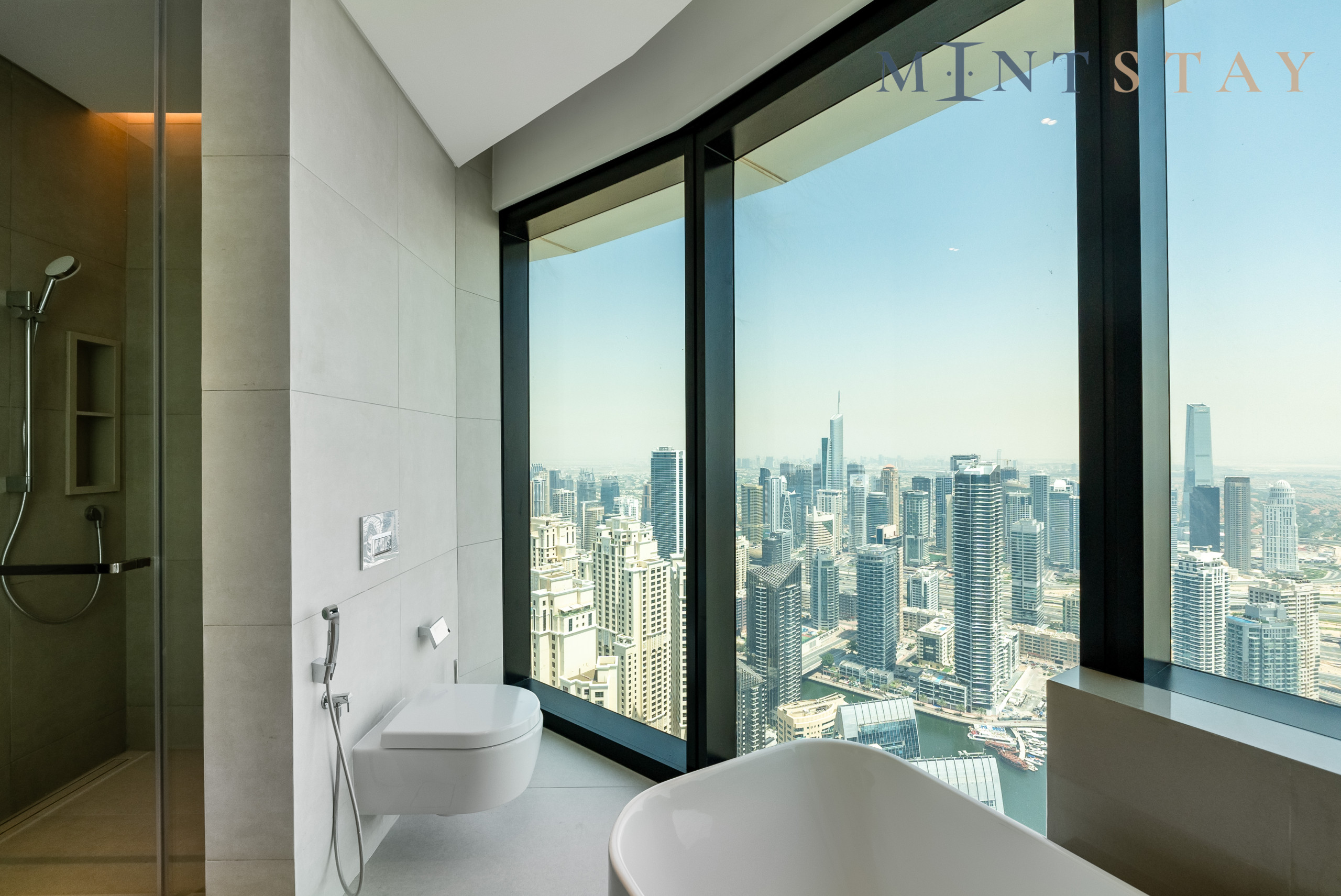 Sightseeing can be so exhausting, but not when you have a bedroom like this waiting for you! You’ll find a king-size bed with the softest sheets and pillows, along with a view of Dubai Marina from the window. Sure, the beach sounds nice, but wait until you experience the en suite bathroom! It features a walk-in shower that’ll wake you up feeling like a million bucks. And speaking of feeling good, the wardrobe is massive – perfect for keeping your vacation style on point. After all, you came to Dubai to slay, right?