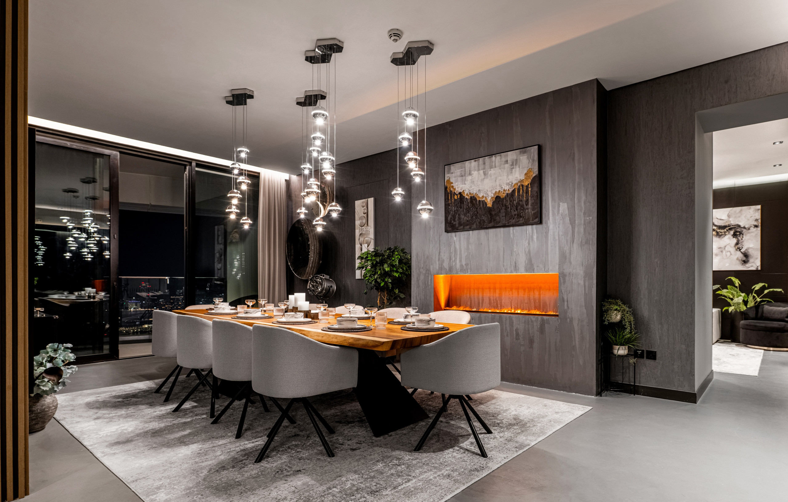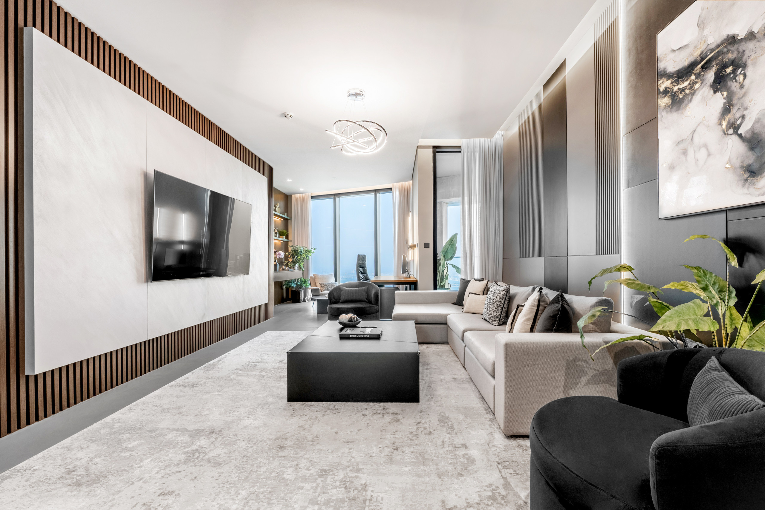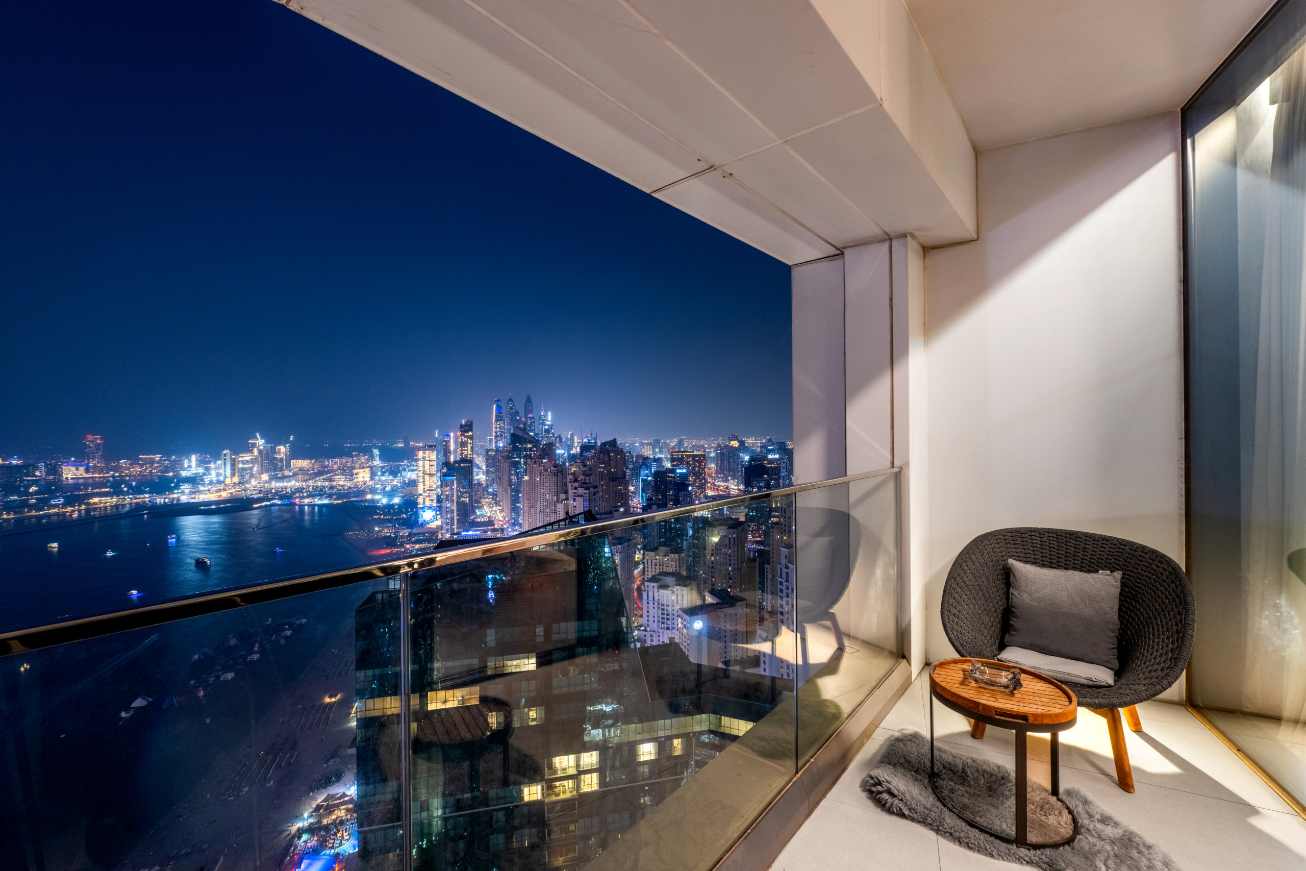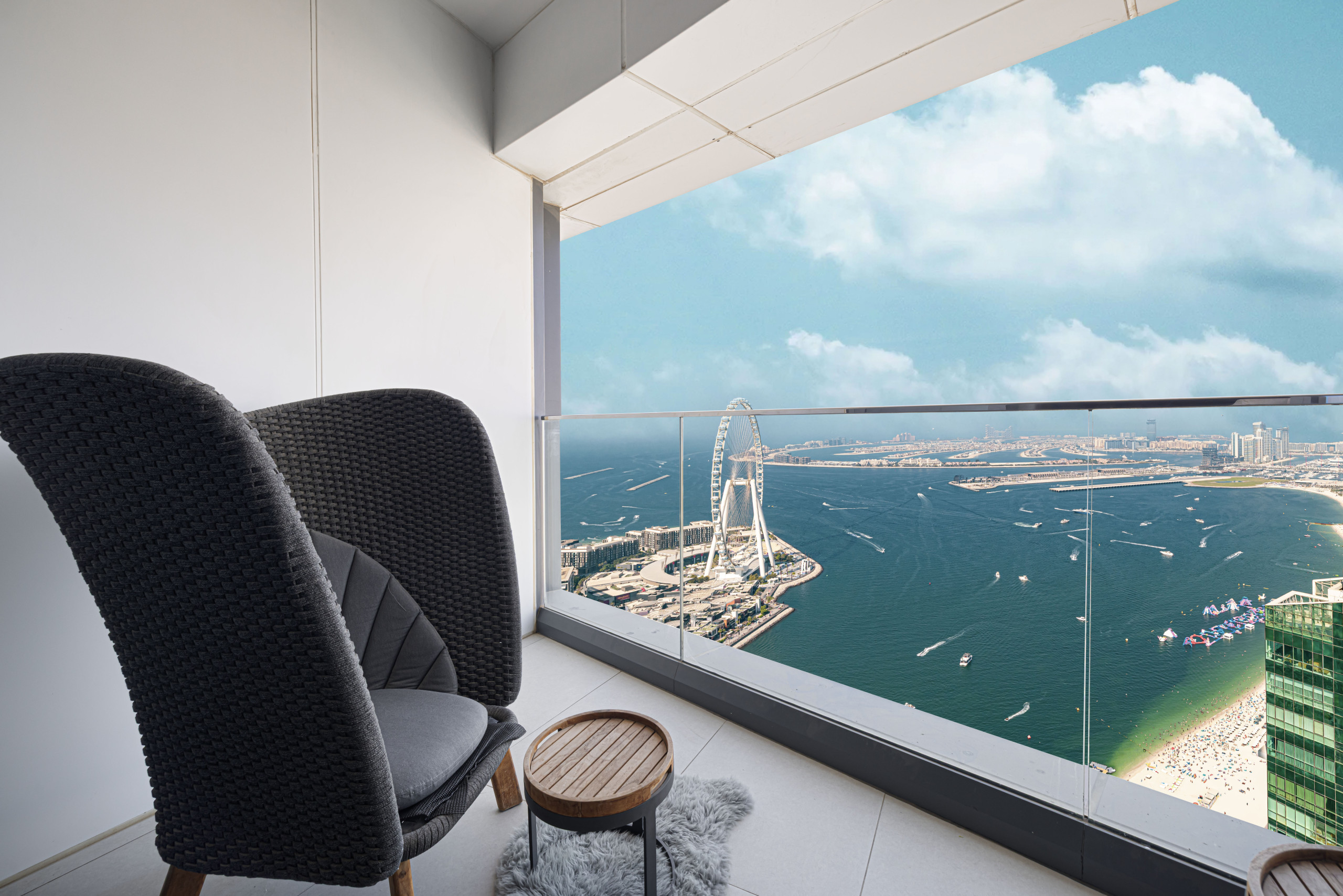 Four luxurious bedrooms, a wine cellar, a firelit centerpiece, and beach and city views – all in a monochromatic setting with high-end and functional furnishings. Trust me, this apartment stands out – its neighborhood is also one of Dubai's top destinations, so expect easy access to many trending spots like The Walk at JBR and Ain Dubai at Bluewaters Island. Plus, there's a plethora of cafes and restaurants nearby, not to mention a private beach, pool, and gym.