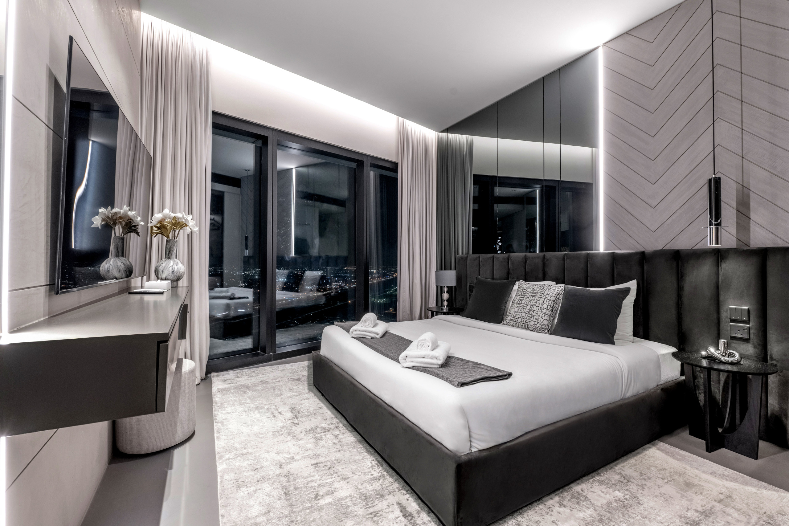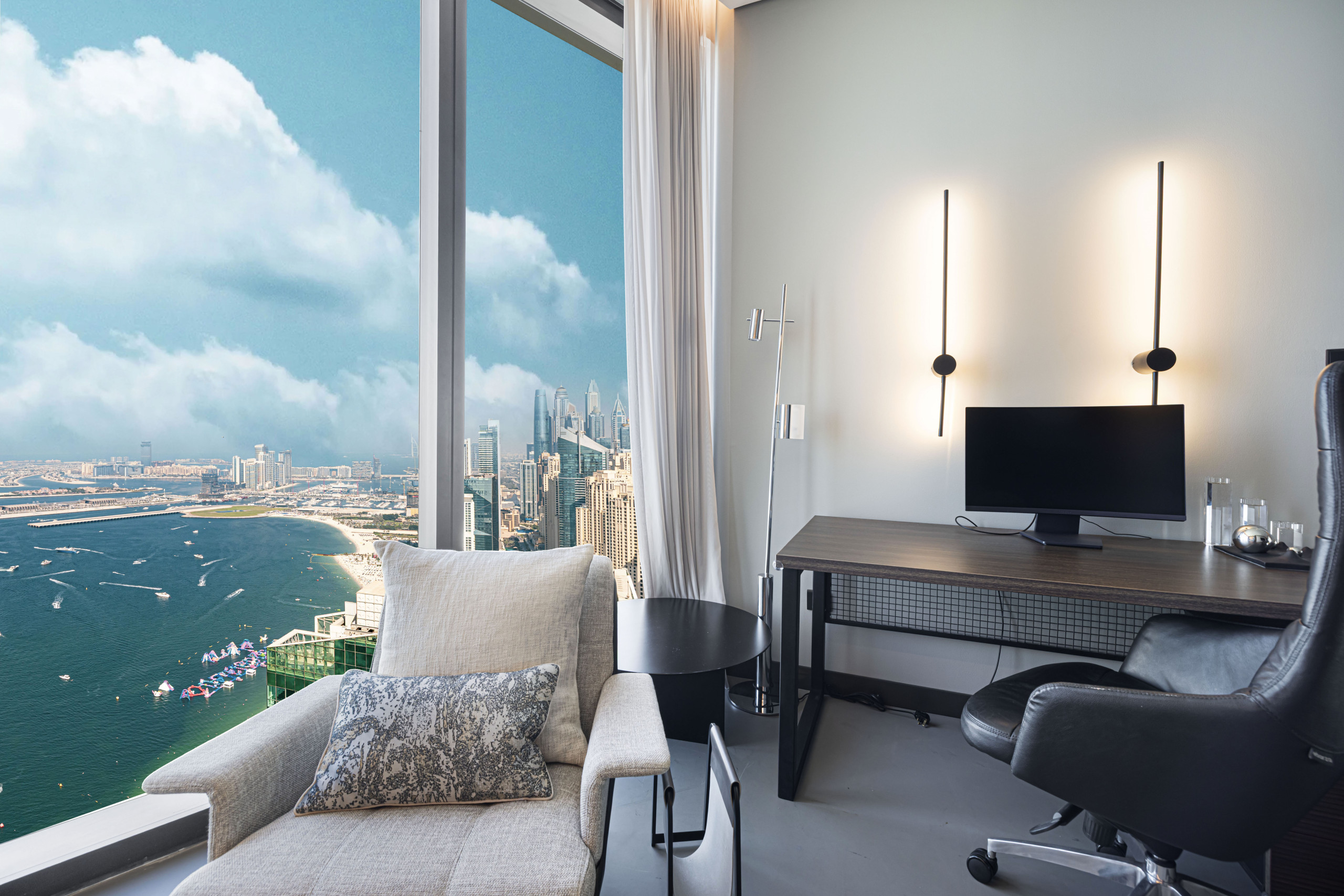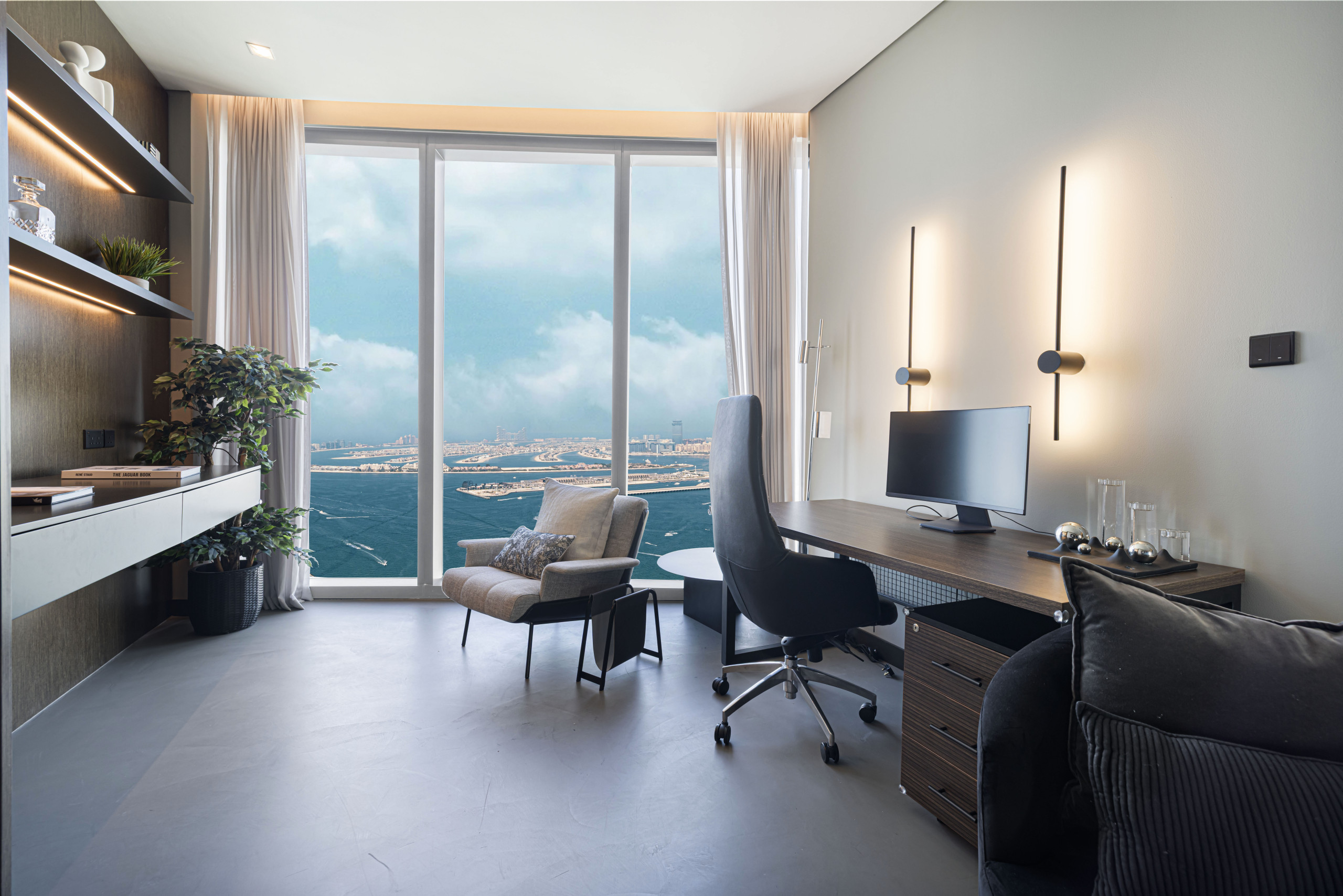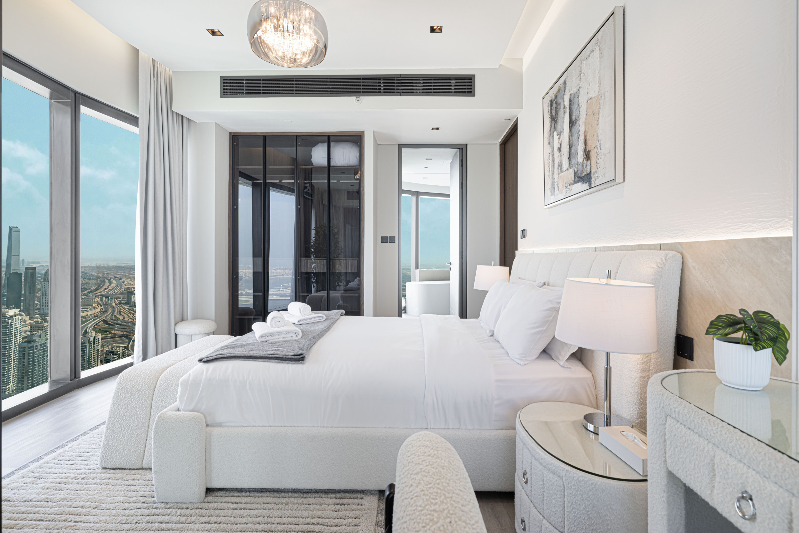 The master bedroom is a standout, blending refined elegance with rich Middle Eastern design influences. The sculpted headboard anchors the space, paired with a king-size bed, side tables, and an upholstered bench at the foot. Floor-to-ceiling windows frame distant views of The Palm and Atlantis, while armchairs by the window add both comfort and purpose. Thoughtful details like layered textiles and varied textures elevate the room. A generous walk-in closet adds function, and the spacious en-suite features a soaking tub, walk-in shower, and an extended vanity with a full-width mirror.