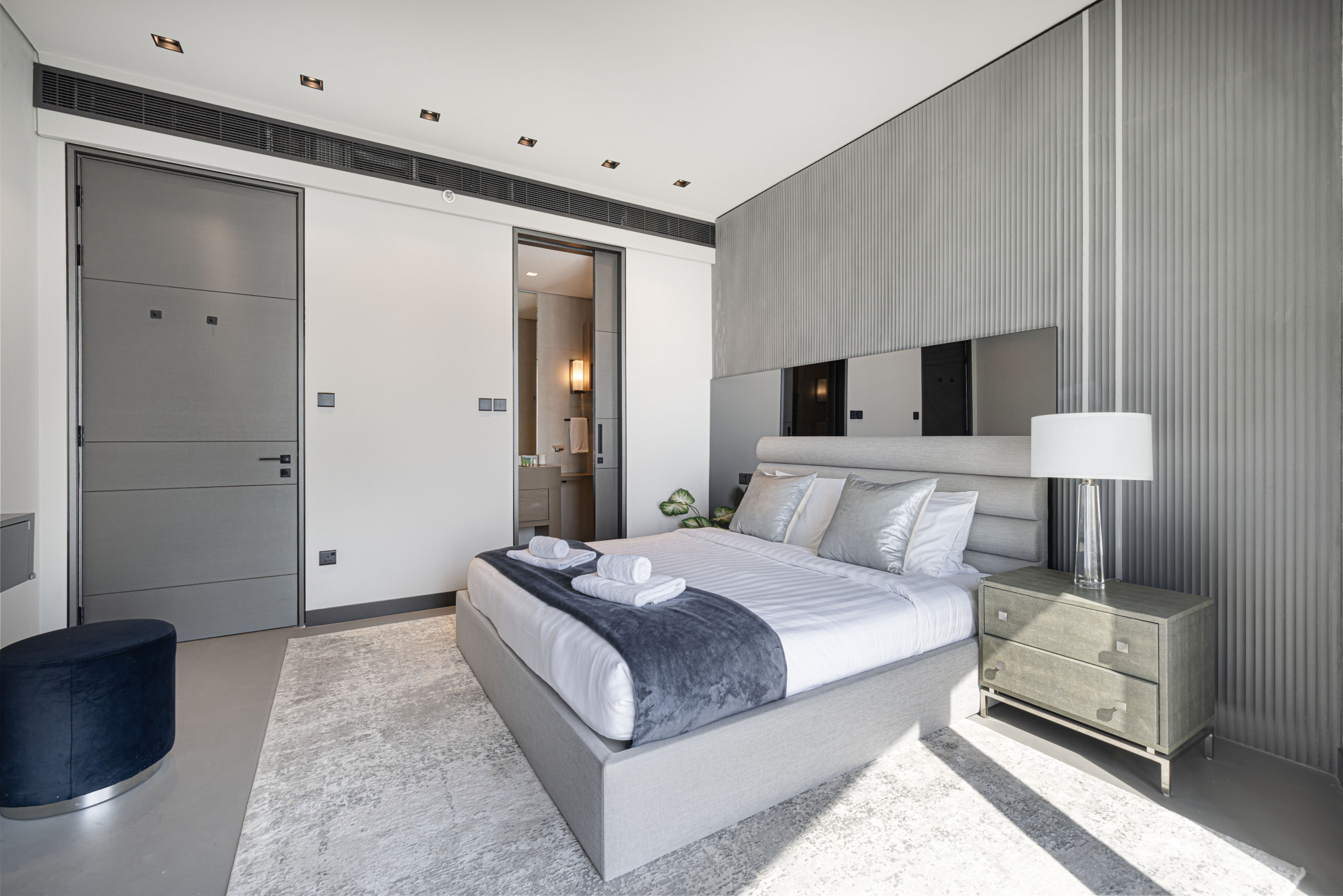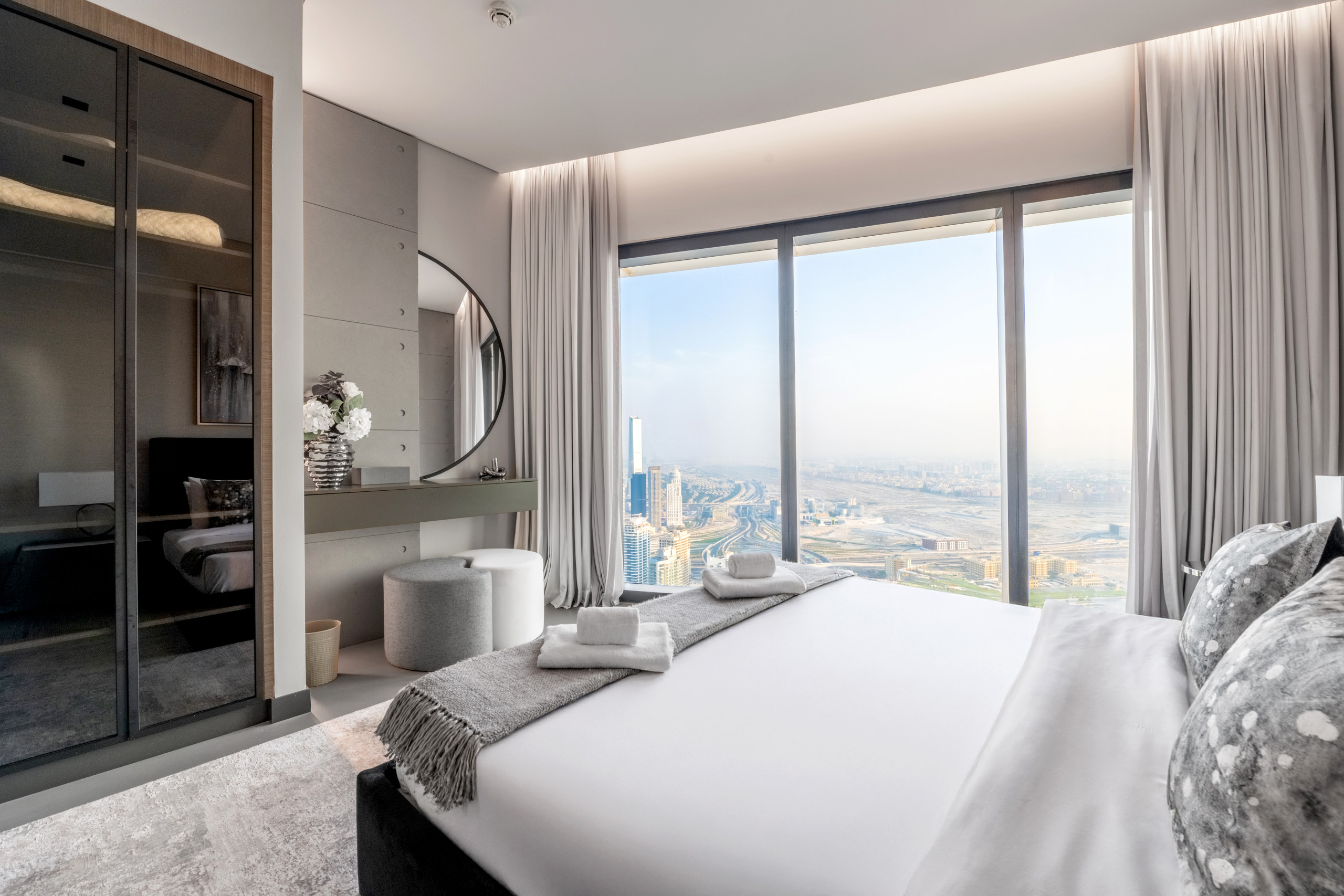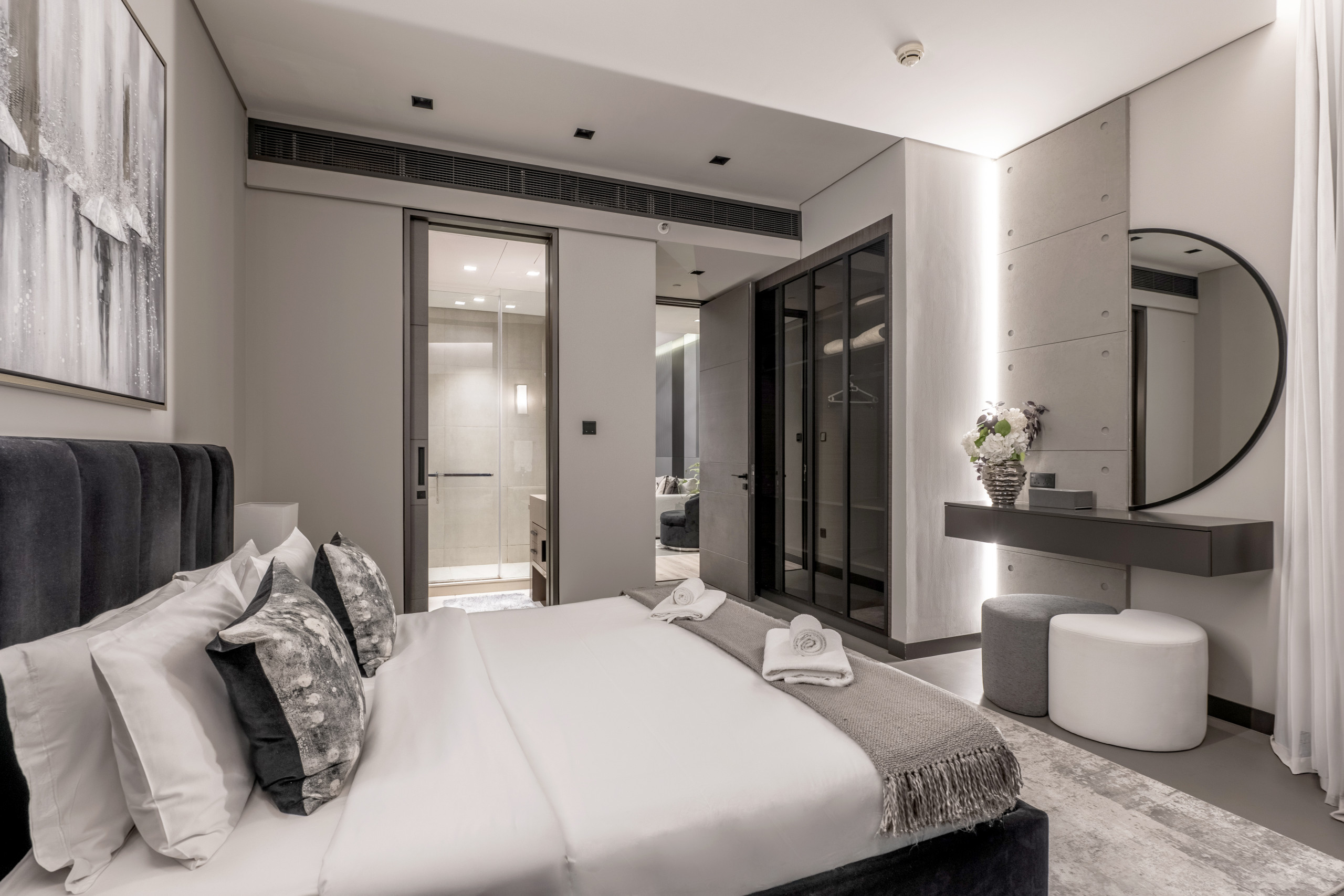 The master bedroom is a standout, blending refined elegance with rich Middle Eastern design influences. The sculpted headboard anchors the space, paired with a king-size bed, side tables, and an upholstered bench at the foot. Floor-to-ceiling windows frame distant views of The Palm and Atlantis, while armchairs by the window add both comfort and purpose. Thoughtful details like layered textiles and varied textures elevate the room. A generous walk-in closet adds function, and the spacious en-suite features a soaking tub, walk-in shower, and an extended vanity with a full-width mirror.