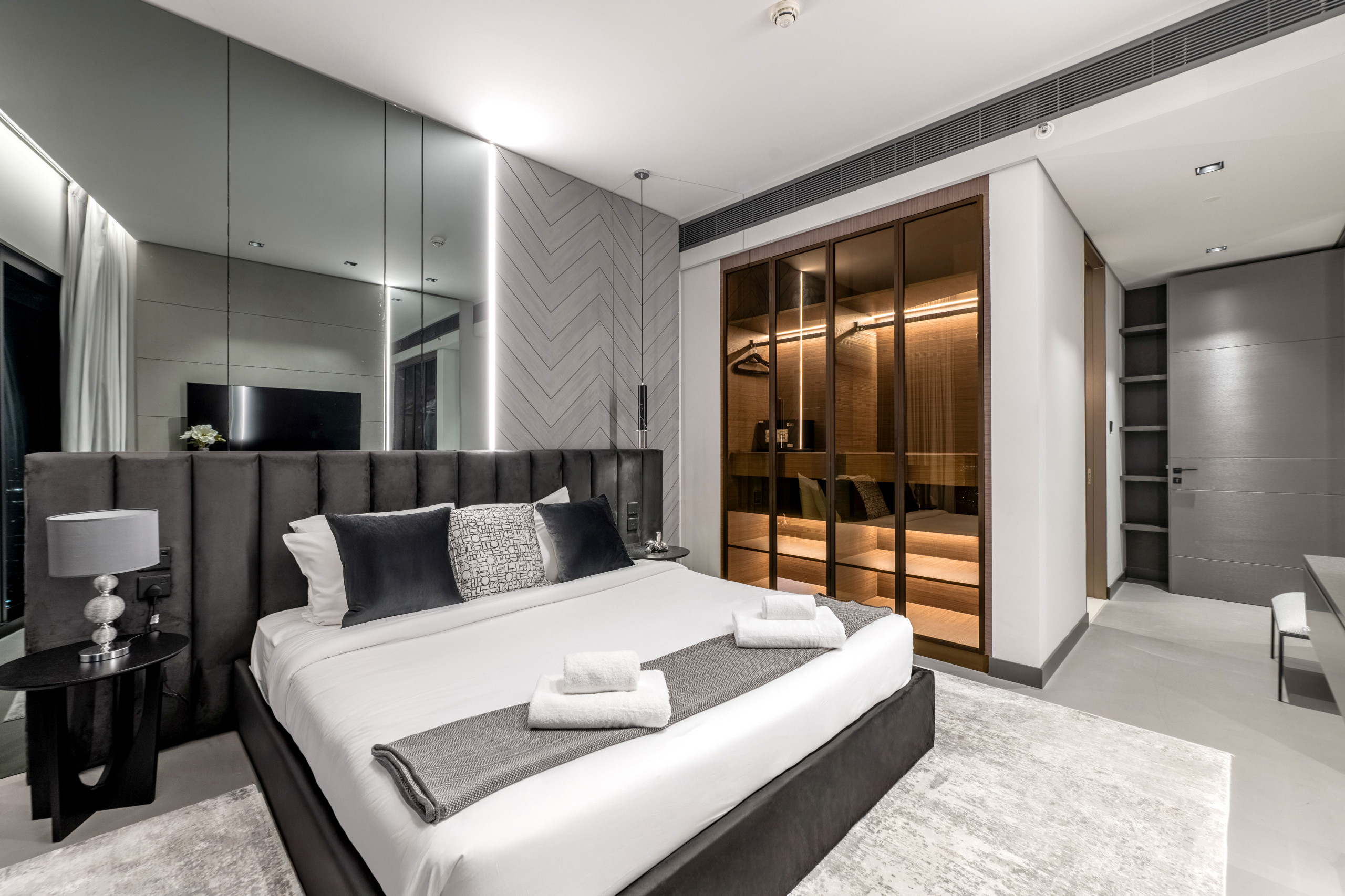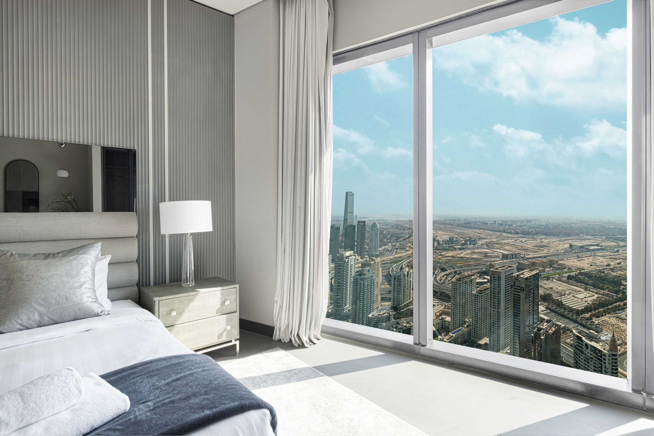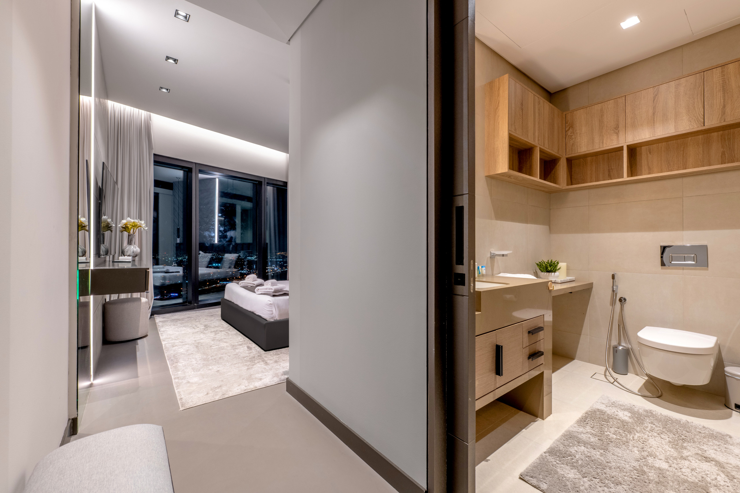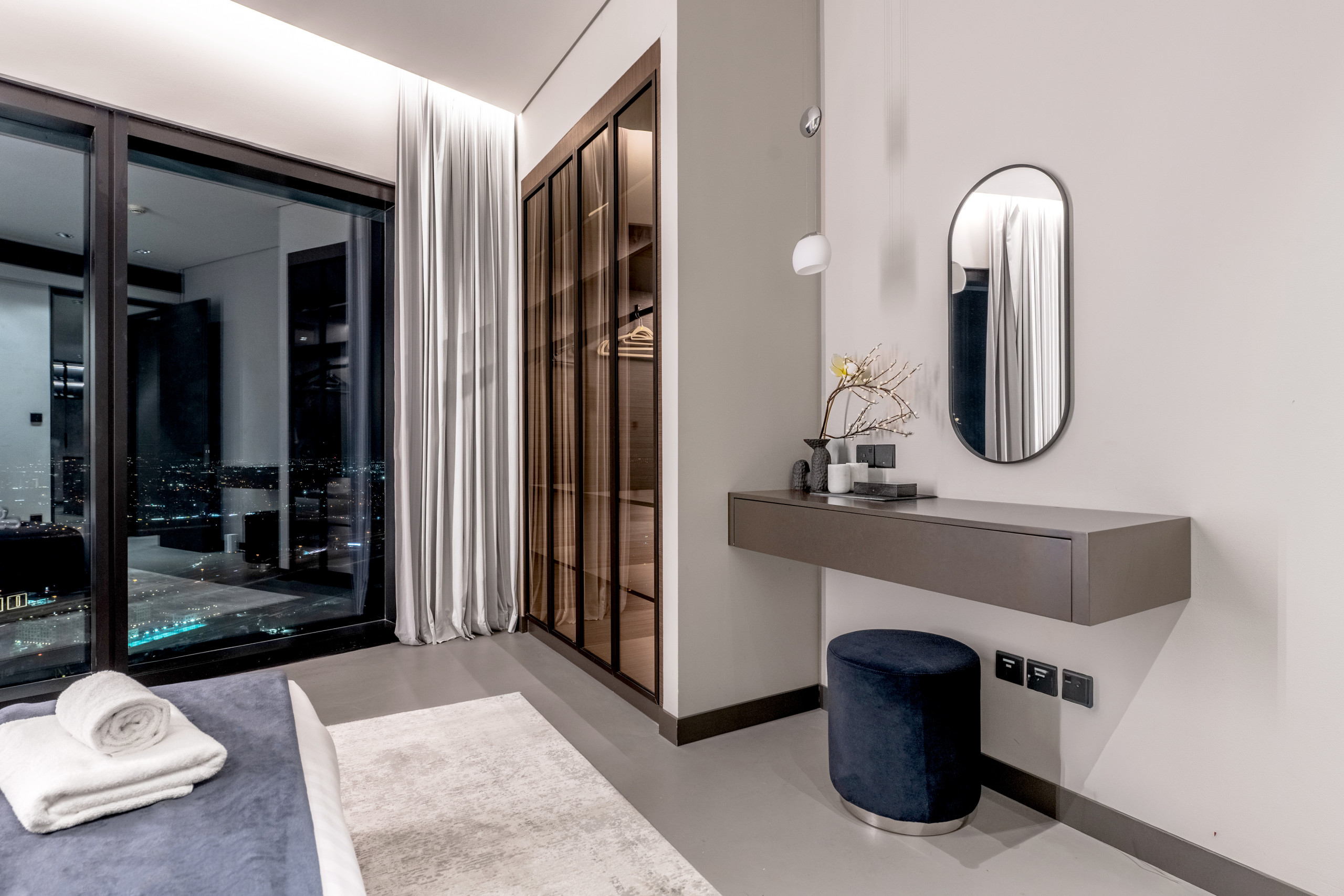 The master bedroom is a standout, blending refined elegance with rich Middle Eastern design influences. The sculpted headboard anchors the space, paired with a king-size bed, side tables, and an upholstered bench at the foot. Floor-to-ceiling windows frame distant views of The Palm and Atlantis, while armchairs by the window add both comfort and purpose. Thoughtful details like layered textiles and varied textures elevate the room. A generous walk-in closet adds function, and the spacious en-suite features a soaking tub, walk-in shower, and an extended vanity with a full-width mirror.