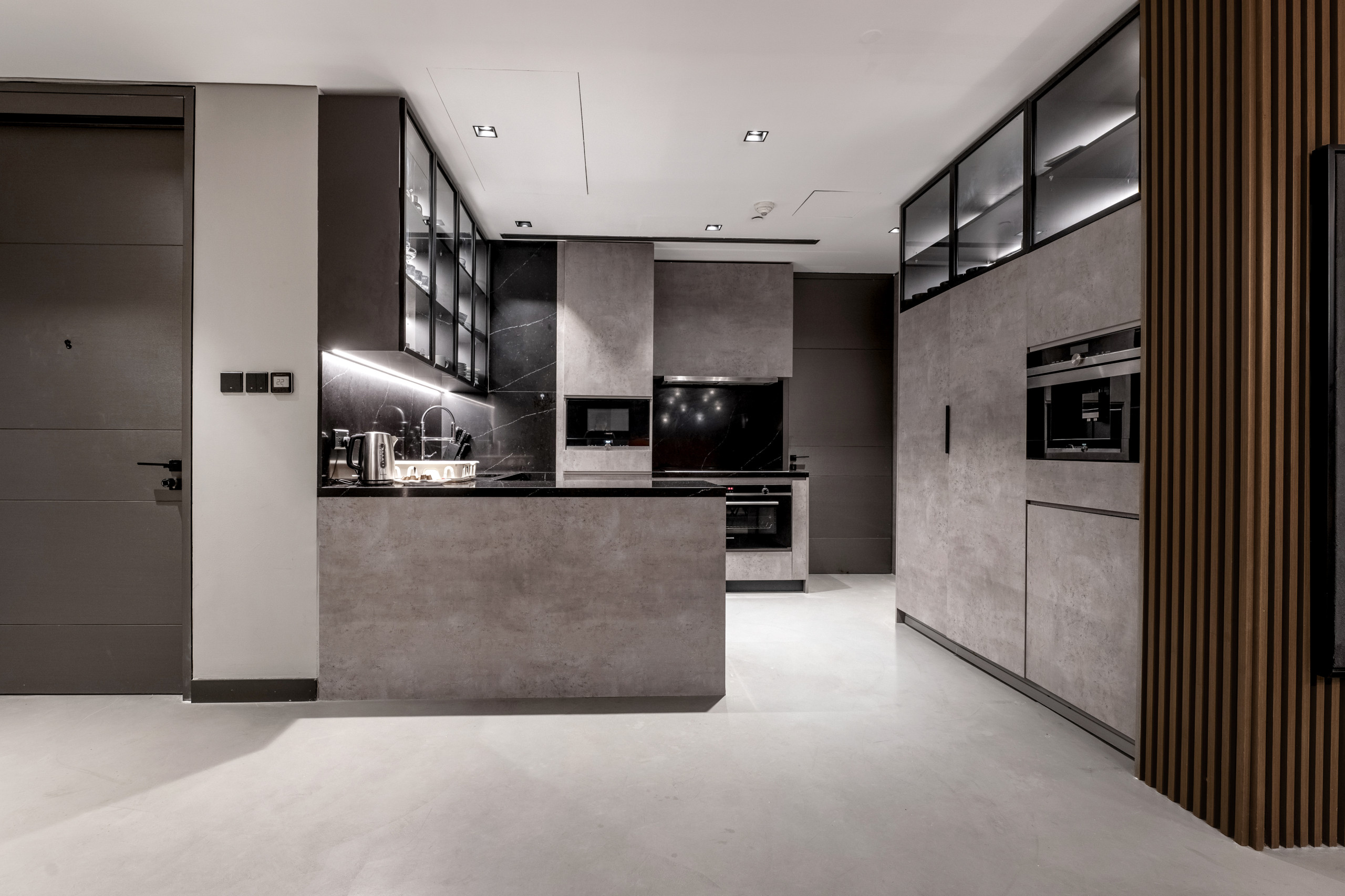 Styled with the same attention to detail as the master, the second, third, and fourth bedrooms each feature a king-size bed with premium linens and subtle color accents. The third room features a four-poster bed, enhancing its visual appeal. All three rooms are equipped with 40-inch TVs, side tables, and spacious wardrobes. Each has its own en-suite bathroom; the second includes a bathtub, while the others have walk-in showers. The penthouse also includes a maid’s quarters with an en-suite bathroom.