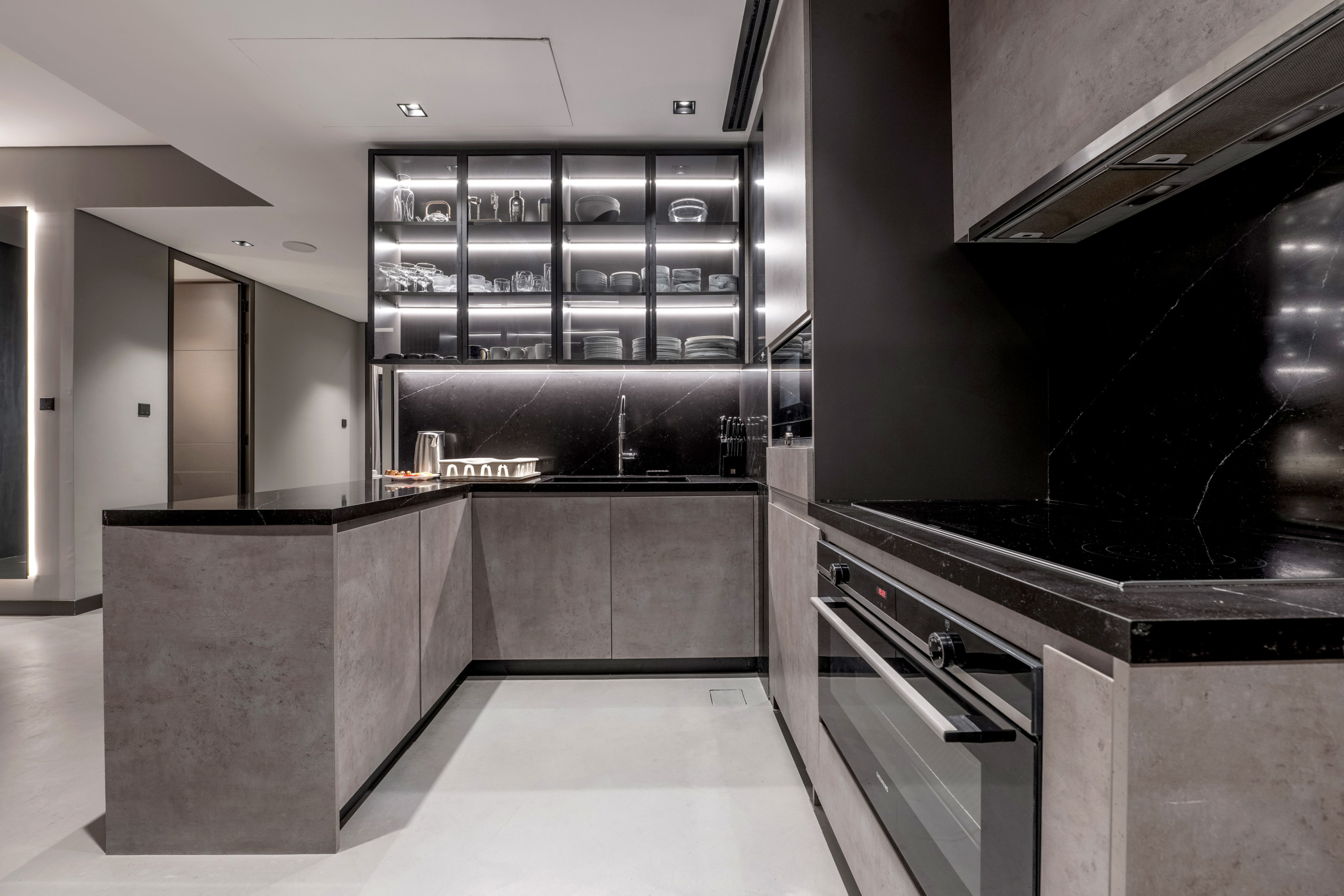 Framed by floor-to-ceiling windows, the living area opens to a private balcony with panoramic views of the sea and the iconic silhouette of Atlantis The Palm, calm during the day, dramatic at night. The balcony makes a statement with its stylish lounge setup, lush greenery, and subtle privacy features that give it the feel of an exclusive resort terrace, but it’s all yours. Inside, the living space is furnished with deep, comfortable seating, a marble coffee table, and a 79-inch smart TV. The adjacent dining area seats ten, positioned next to a full-sized grand piano, both a striking feature and fully functional for those who play. The closed kitchen is well-equipped with a gas stove and oven, full-size fridge, microwave, toaster, electric kettle, and Nespresso machine, ideal for daily meals or entertaining. A dishwasher and washing machine are also included, along with full Wi-Fi coverage throughout the penthouse.