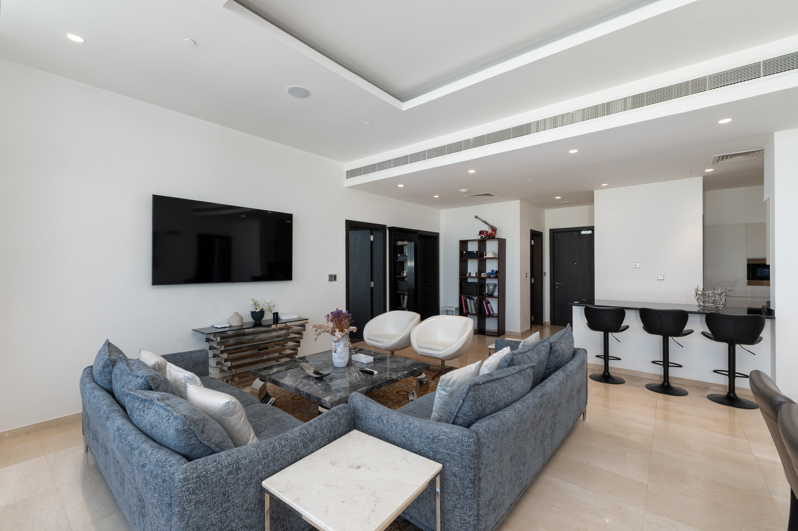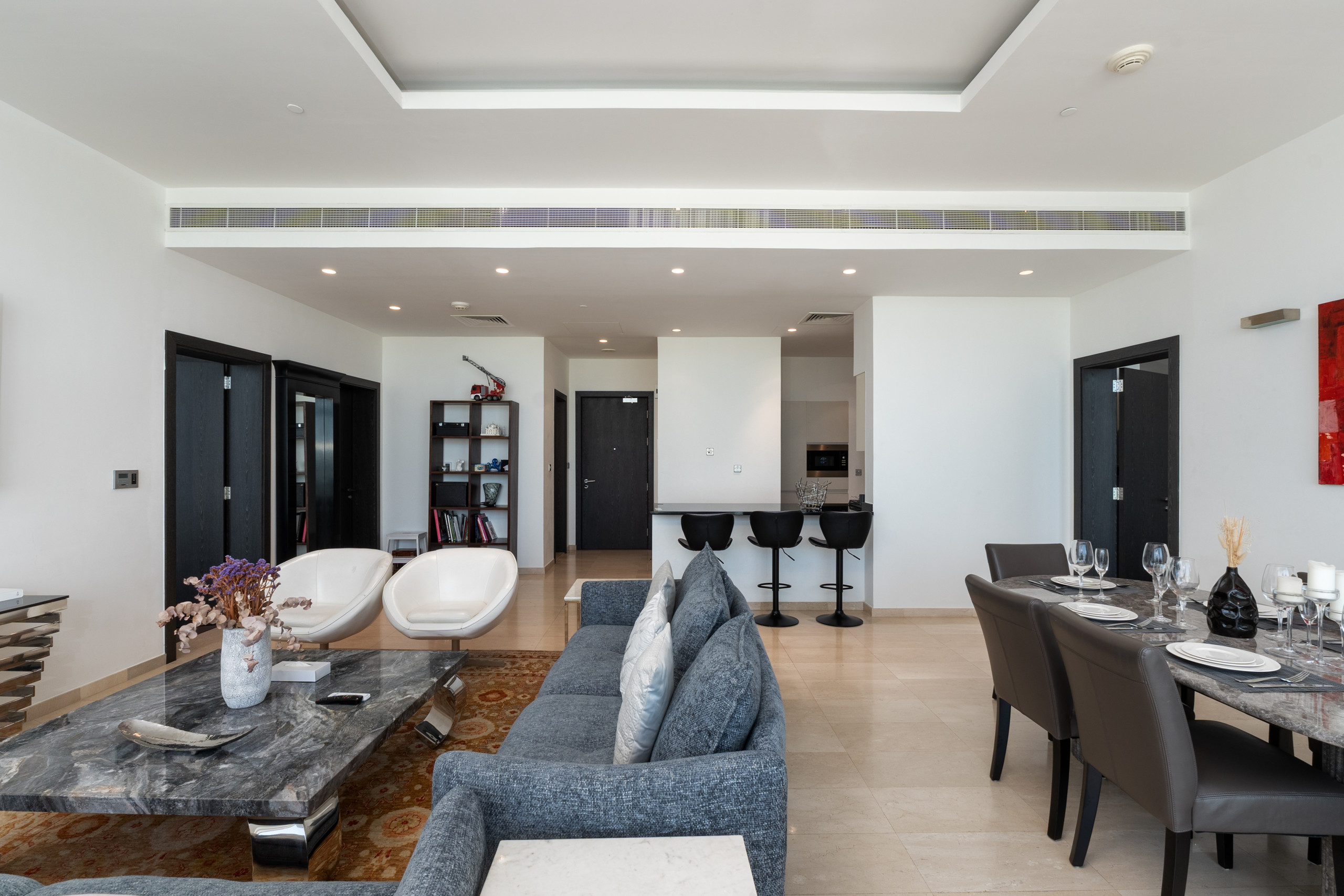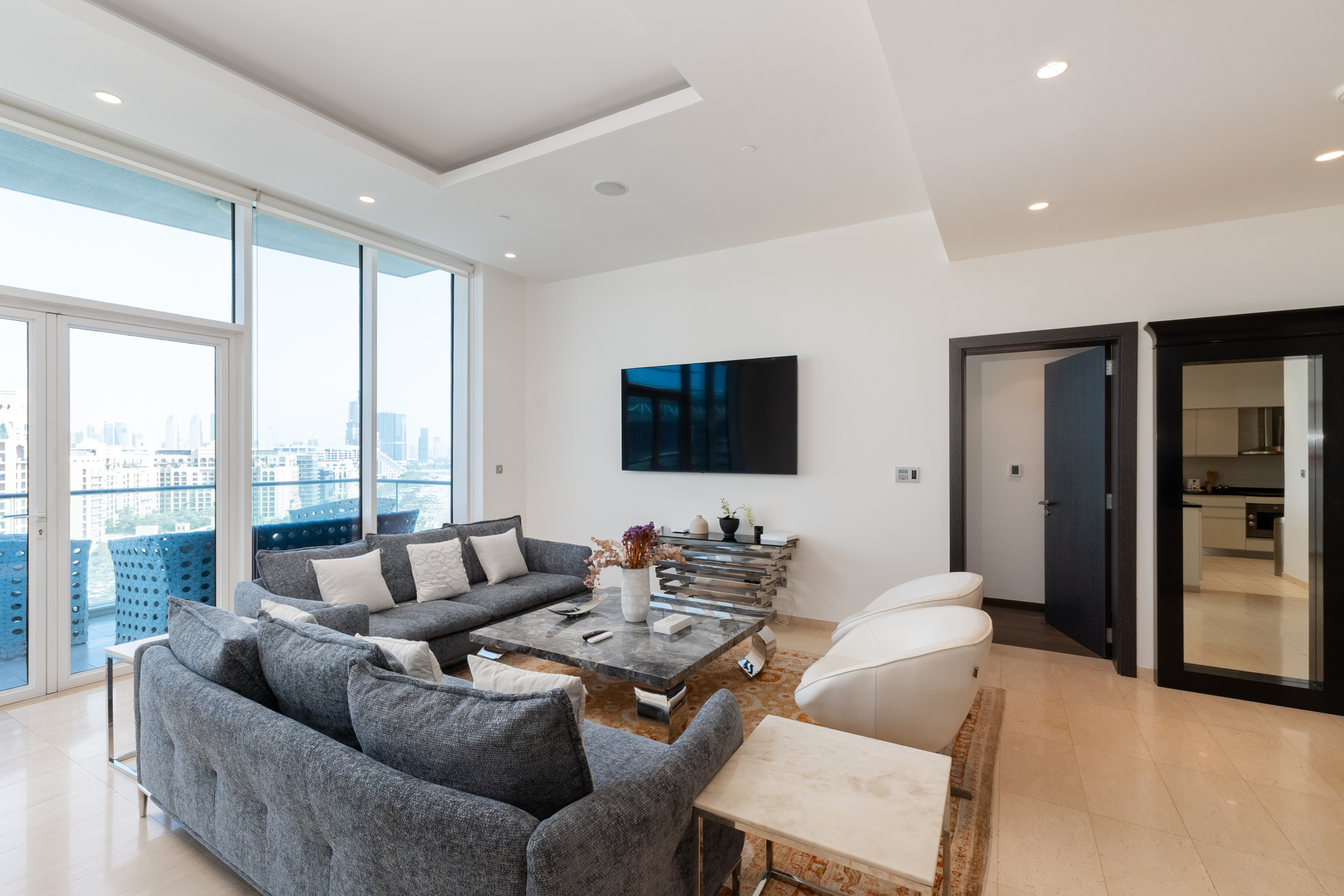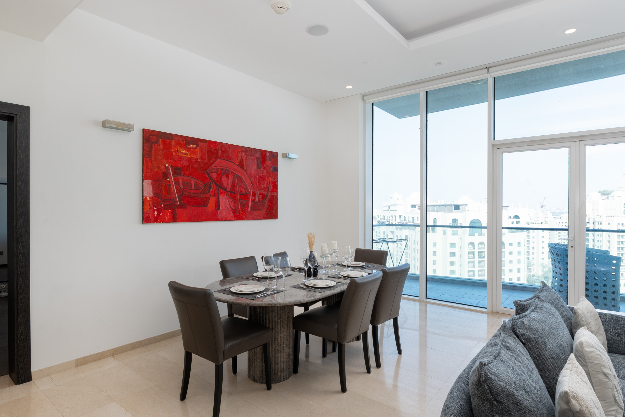 Step into this Palm Jumeirah apartment, and you'll find a cozy living room decked out with a comfy sofa, a classy marble coffee table, and stylish decor. It's the perfect place to kick back with your loved ones or unwind after a day of adventure. And if you're up for more than just watching movies, head out to the roomy balcony. There, you can sip your coffee while soaking in some sea views – it's a real treat. Now, let's talk about the kitchen. It's got all the modern appliances you need: a fridge, electric stove, oven, microwave, toaster, electric kettle, and even a Nespresso machine for your coffee cravings. Plus, keeping things clean is a breeze, thanks to the dishwasher and washing machine at your service. When mealtime rolls around, a dining table that seats six is ready and waiting, complete with all the dishes and utensils you need for a delightful dining experience.