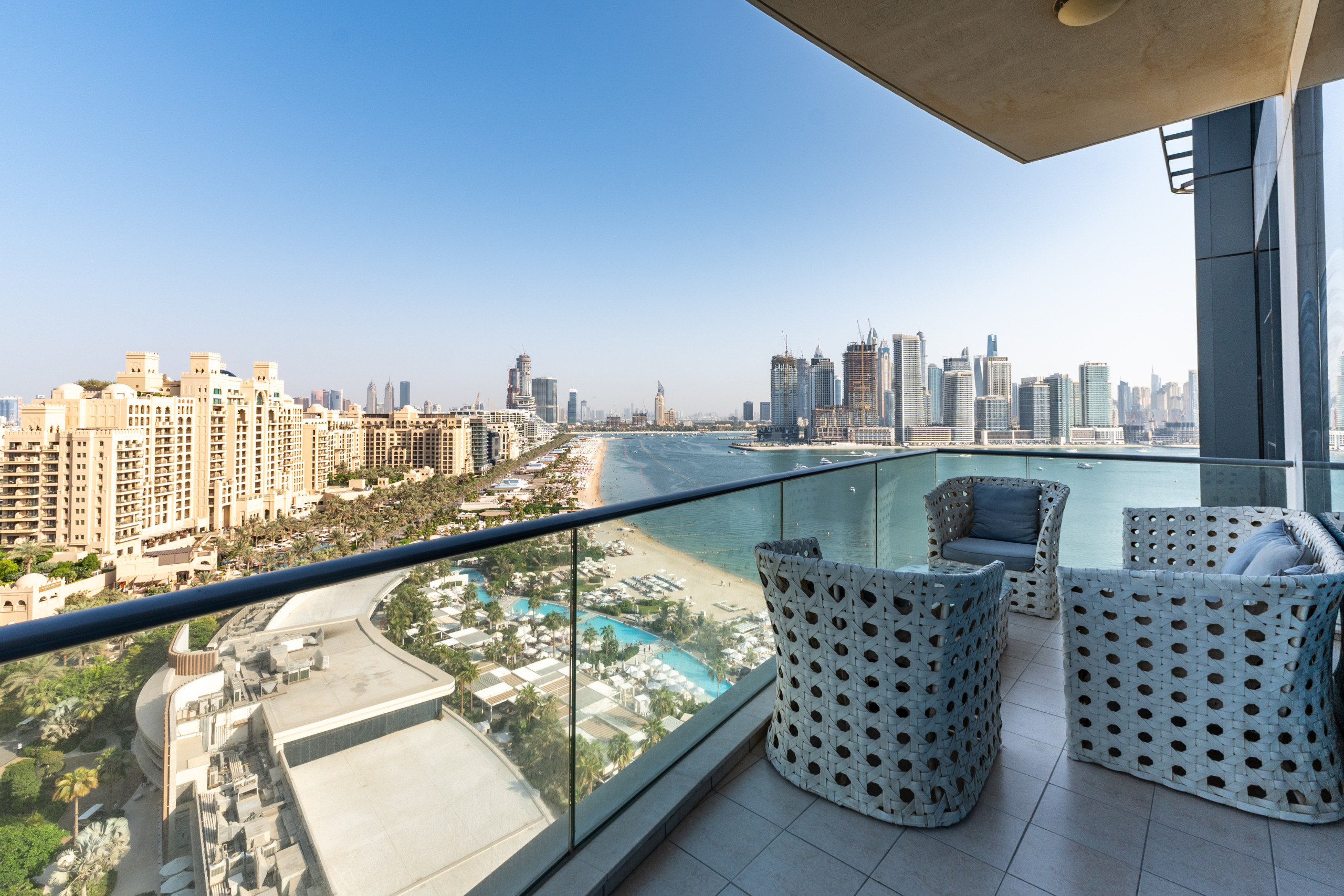 Whether it’s the sea, the pool, or the skyline, the views from this 2-bedroom apartment are hard to beat. Begin your day with coffee on the balcony, then enjoy private beach access. When you’re ready for more Palm Jumeirah, JBR and Dubai Marina are nearby offering options like dining at Nobu, thrills at Aquaventure Waterpark, or the ultimate adventure with Skydive Dubai.