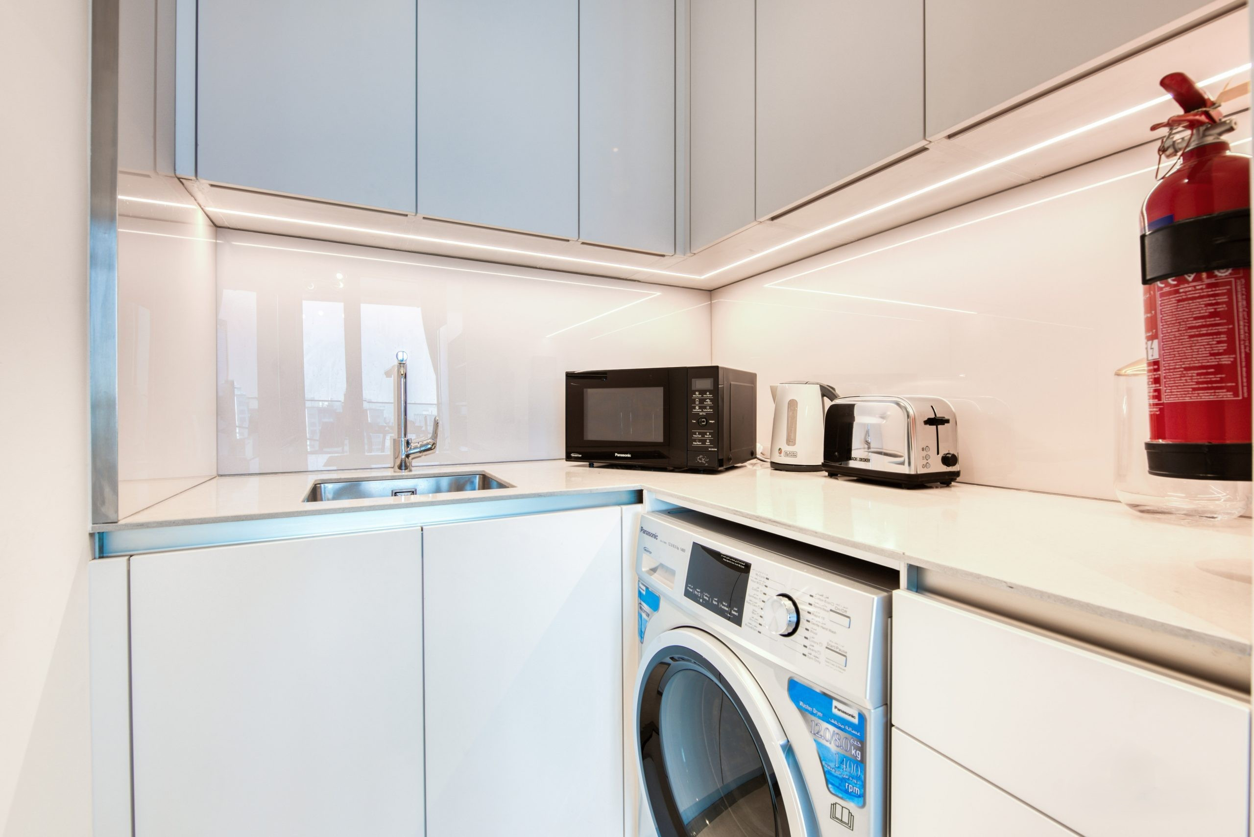 The living room is bright and welcoming, with large windows that frame stunning views of the Marina. Whether you want to catch up on your favorite Netflix series or just sit back and enjoy the view, this is the spot. The kitchen is stocked with all the basics for cooking, and when you’re done, cleaning up is easy with the dishwasher. There’s also a washing machine and fast Wi-Fi to keep things simple.