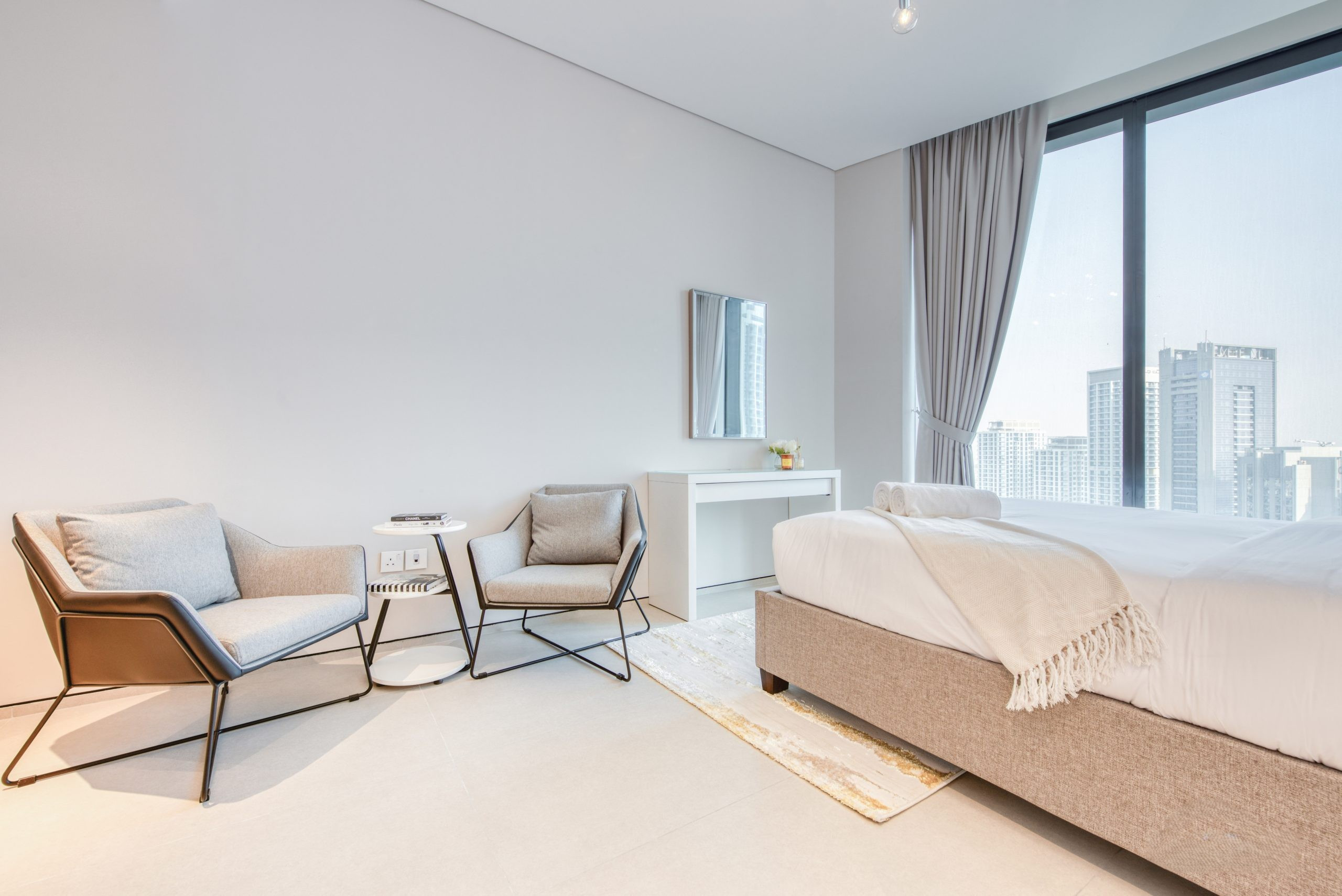 Treat yourself to the lap of luxury in the master suite, where you'll find a king-size bed adorned with bedside tables and soft, ambient lighting courtesy of elegant lamps. The fully adorned windows not only grant access to a private city view but also allow the natural daylight to flood the room. You won't have to worry about storage either, as fitted wardrobes stand ready to house all your holiday necessities.
