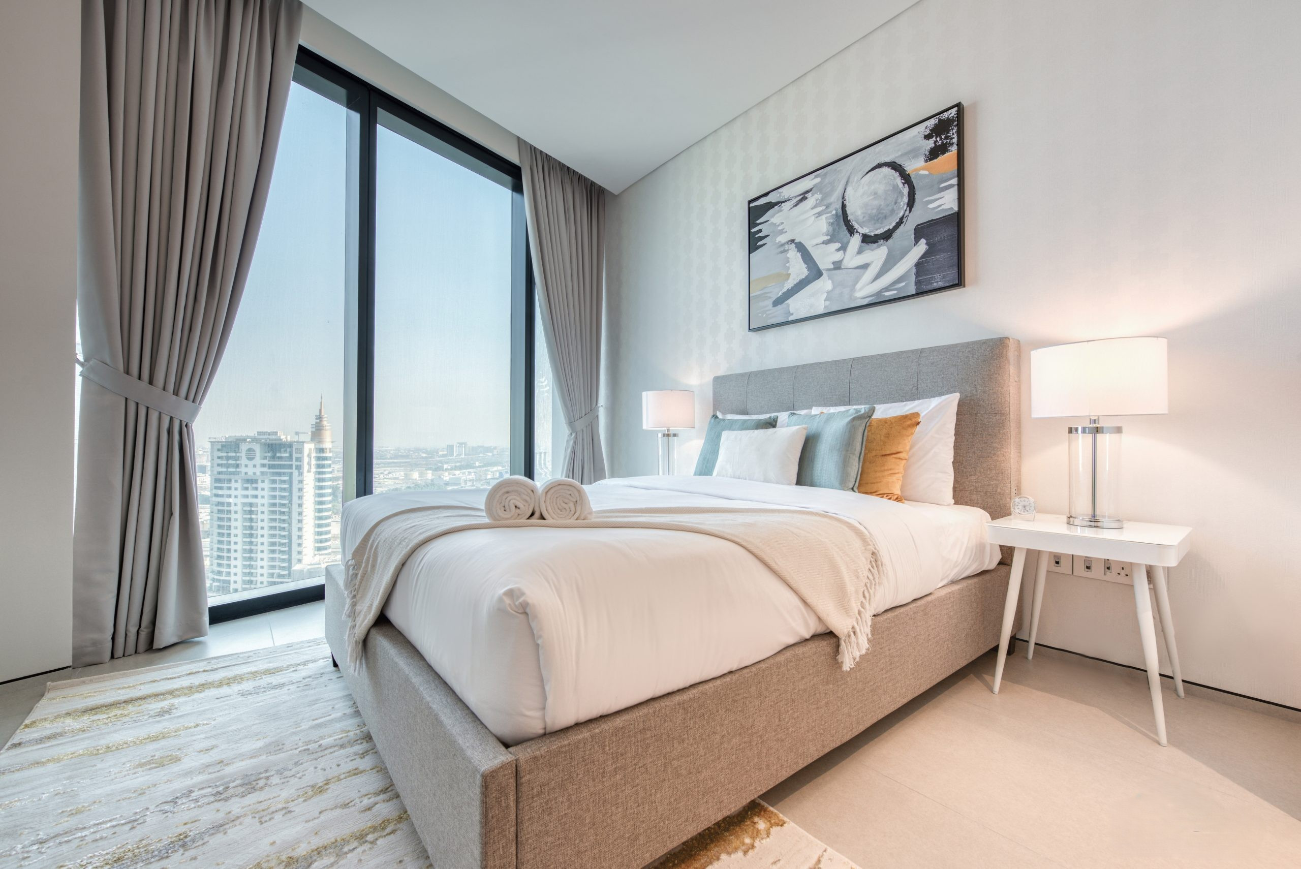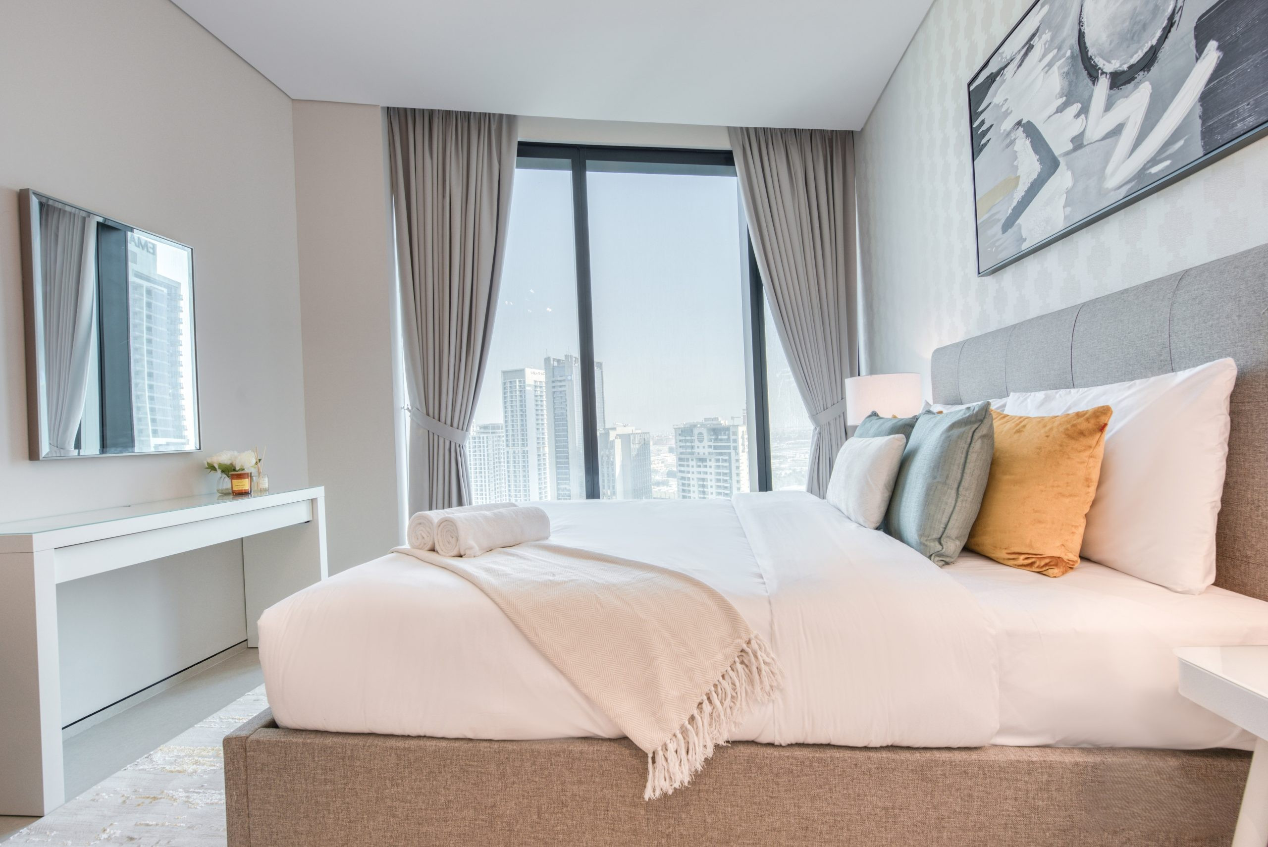 The master suite is a quiet escape from the city’s buzz, centered around a King-sized bed with a plush grey headboard and vivid accent pillows. A dedicated white-gloss vanity sits against the window, providing an inspiring spot for your morning routine with a view of the skyline. The room leads into a spa-like ensuite bathroom with a deep soaking tub, complemented by a separate powder room in the hallway to keep your private sanctuary exclusive.