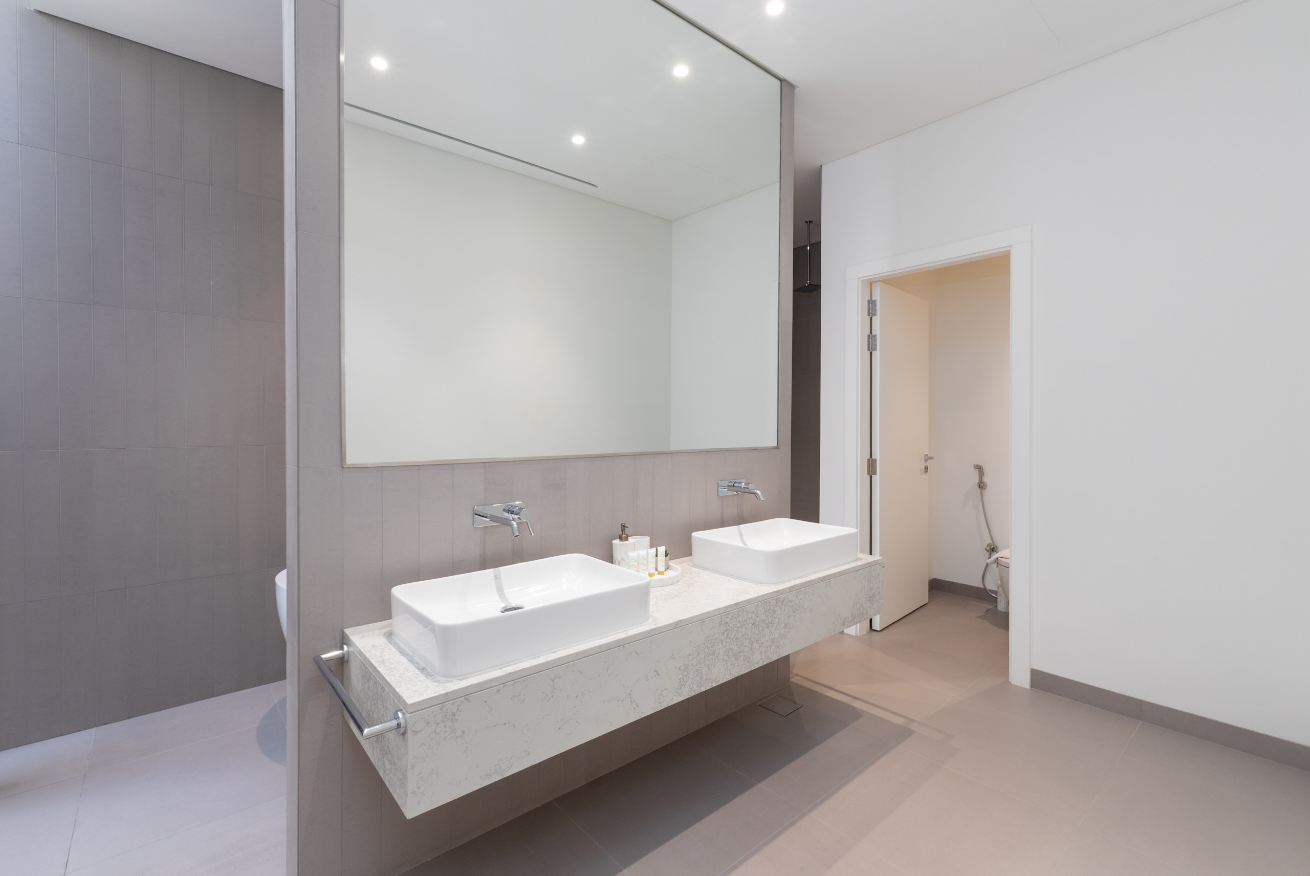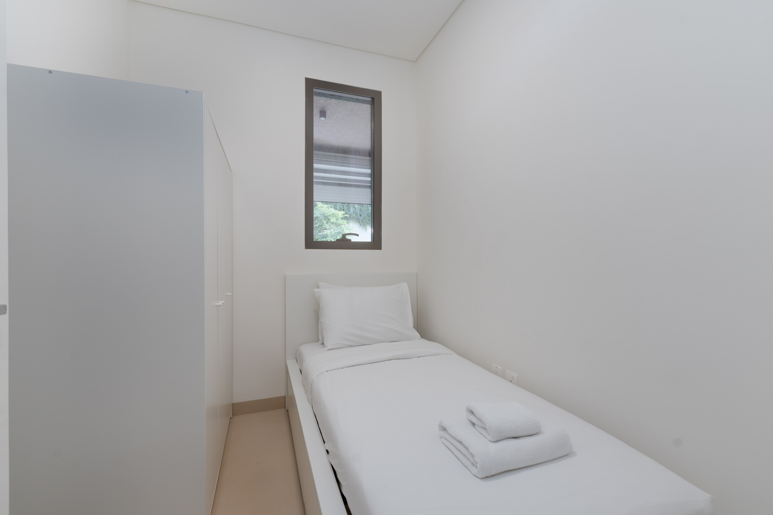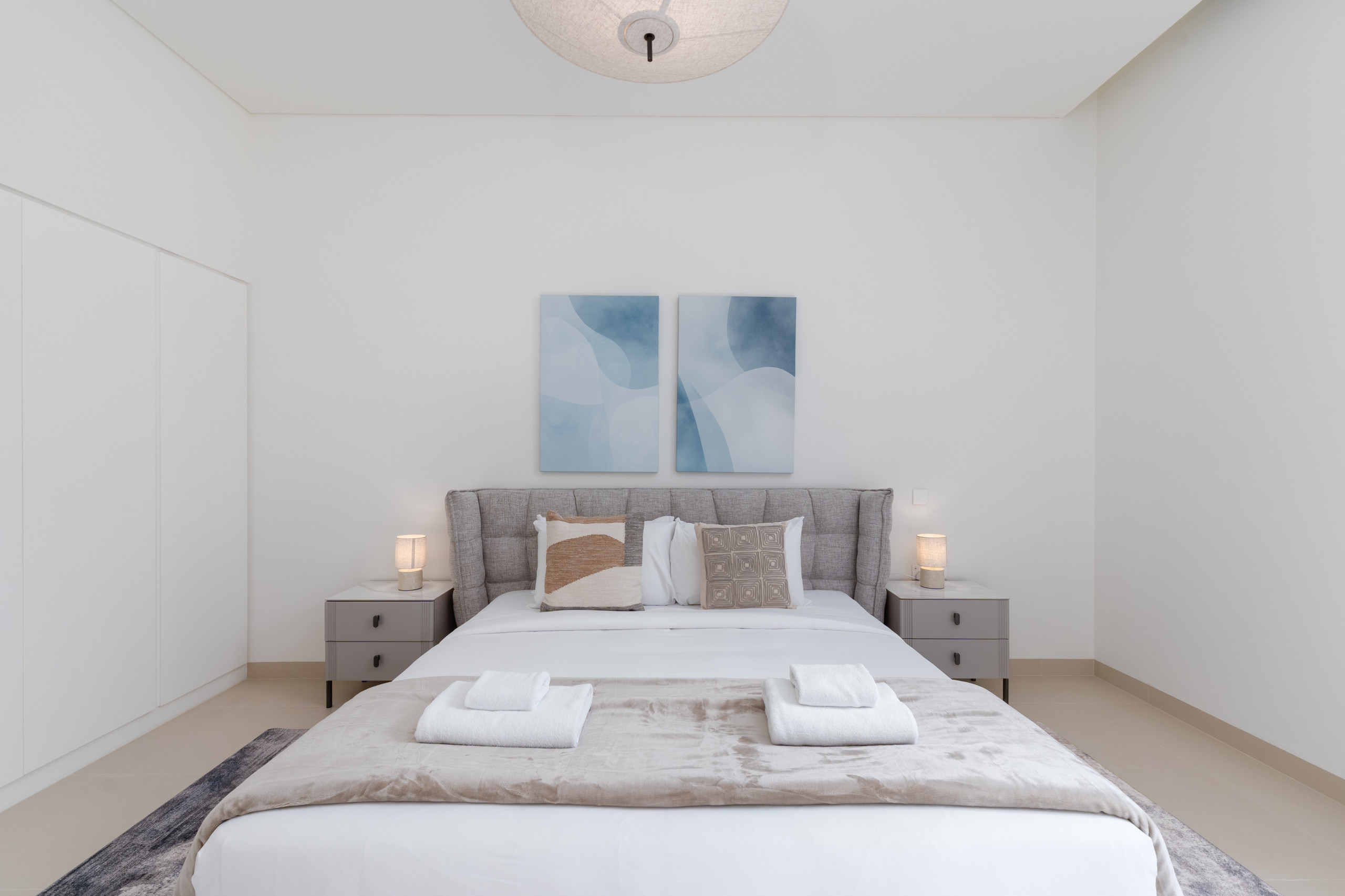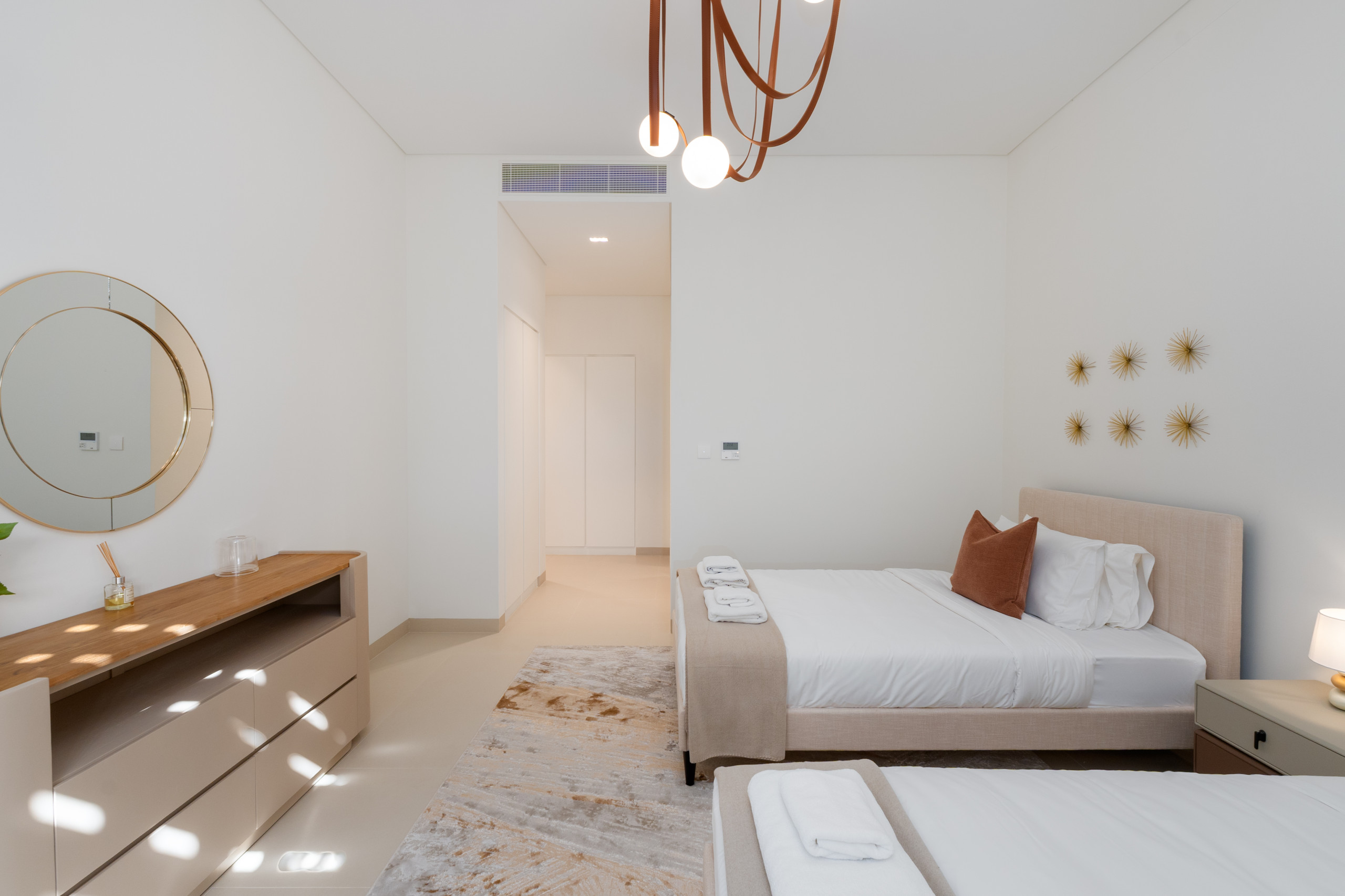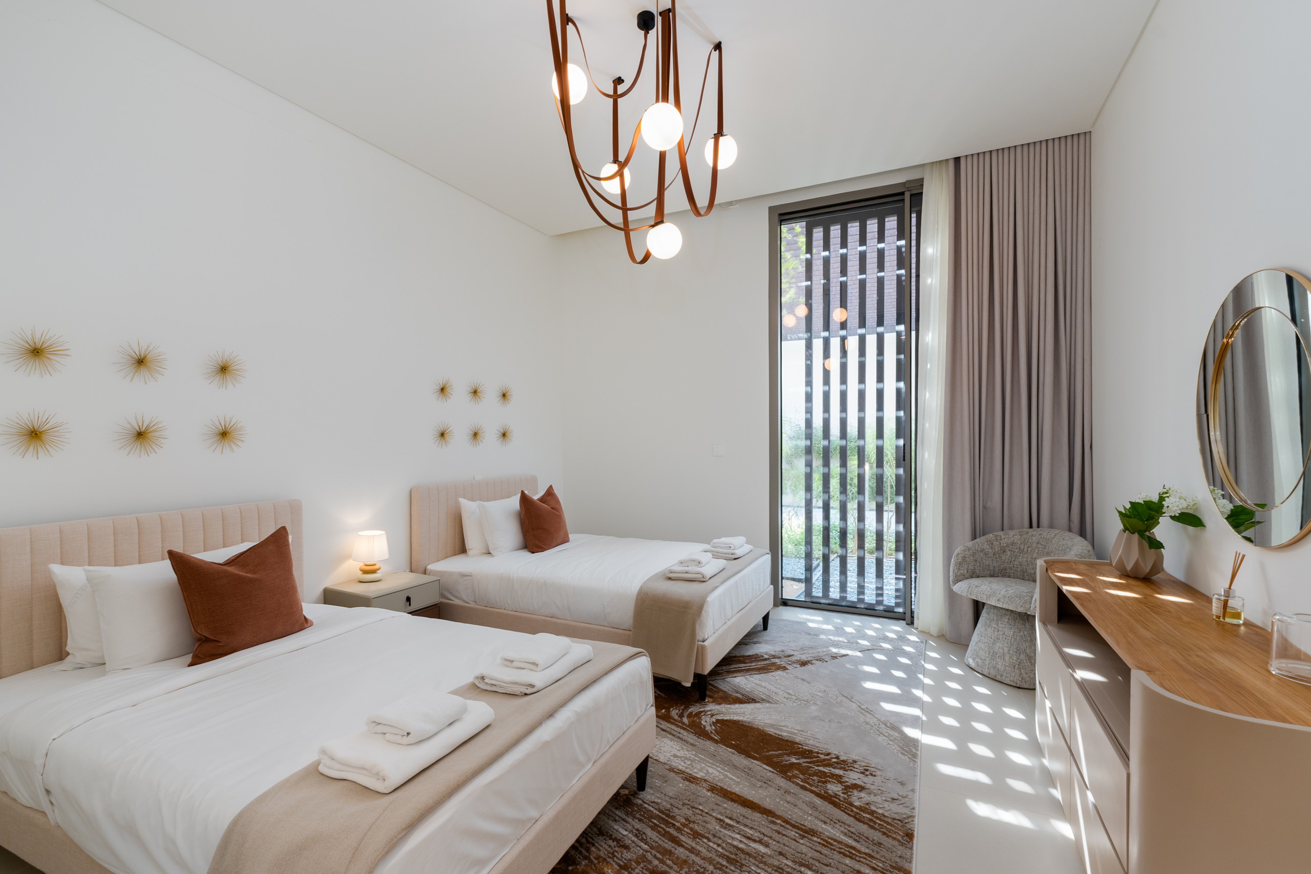 The second and third bedrooms are furnished with comfortable king-size beds, while the fourth bedrooms offer flexibility with two cozy single beds. All bedrooms feature generous floor-to-ceiling sliding doors, bedside tables, roomy wardrobes, and private ensuite bathrooms with refreshing showers, ensuring every guest has a serene and convenient space.