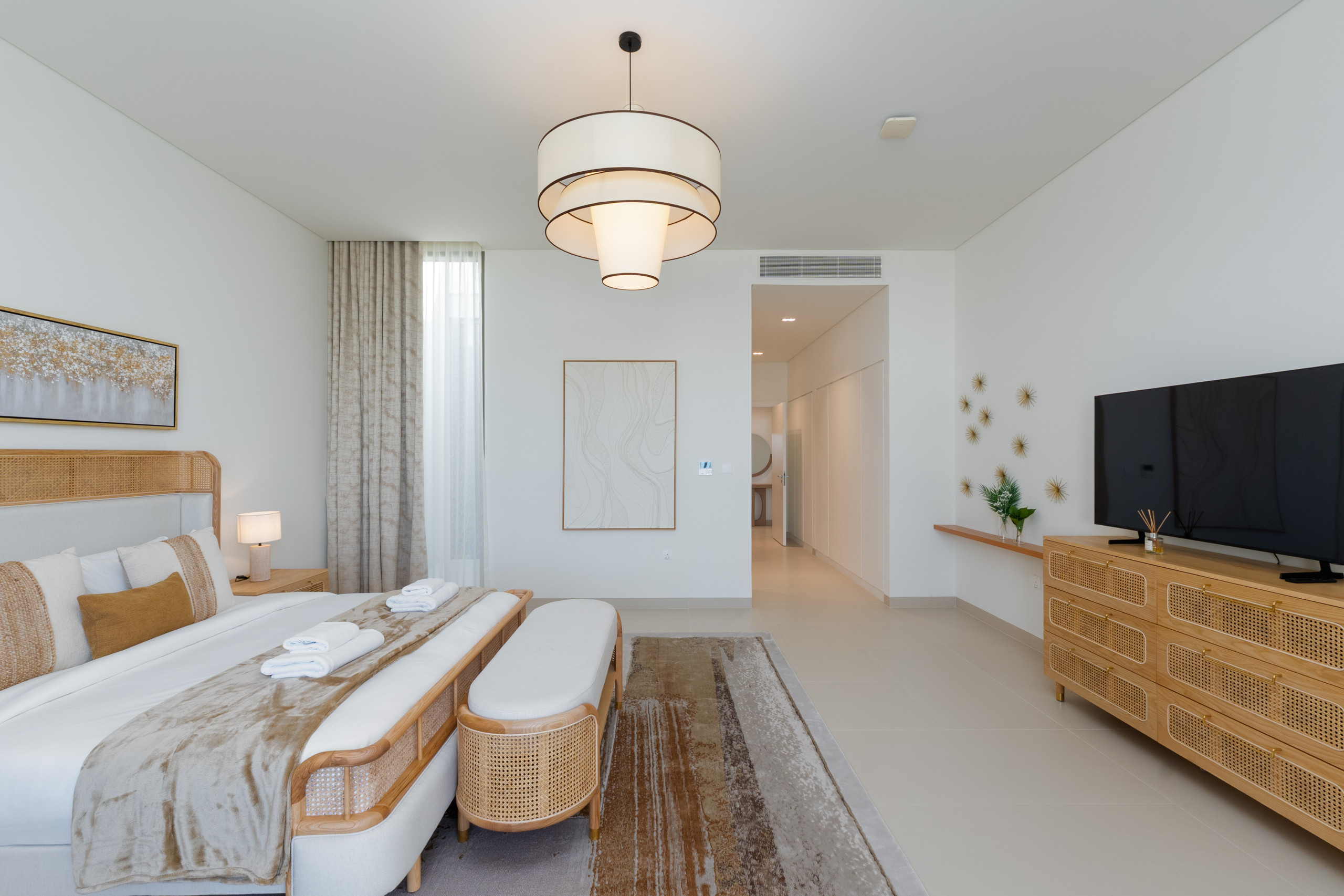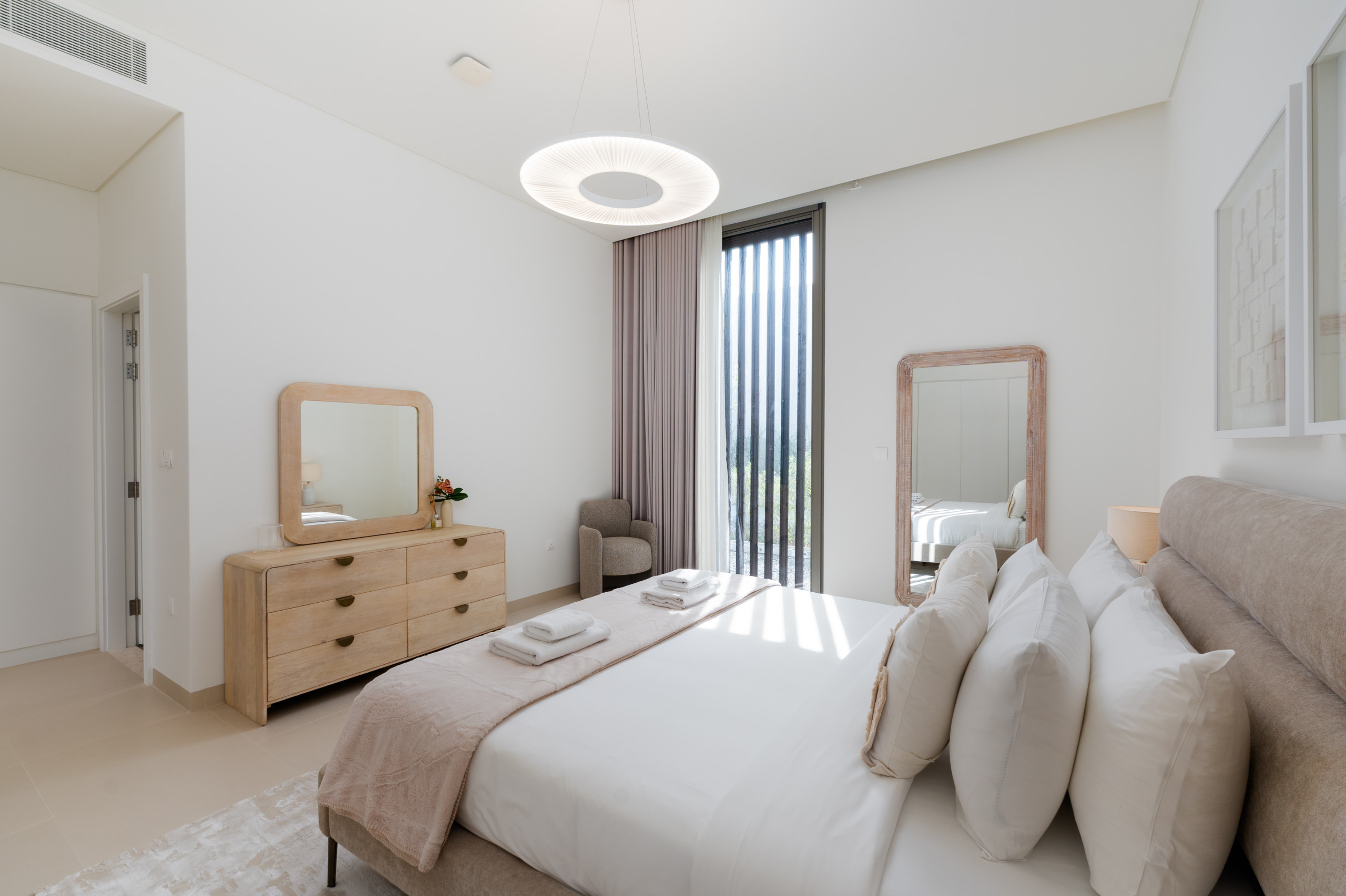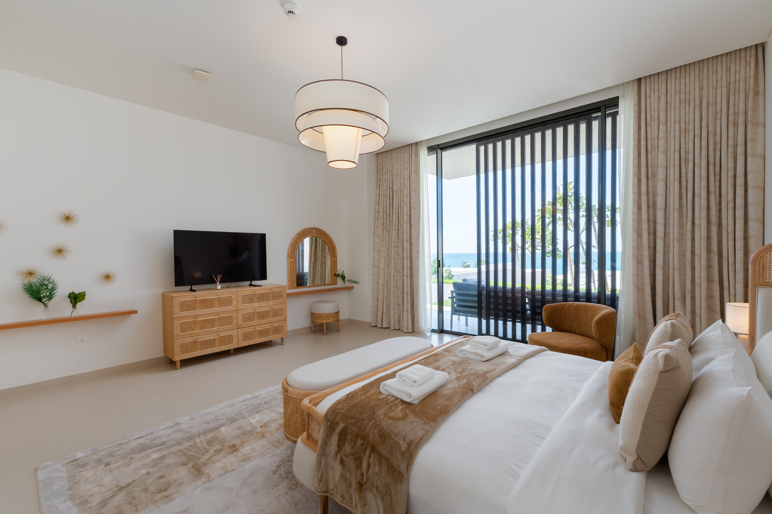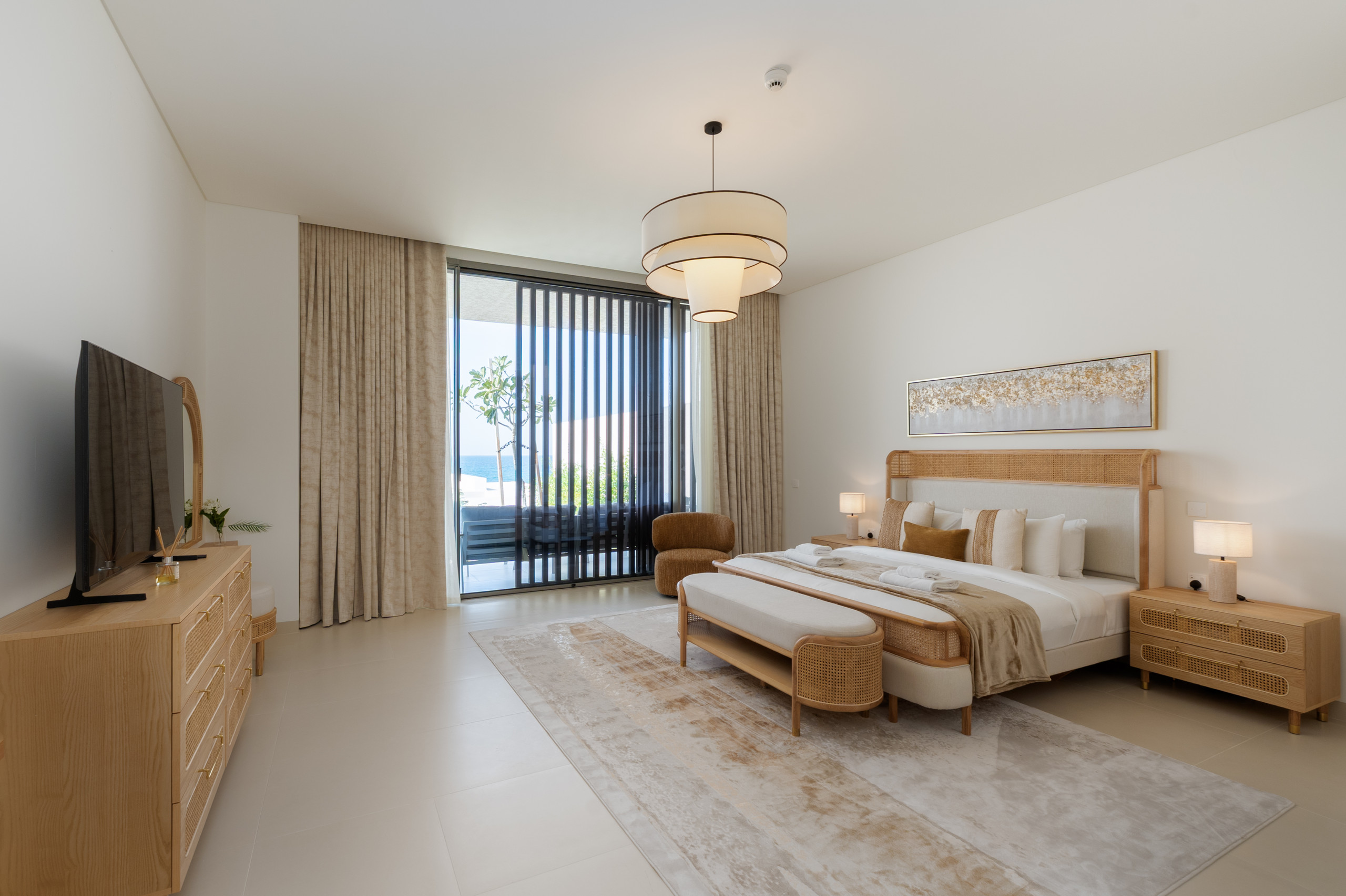 The master suite is a sunlit, tranquil haven that perfectly embodies coastal elegance. A stylish king-sized bed, framed by rattan and light wood accents, anchors the space, featuring a matching bench at the foot and ample natural light from the oversized windows. Large sliding doors open directly to the terrace, offering you a private balcony retreat and breathtaking sea views without leaving your bed. Thoughtful storage is provided by the roomy dresser and wardrobe, and the serene ensuite bathroom is finished with modern dual sinks, a luxurious soaking bathtub, and a revitalizing shower, providing the perfect spot to unwind after a long day in the sun.