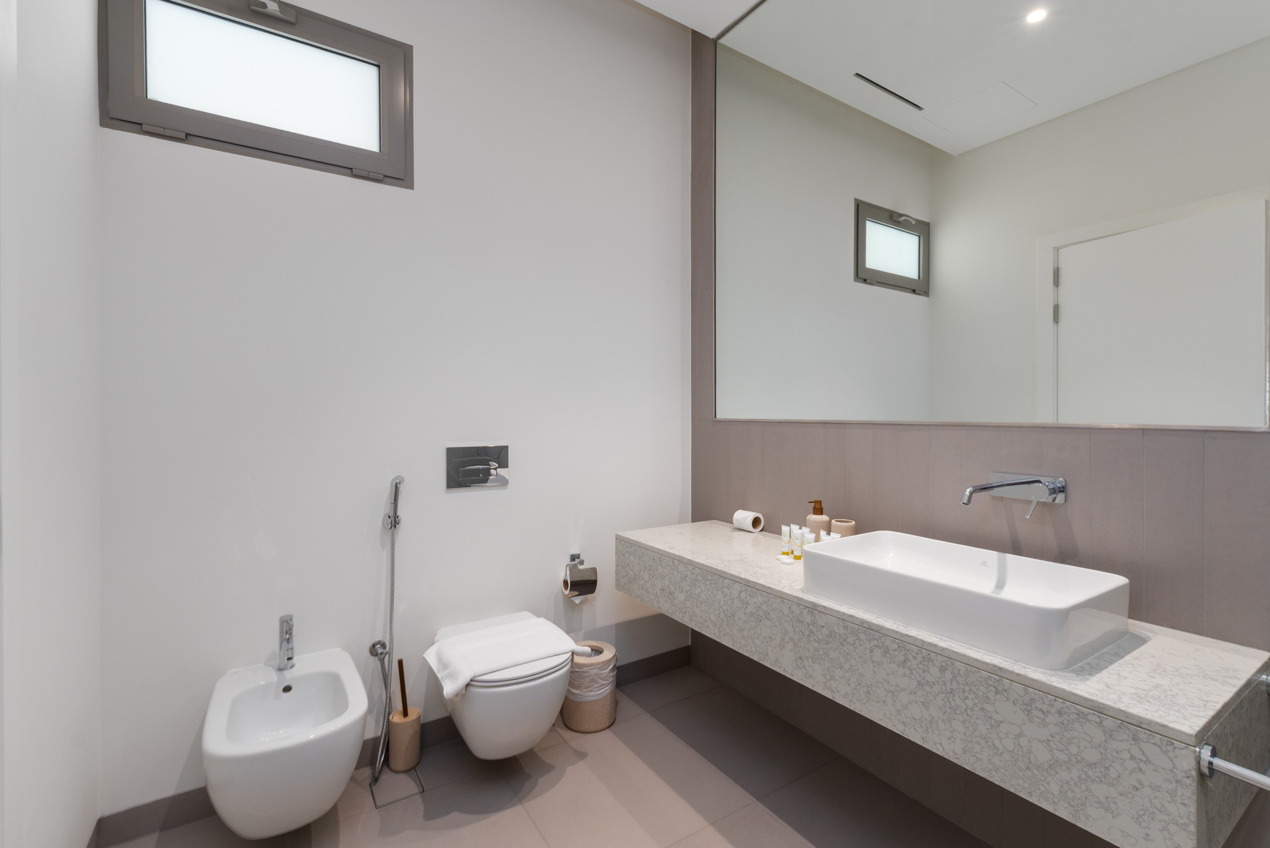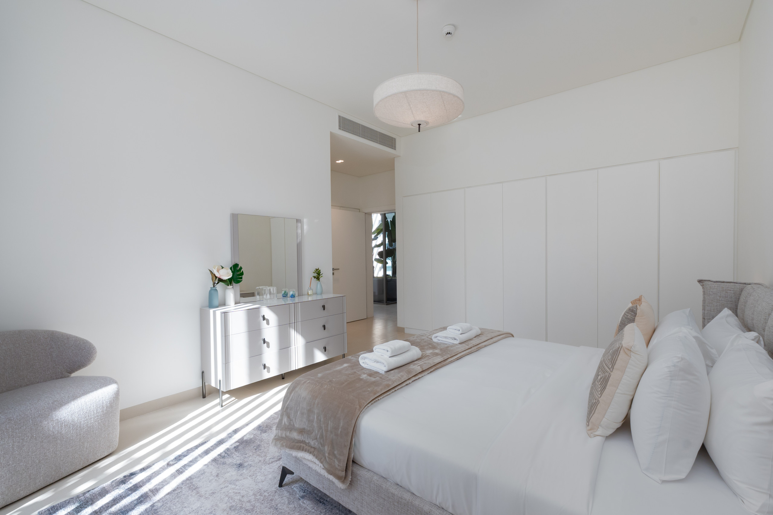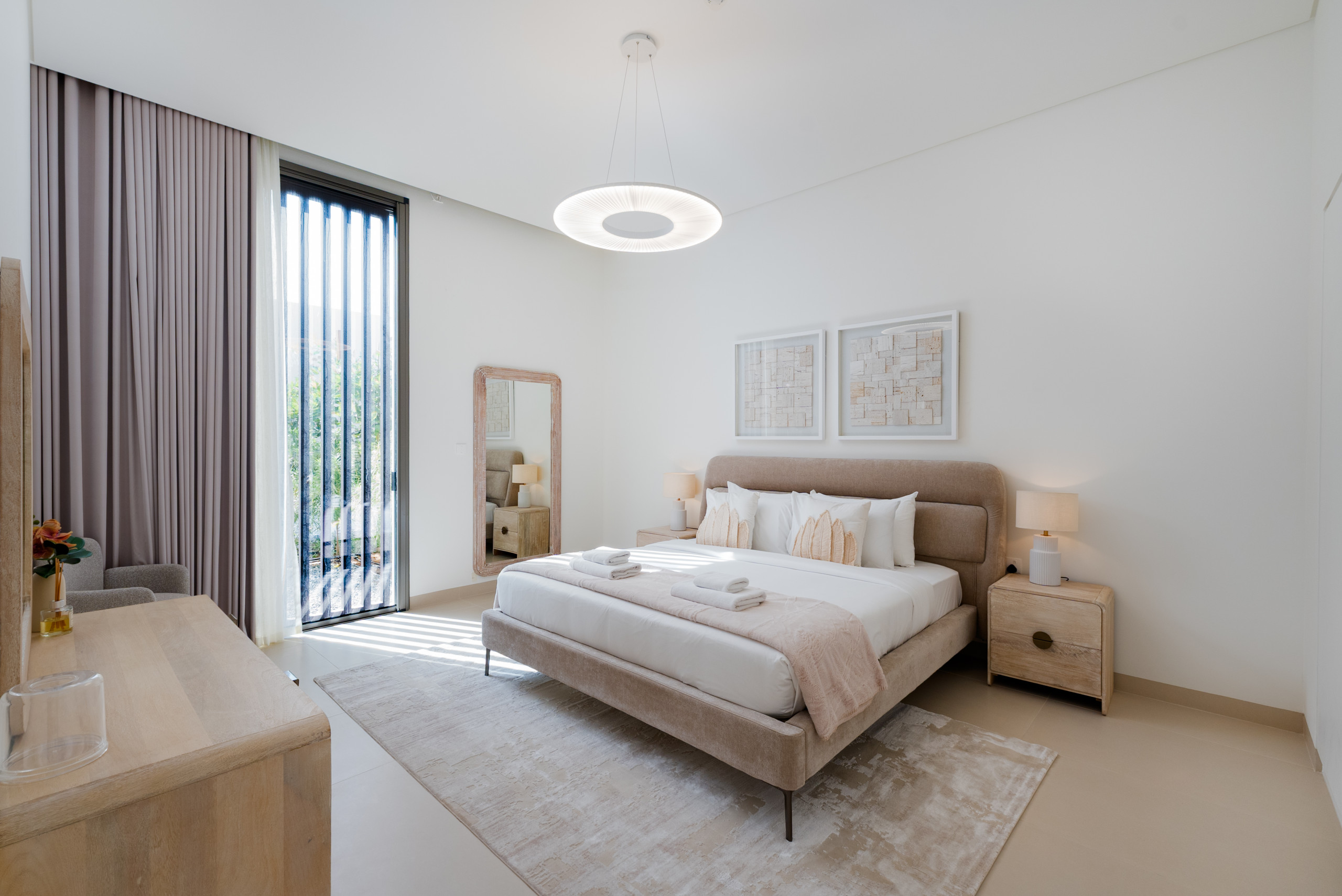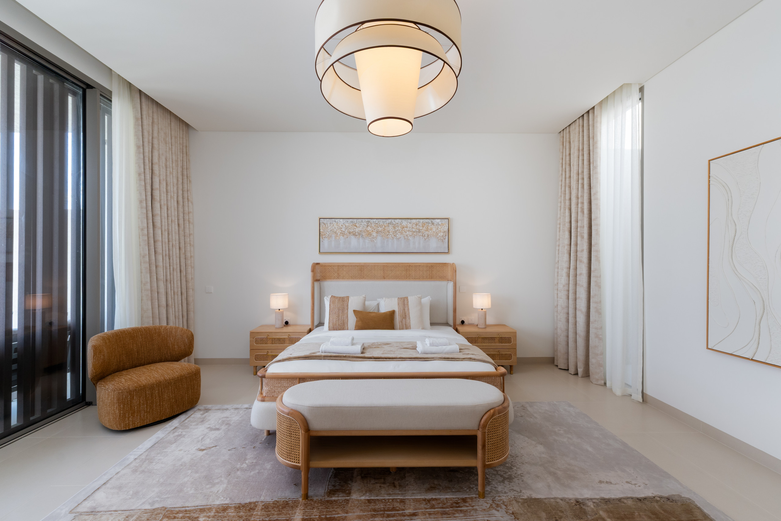The master suite is a sunlit, tranquil haven that perfectly embodies coastal elegance. A stylish king-sized bed, framed by rattan and light wood accents, anchors the space, featuring a matching bench at the foot and ample natural light from the oversized windows. Large sliding doors open directly to the terrace, offering you a private balcony retreat and breathtaking sea views without leaving your bed. Thoughtful storage is provided by the roomy dresser and wardrobe, and the serene ensuite bathroom is finished with modern dual sinks, a luxurious soaking bathtub, and a revitalizing shower, providing the perfect spot to unwind after a long day in the sun.