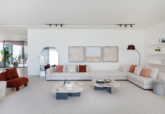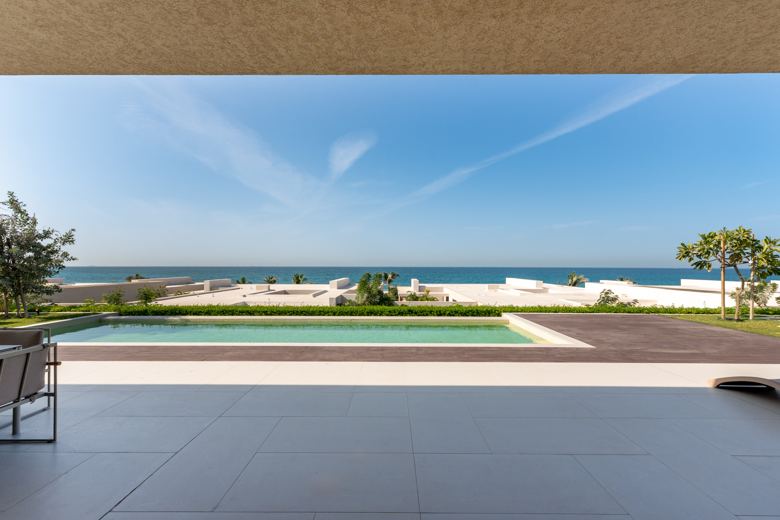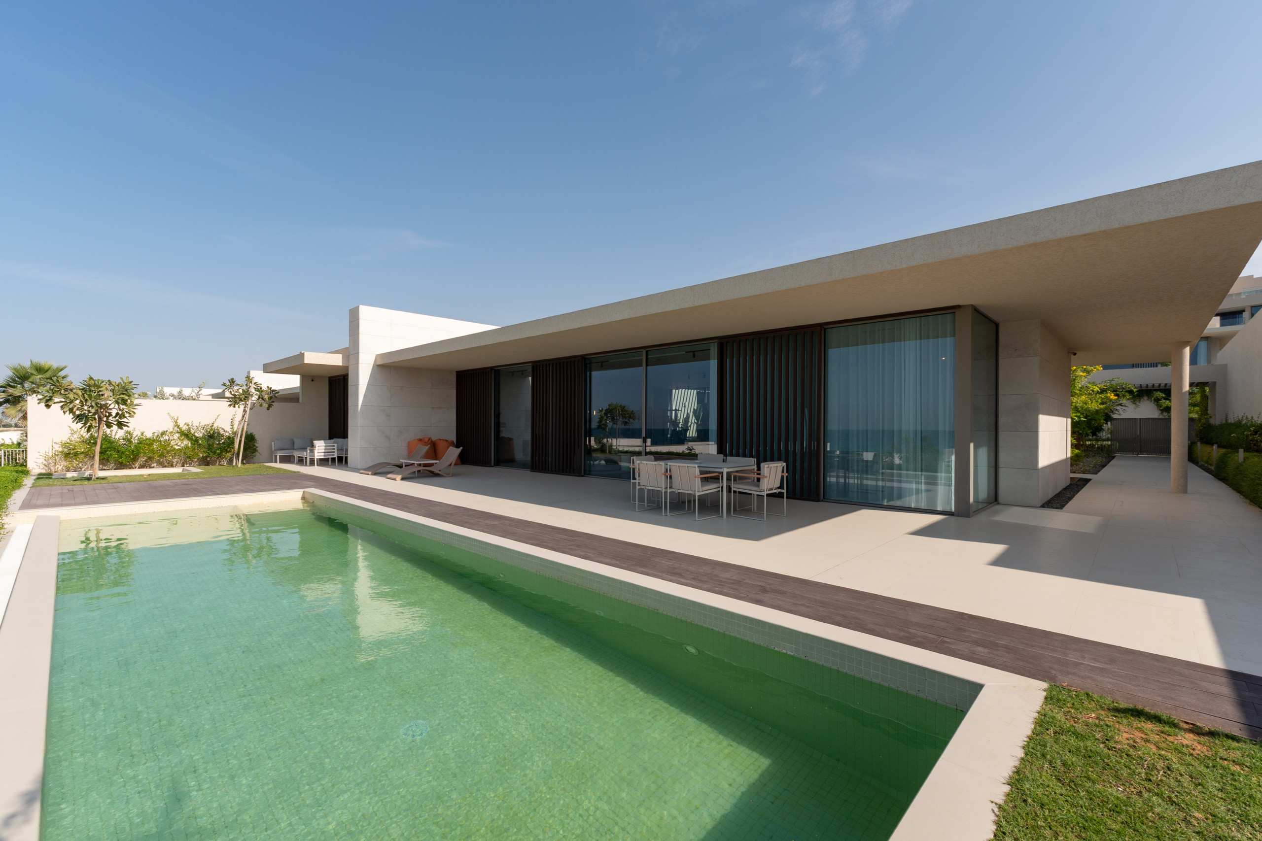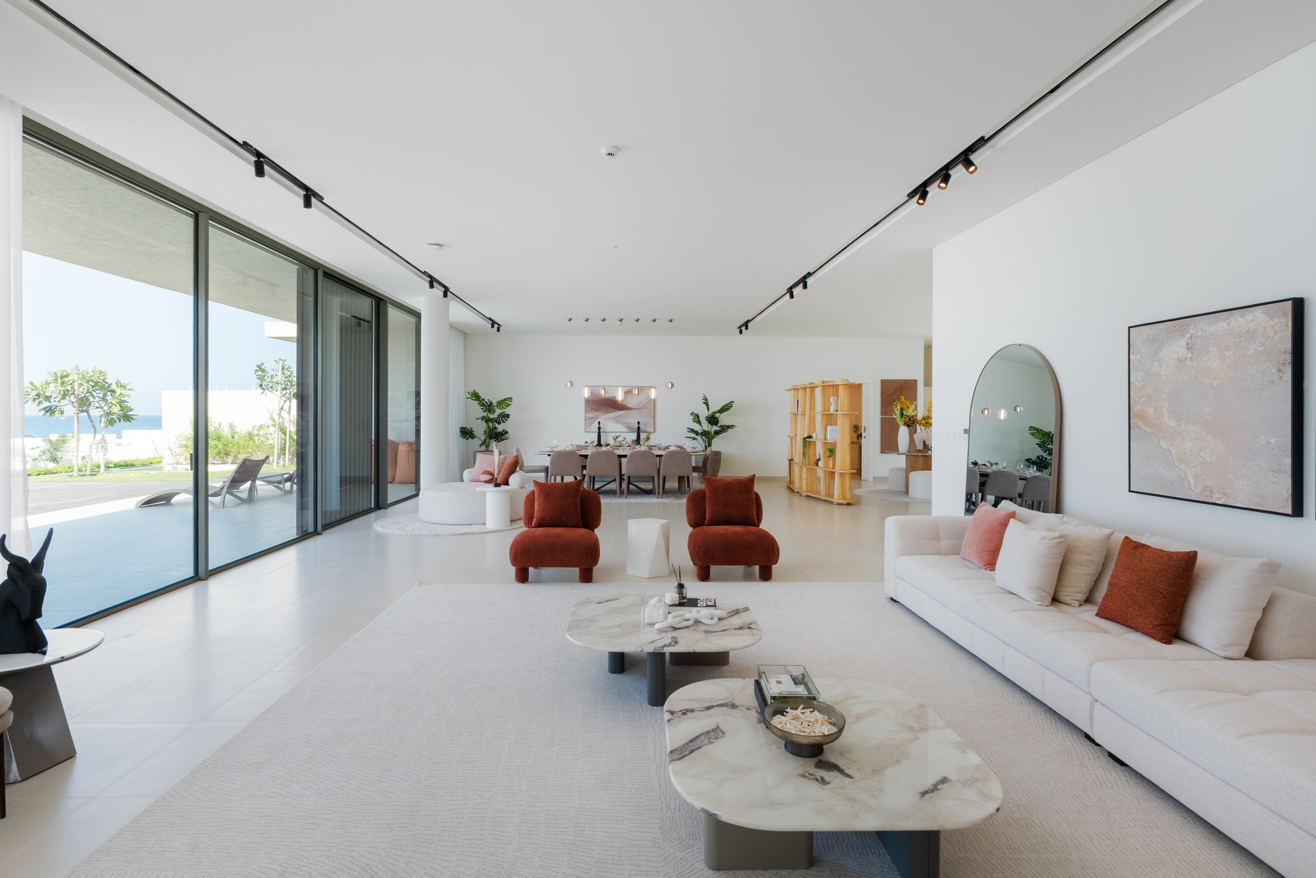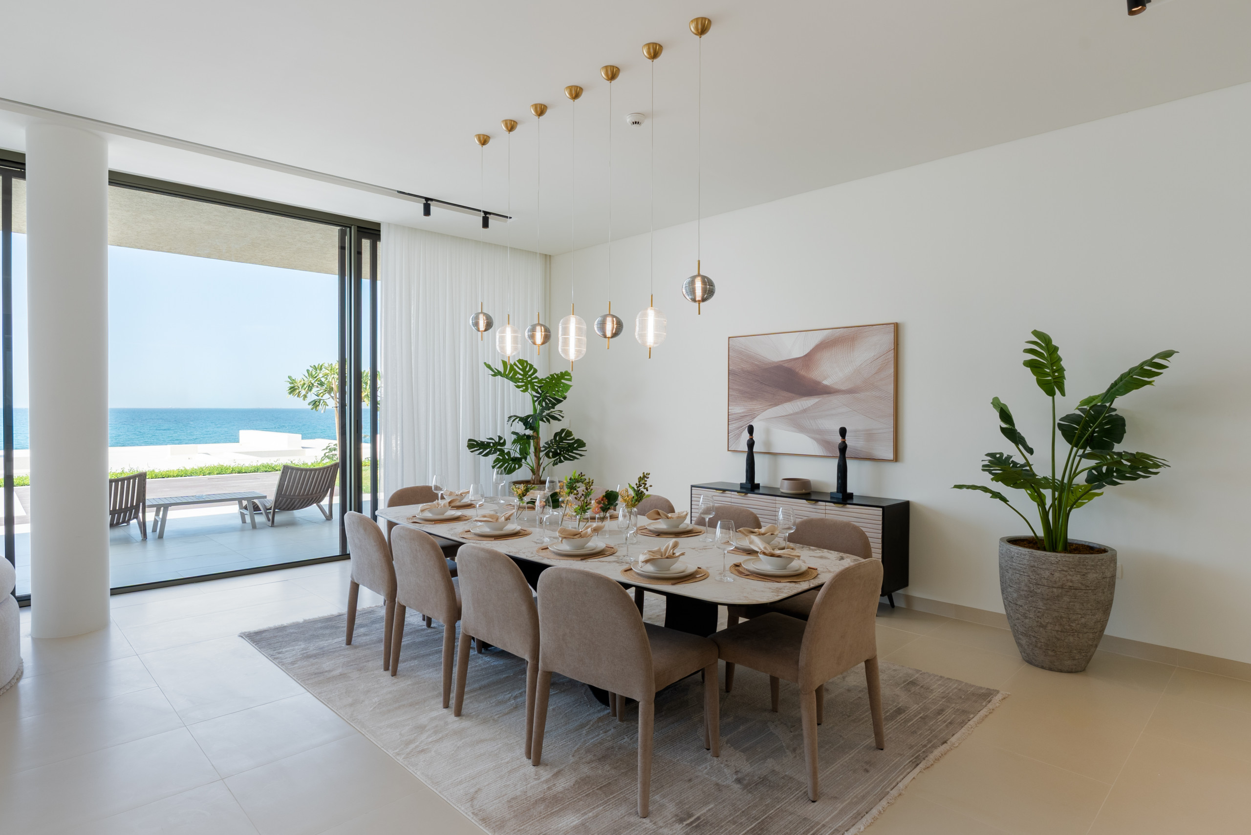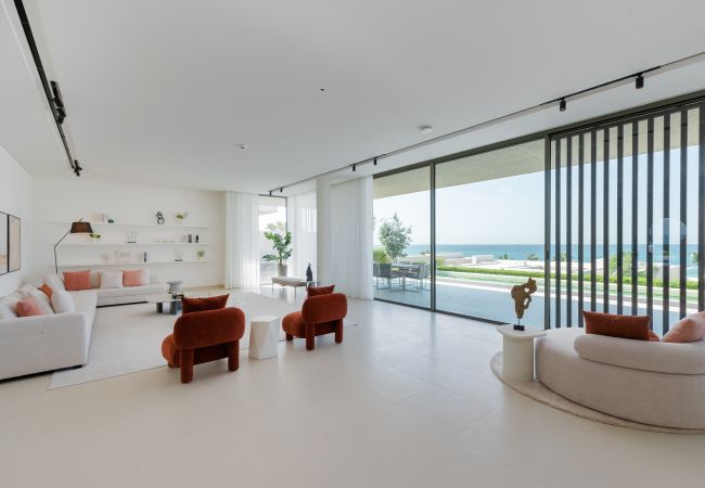Indulge in an exclusive lifestyle the moment you enter this villa’s vast, light-drenched living space, where stunning sea views and floor-to-ceiling glass lead seamlessly onto the private terrace and pool area. Designed for both grand entertaining and everyday relaxation, the home features a dedicated ten-seat dining area separate from the kitchen, while the sleek chef’s kitchen, anchored by a modern bar, opens directly onto a unique, glass-enclosed indoor garden that serves as a calming architectural centerpiece. A cozy second lounge offers the perfect setting for movie nights on the expansive 55” TV, and for ultimate convenience, the villa is fully equipped with essential appliances including a washing machine, along with high-speed Wi-Fi throughout the entire expansive home.