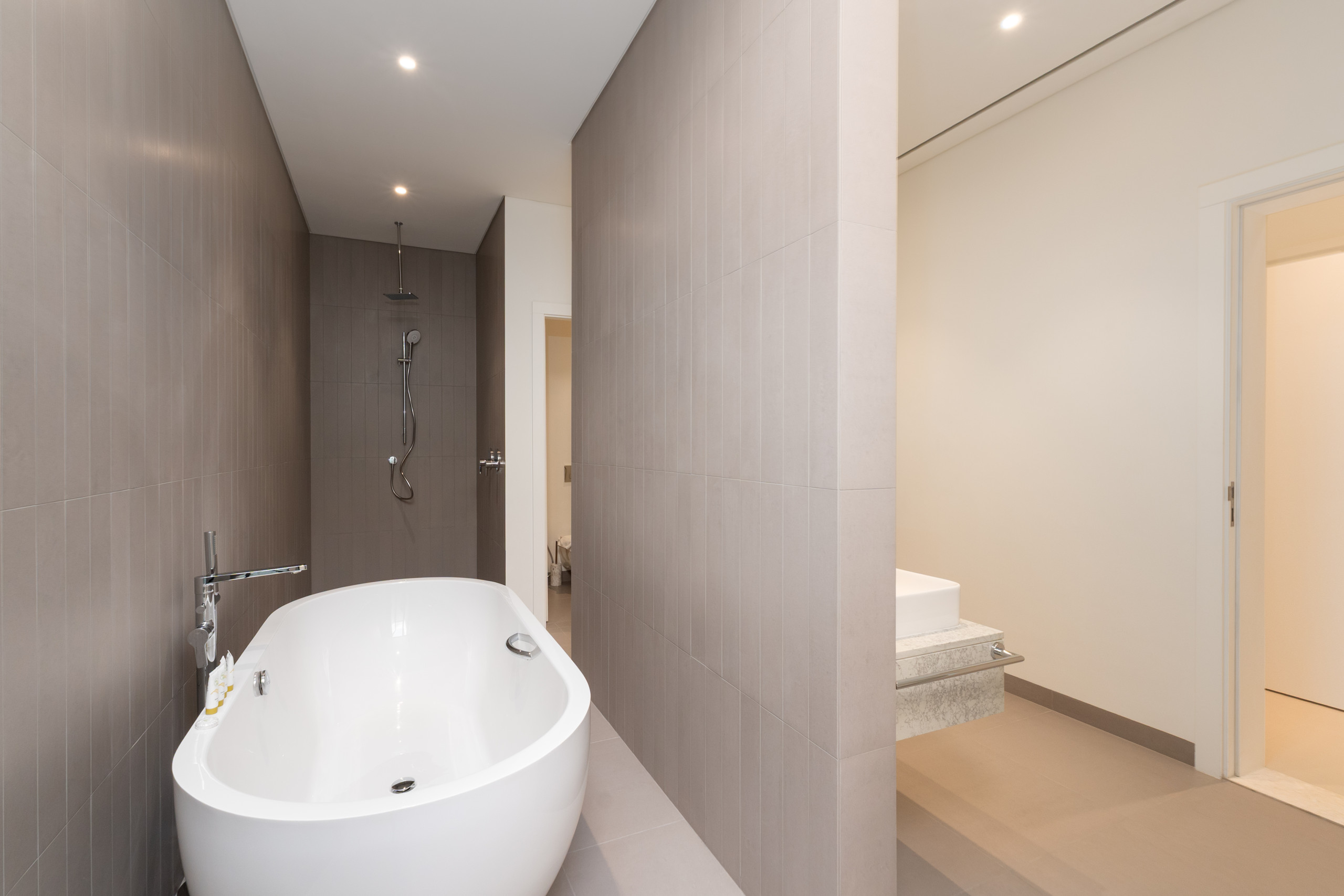 The bedroom has a quiet, understated feel. A four-poster king bed anchors the space, with a brown leather bench at the foot and a simple wooden side table close by. You’ve got large sliding doors that open to the terrace, giving you direct sea views without even leaving bed. A roomy wardrobe takes care of storage, and the ensuite has double sinks and a standalone tub that’s perfect after a long day.